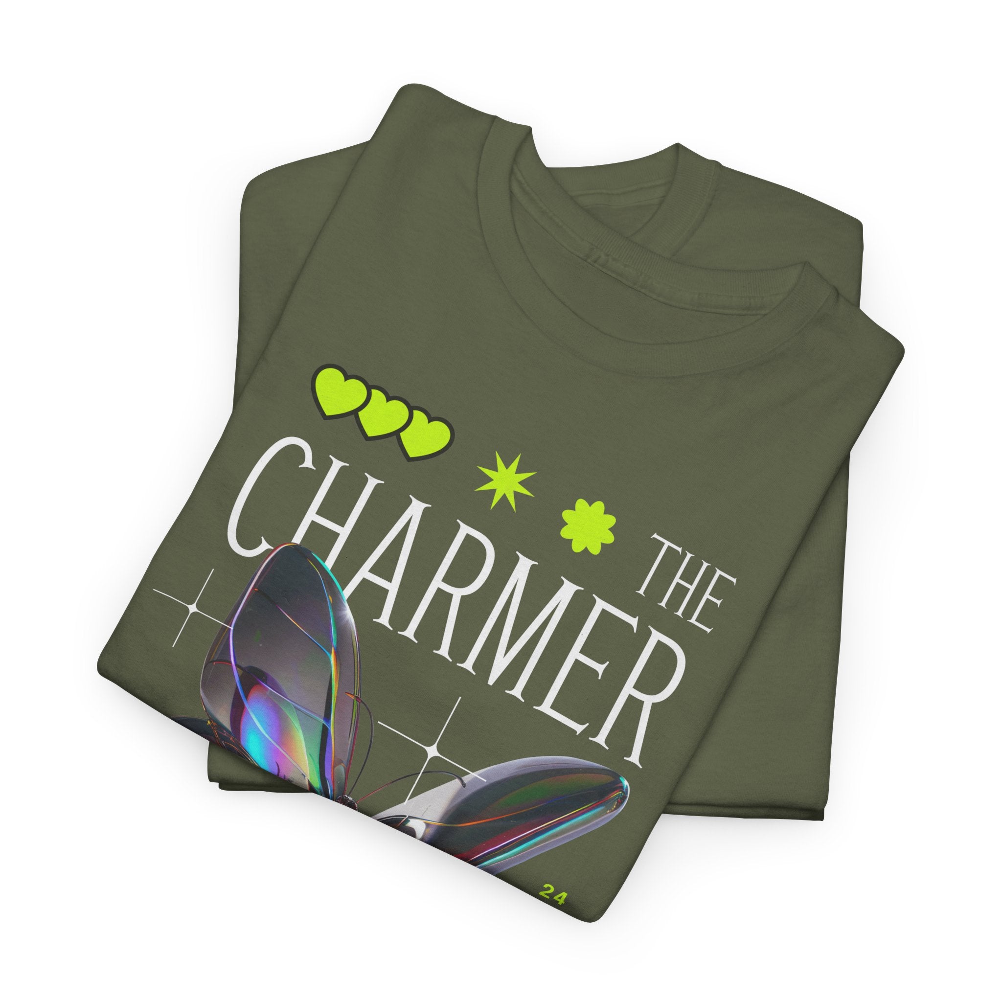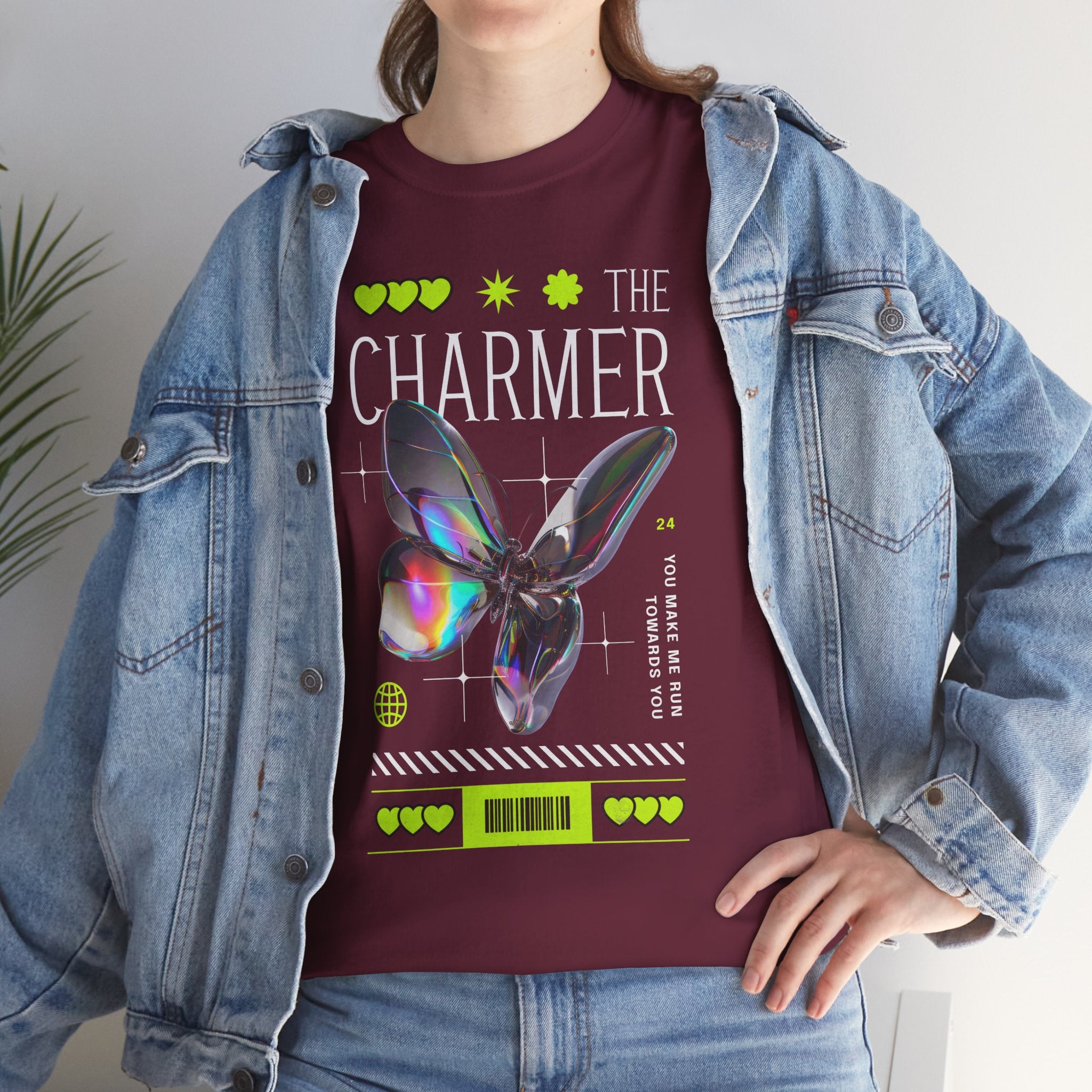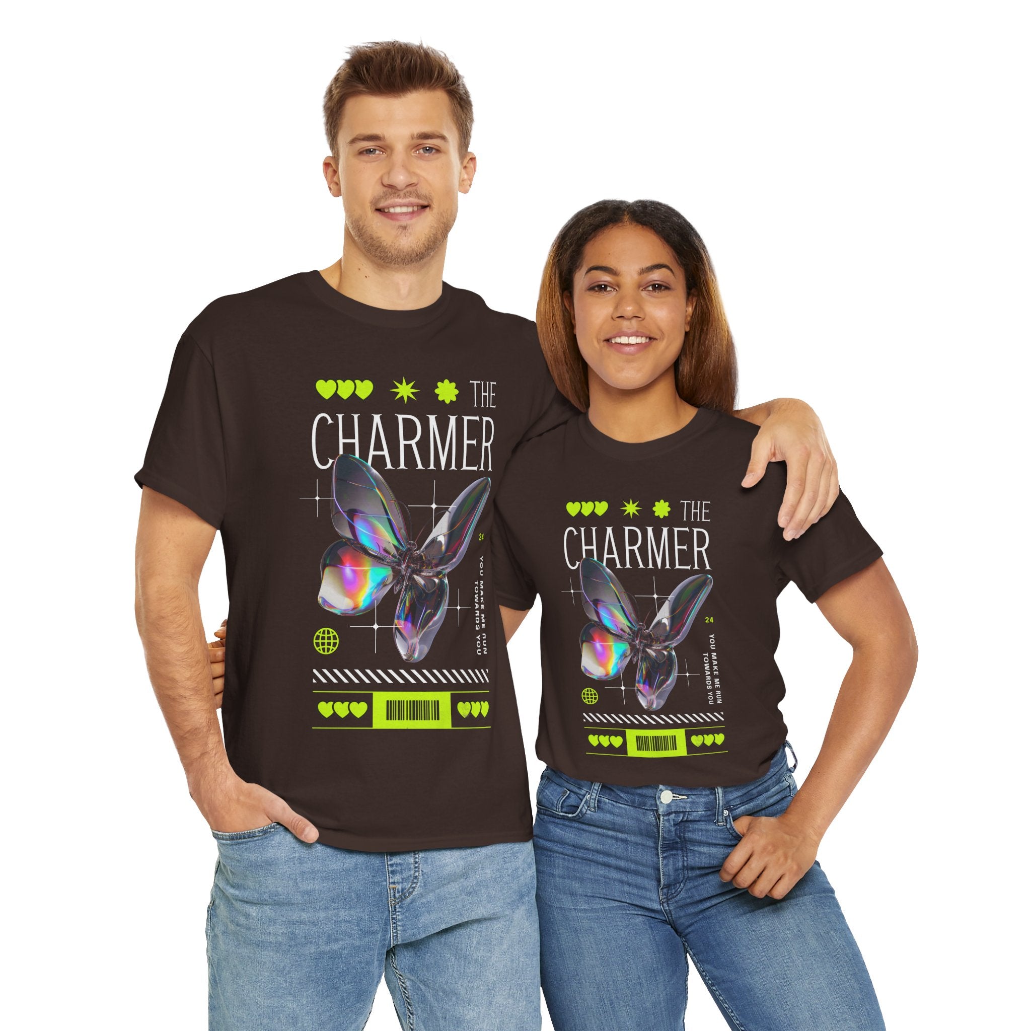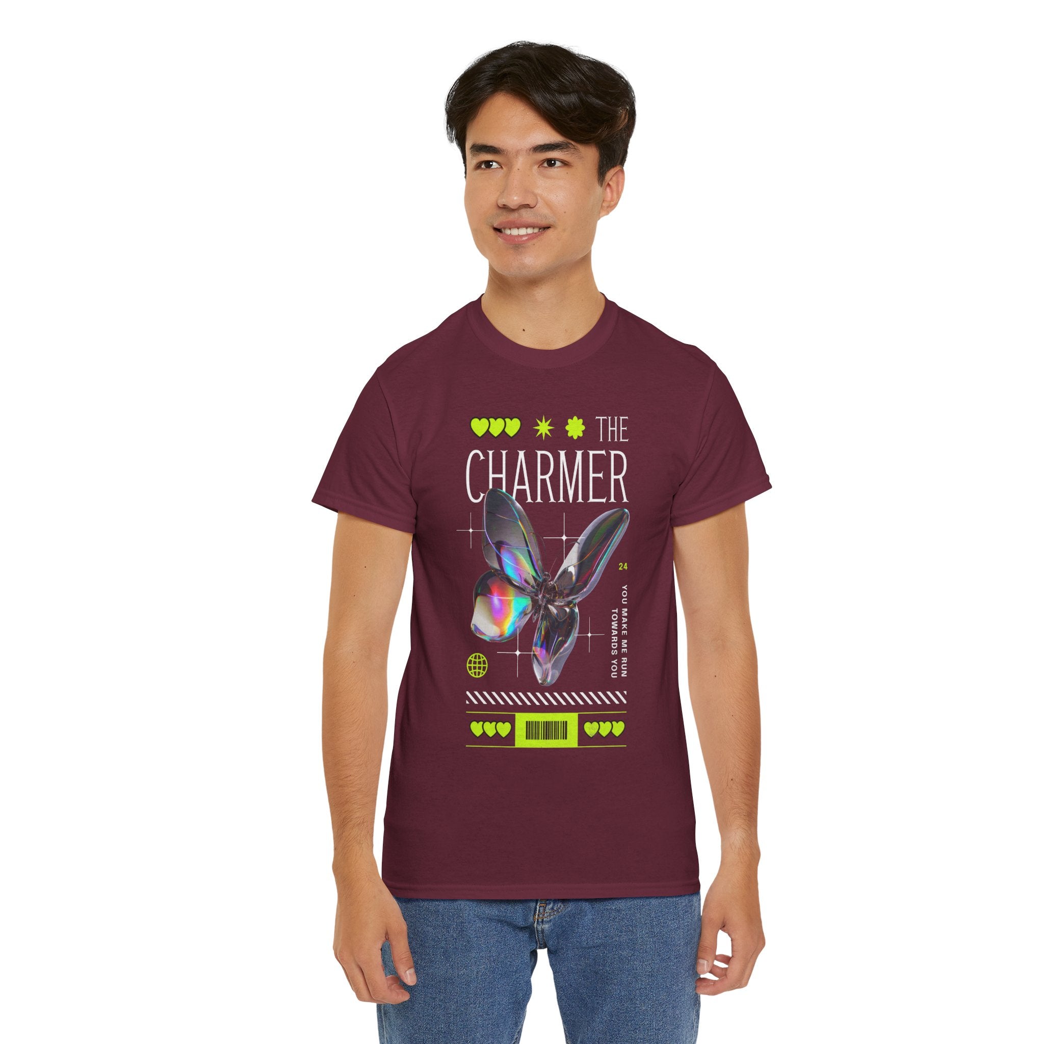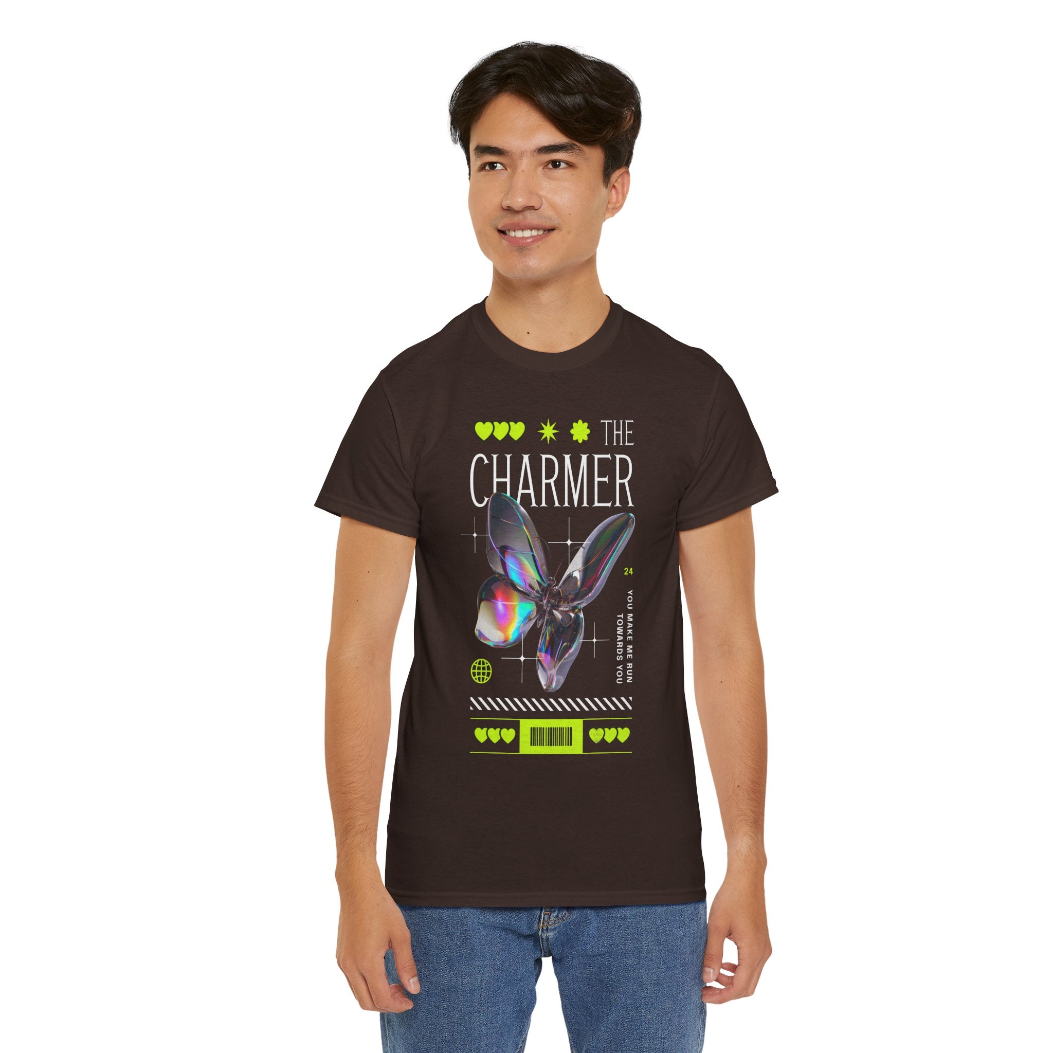 Step into the spotlight with The Charmer Unisex Heavy Cotton Tee — a bold fusion of cyber aesthetic, neon accents, and iridescent butterfly art. This shirt is designed for those who crave fashion that’s both eye-catching and meaningful.