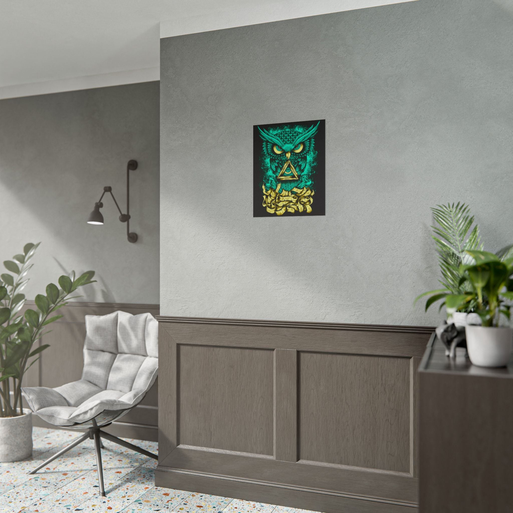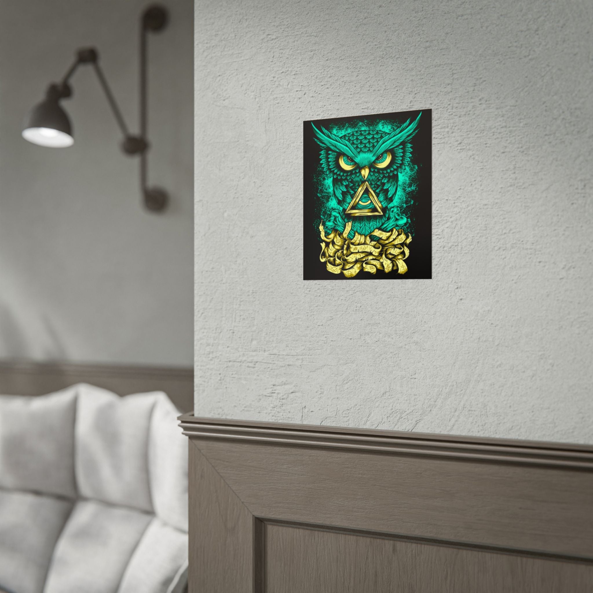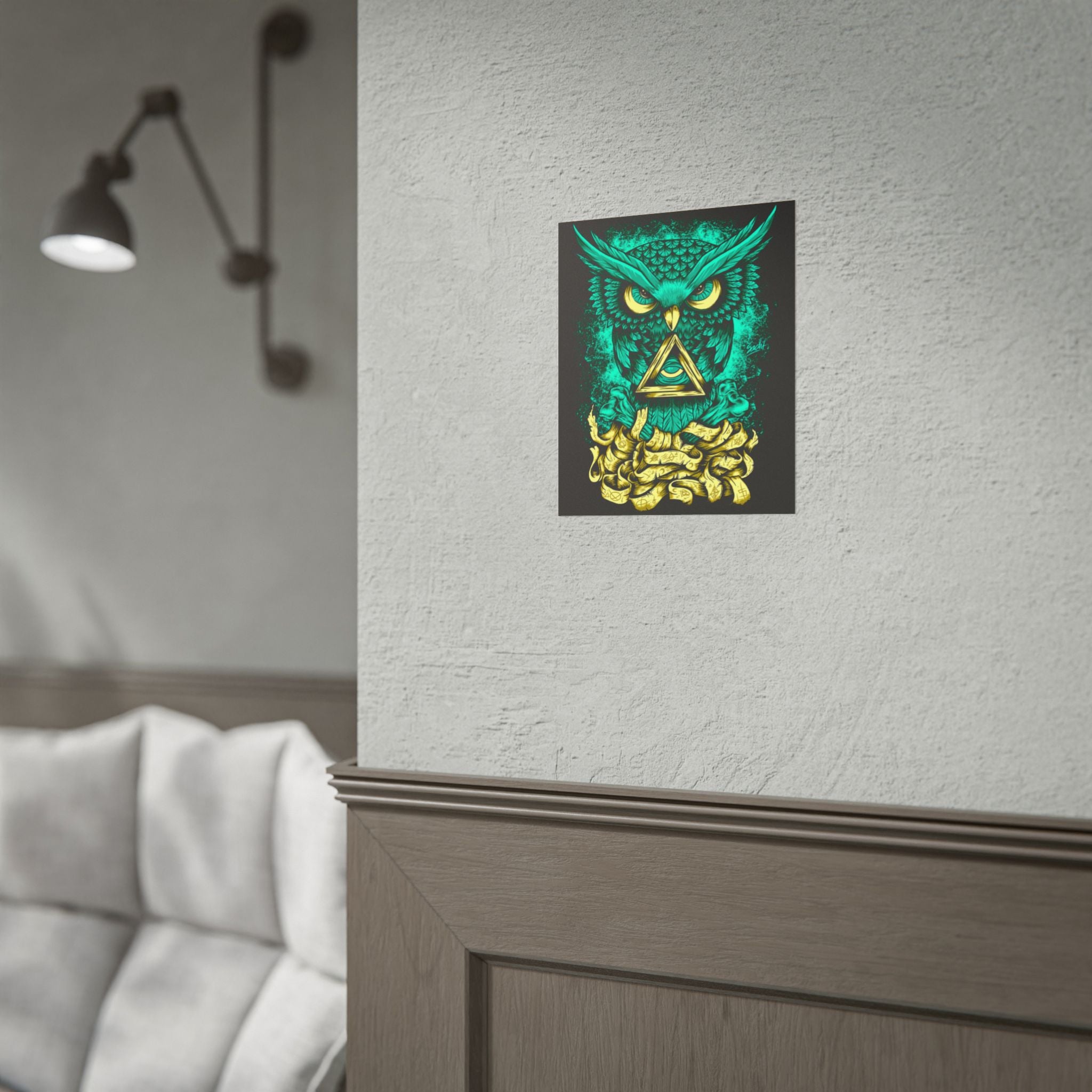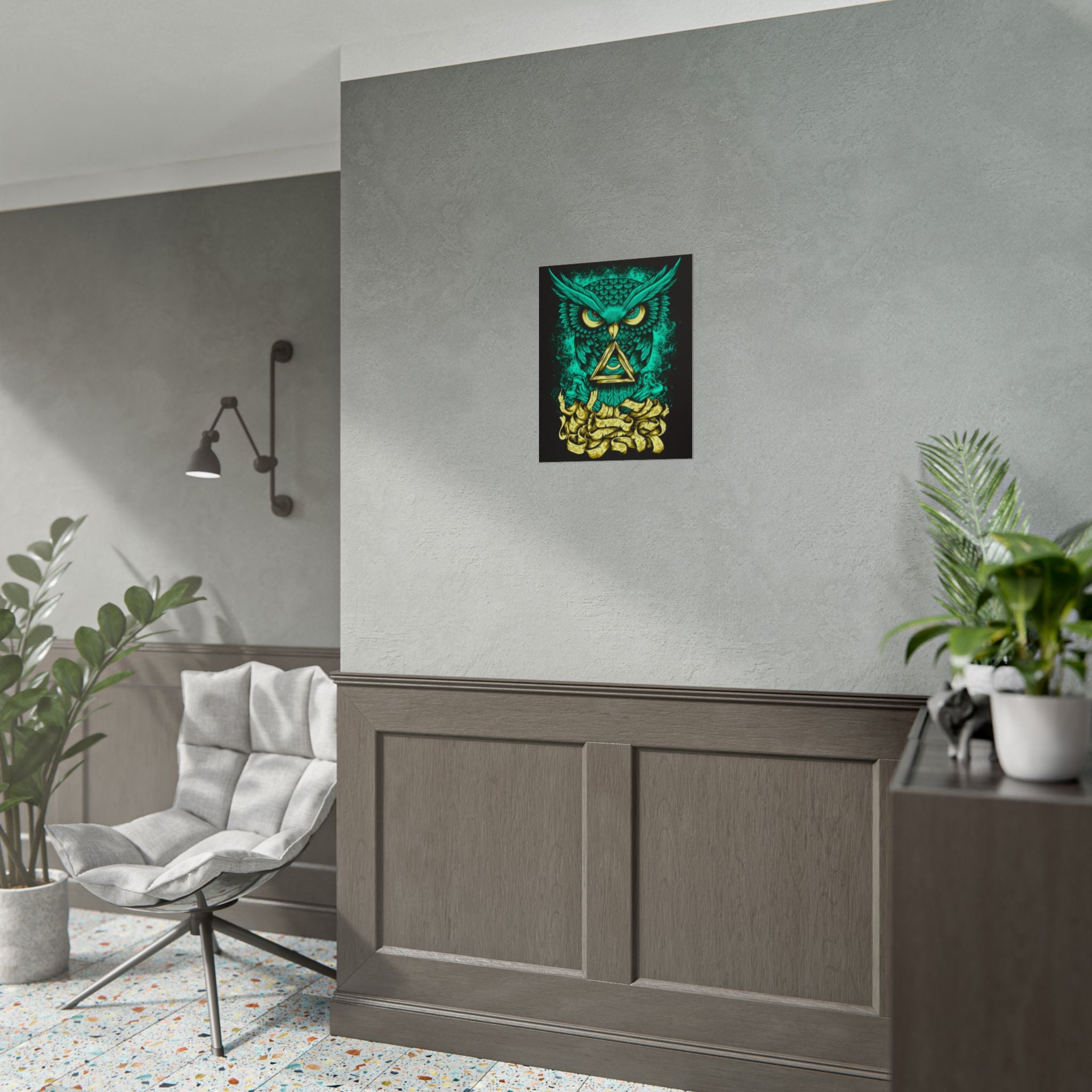 Bring higher awareness and luminous energy into your space with The Watcher Owl Poster, a captivating fusion of mystic geometry, wisdom, and modern design.