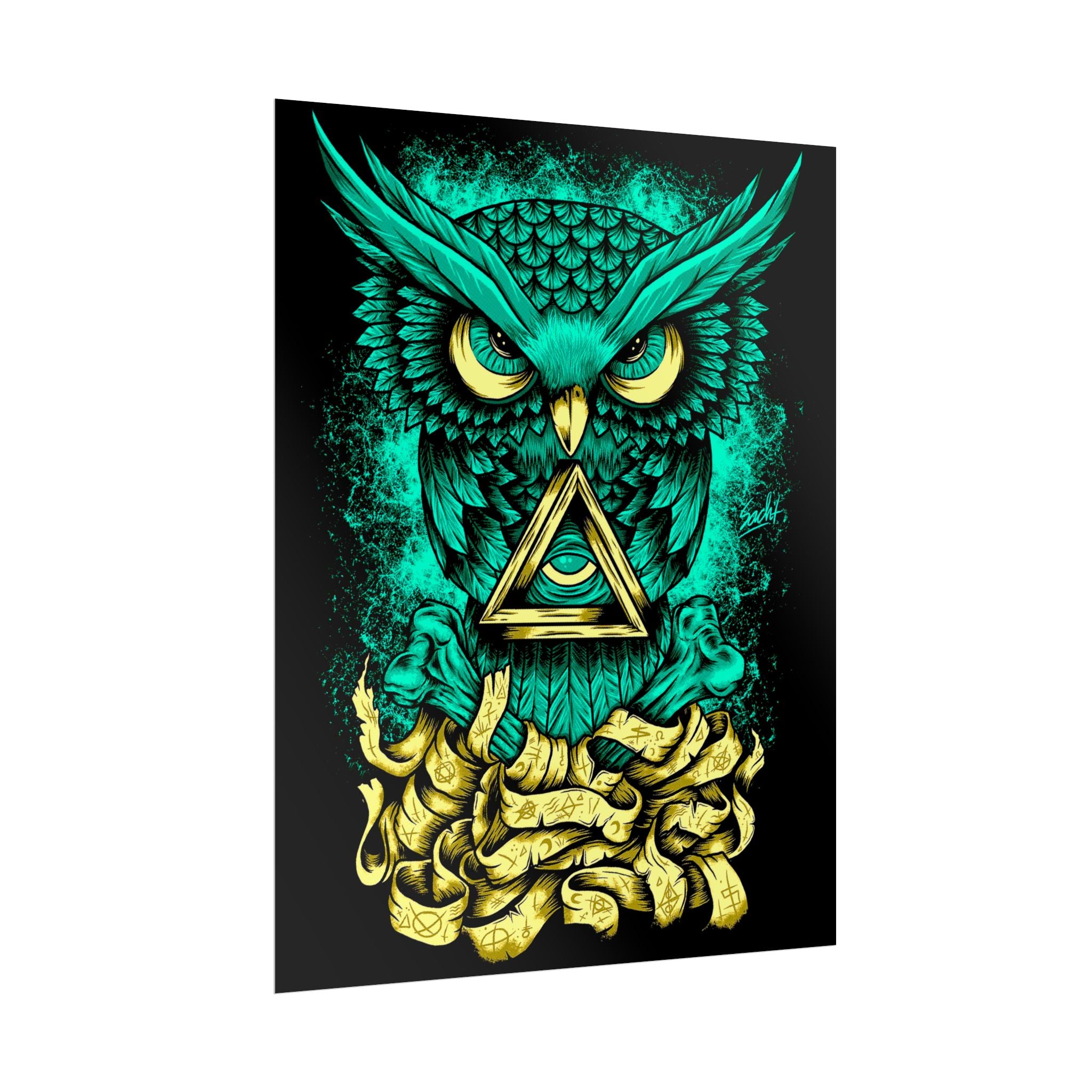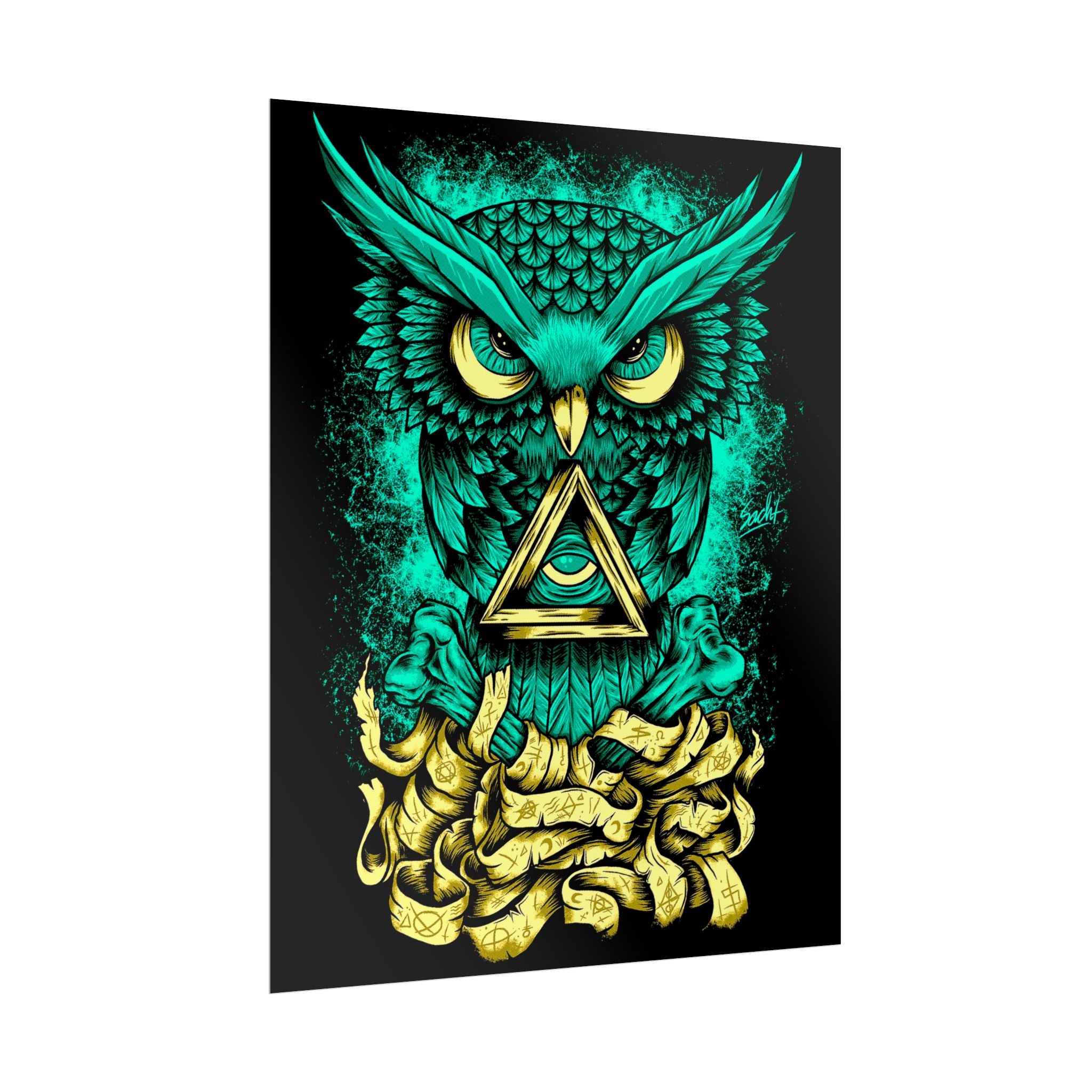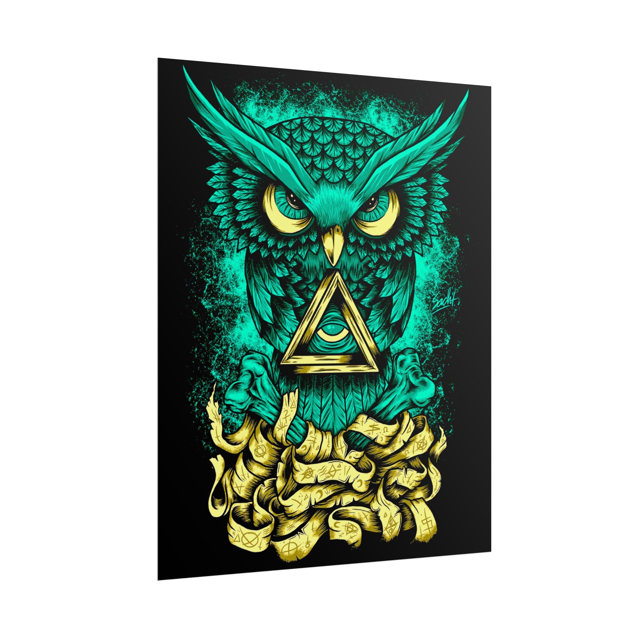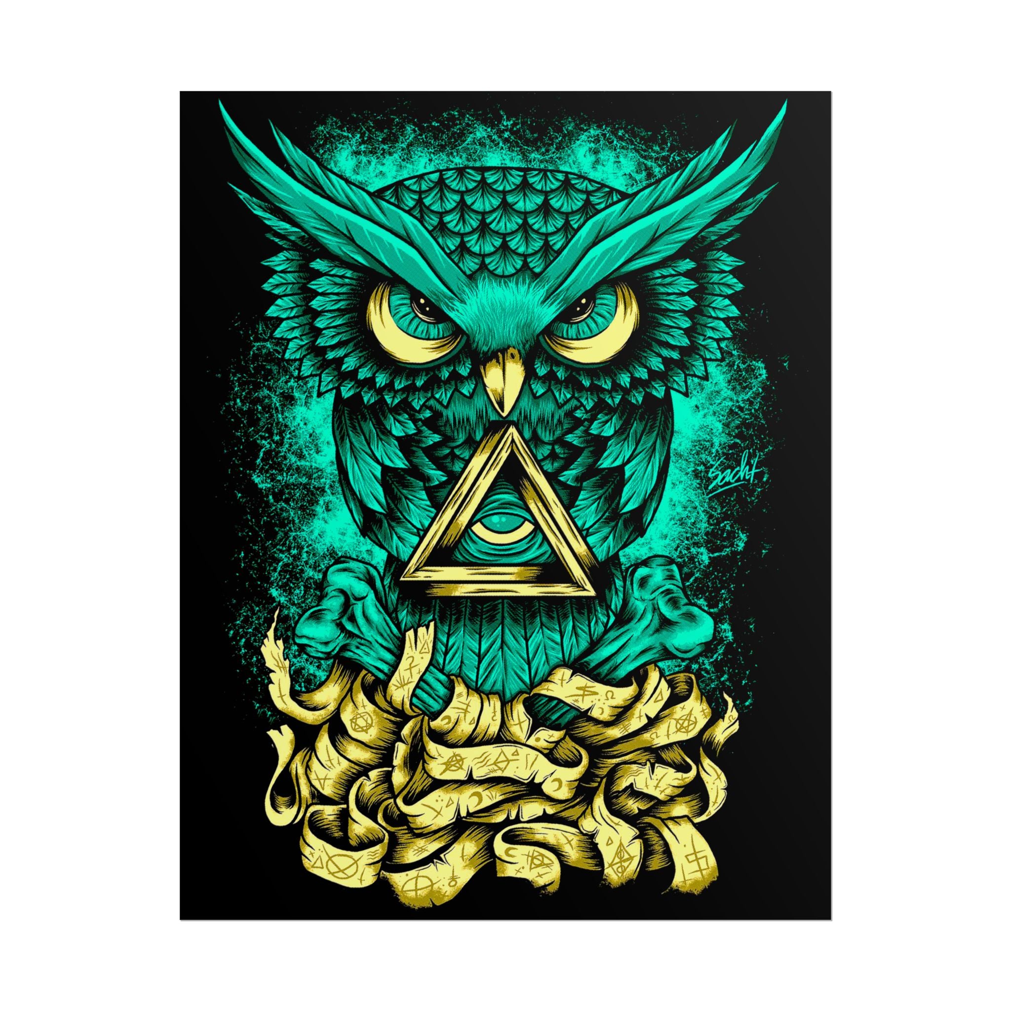 This glowing teal and gold owl β poised over ancient scrolls β symbolizes intuition, observation, and clarity. The triangle within its chest radiates enlightenment and insight, making it the perfect art piece for creative studios, home offices, and meditative spaces.