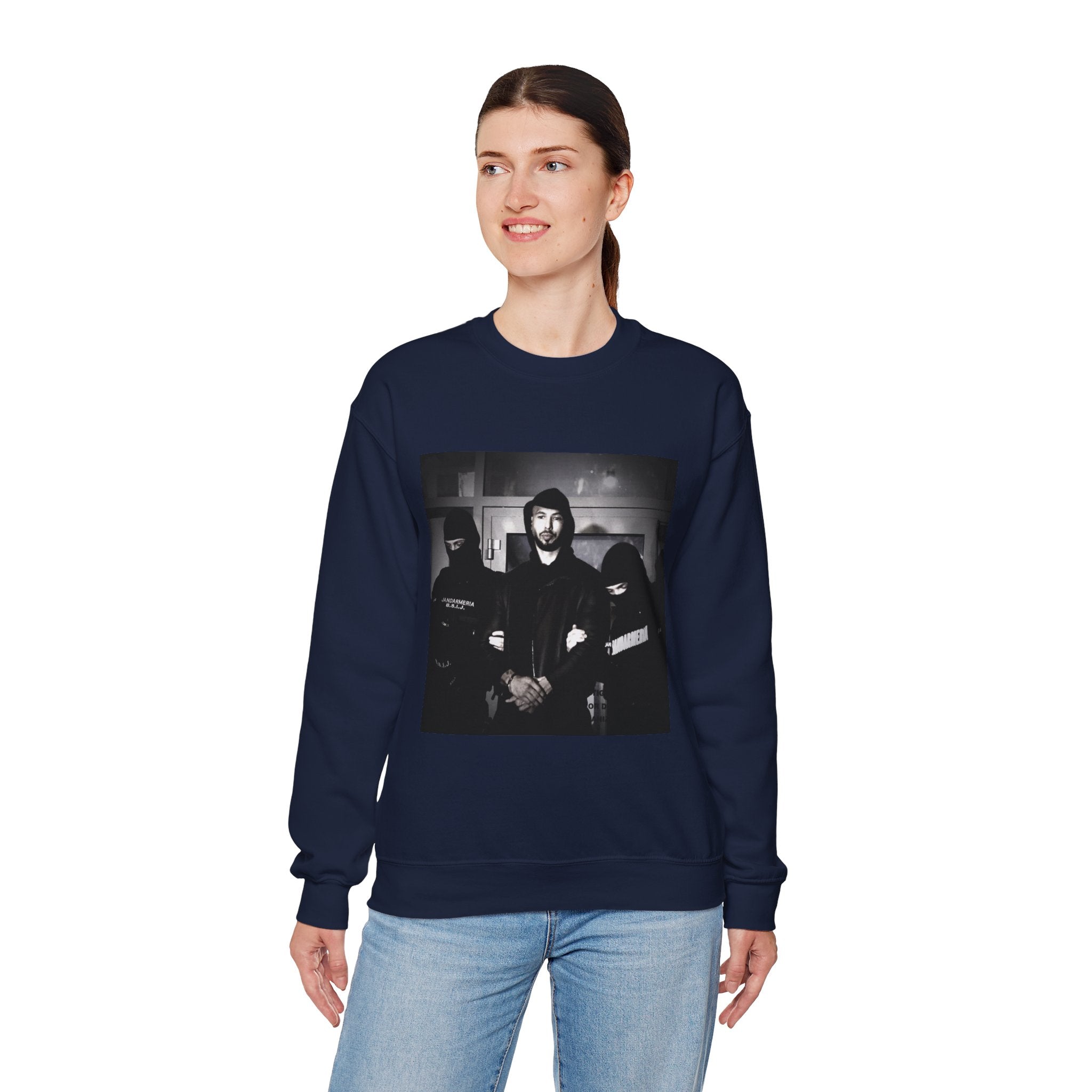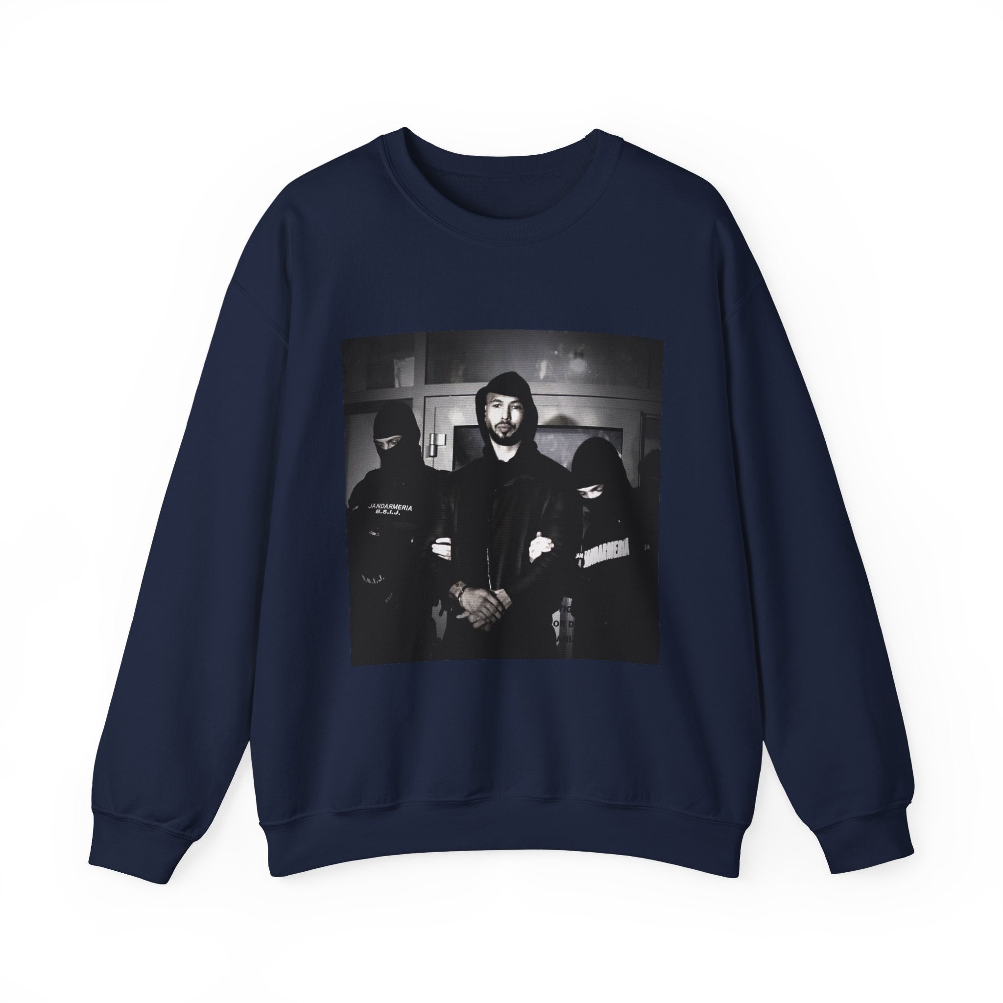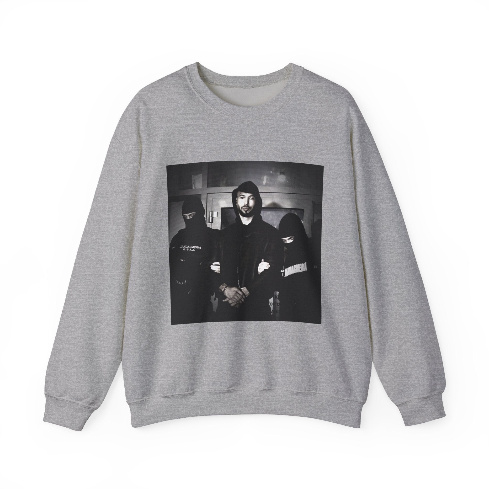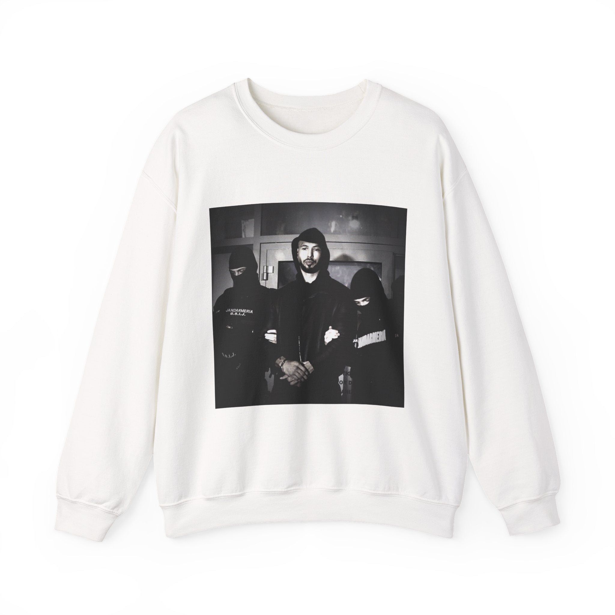 Level up your streetwear with the Unisex Andrew Tate Crewneck Sweatshirt. Featuring a striking black-and-white arrest graphic, this sweatshirt symbolizes resilience, ambition, and the never-quit mentality.
