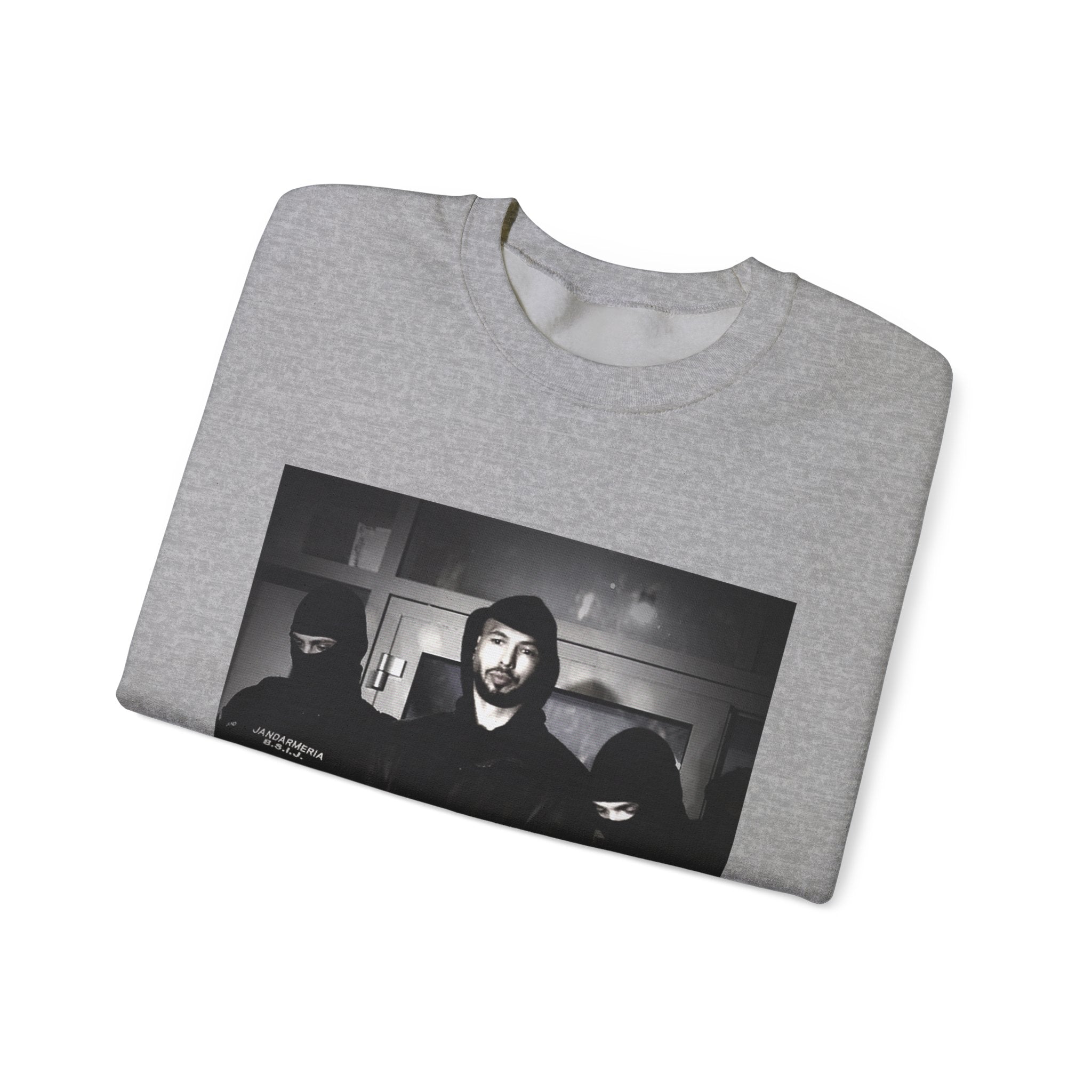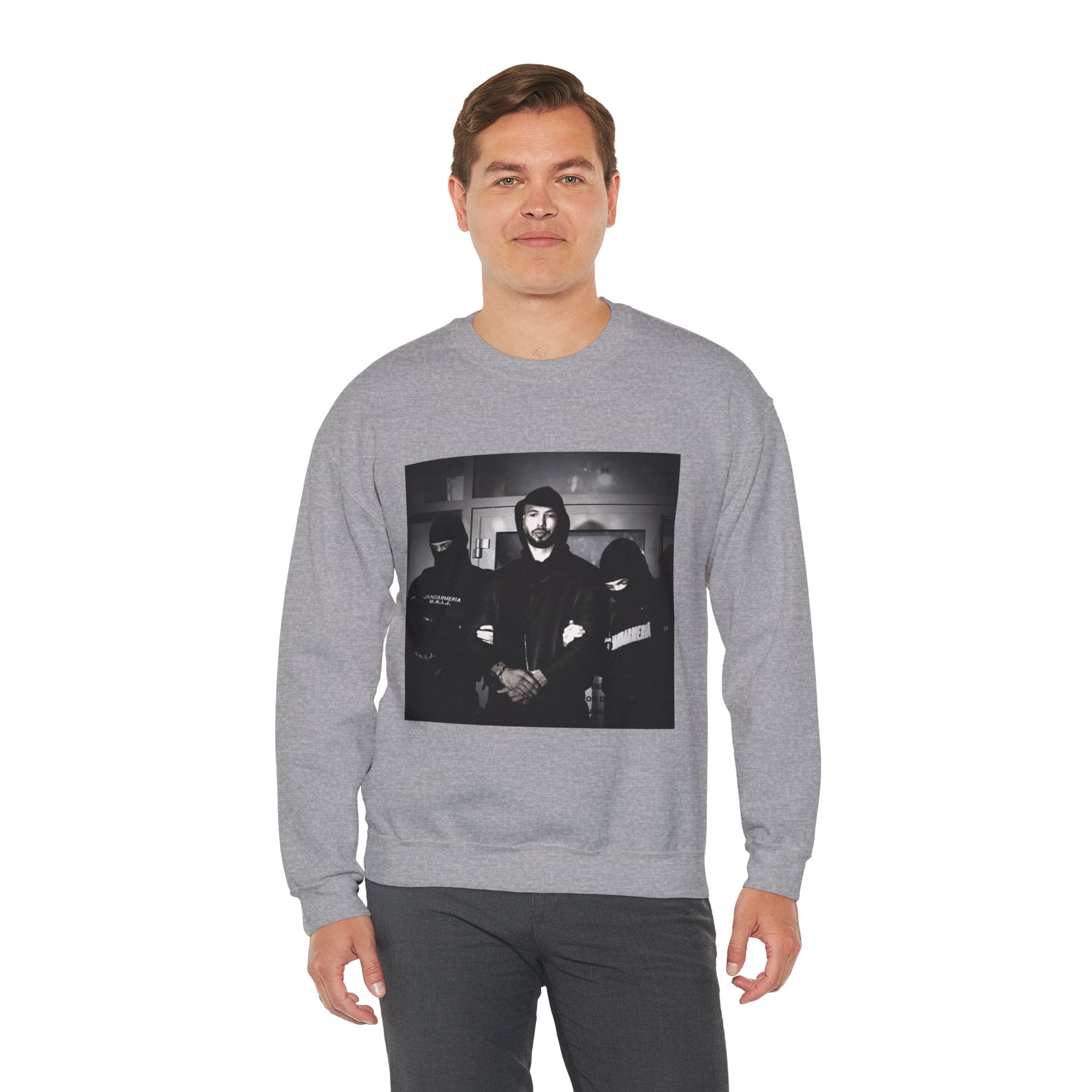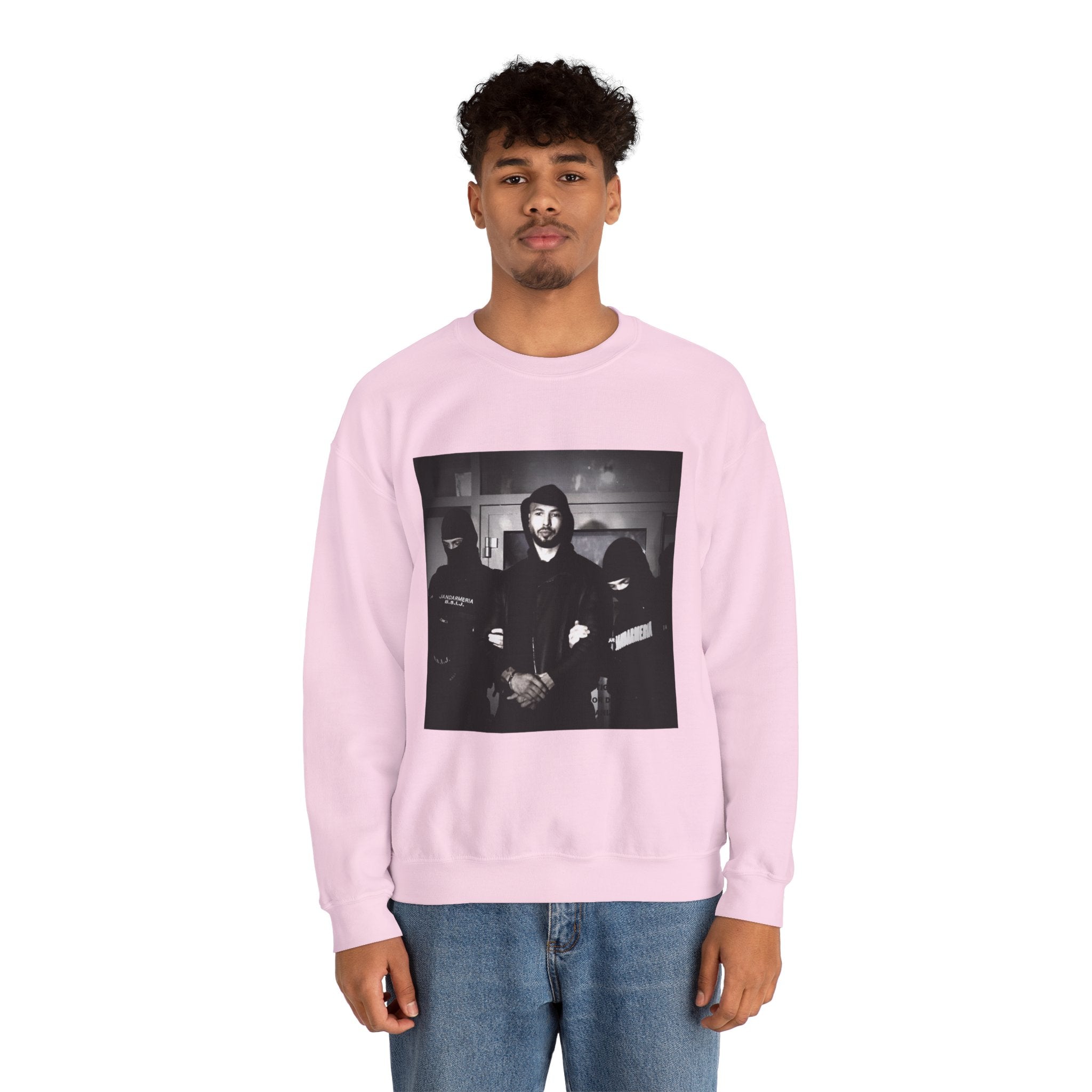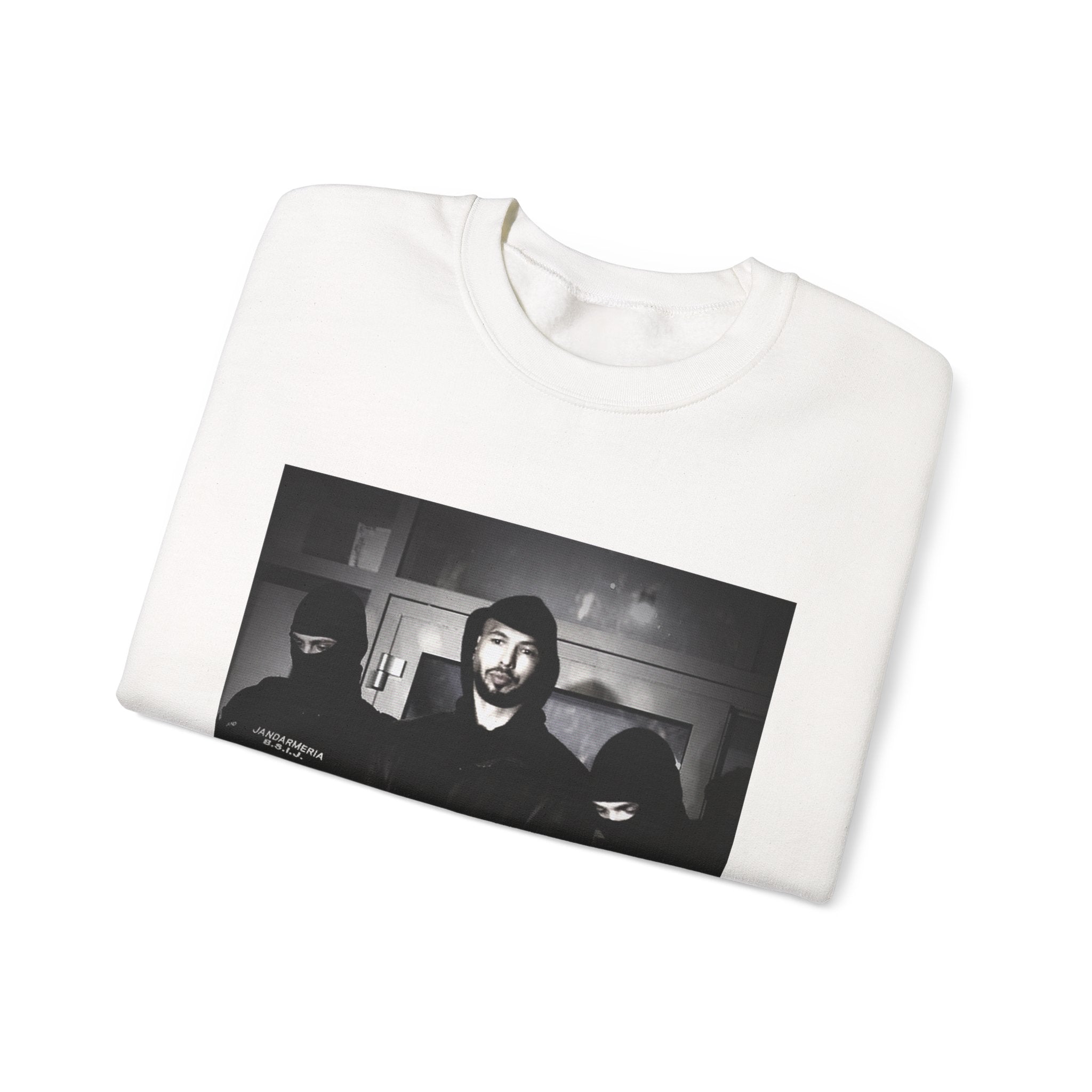 Level up your streetwear with the Unisex Andrew Tate Crewneck Sweatshirt. Featuring a striking black-and-white arrest graphic, this sweatshirt symbolizes resilience, ambition, and the never-quit mentality.