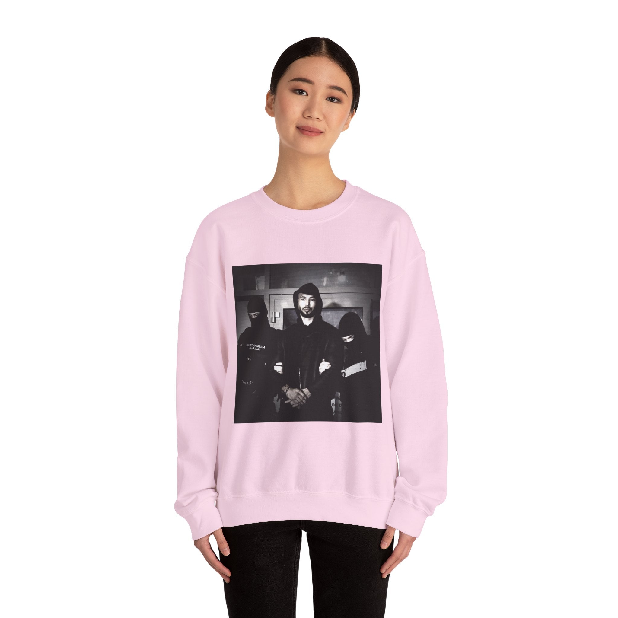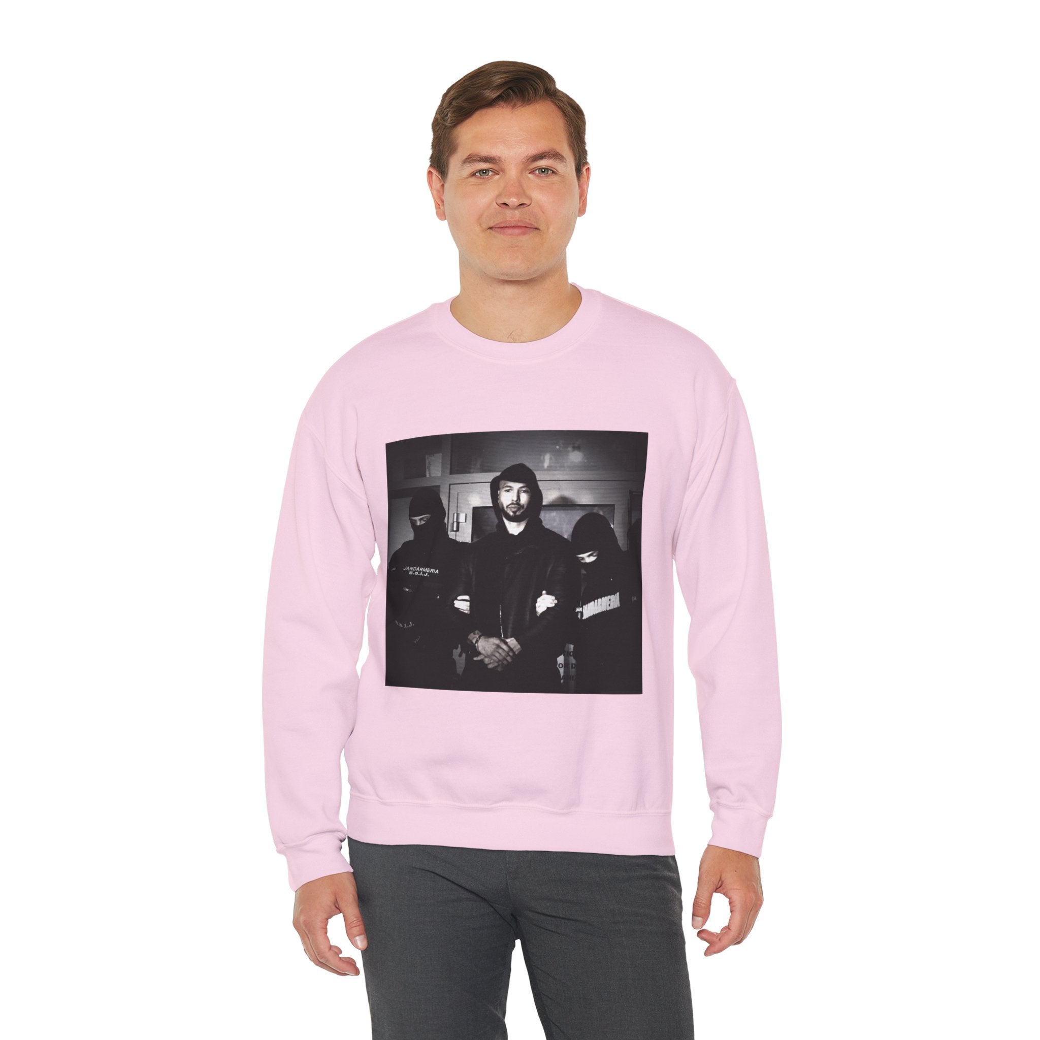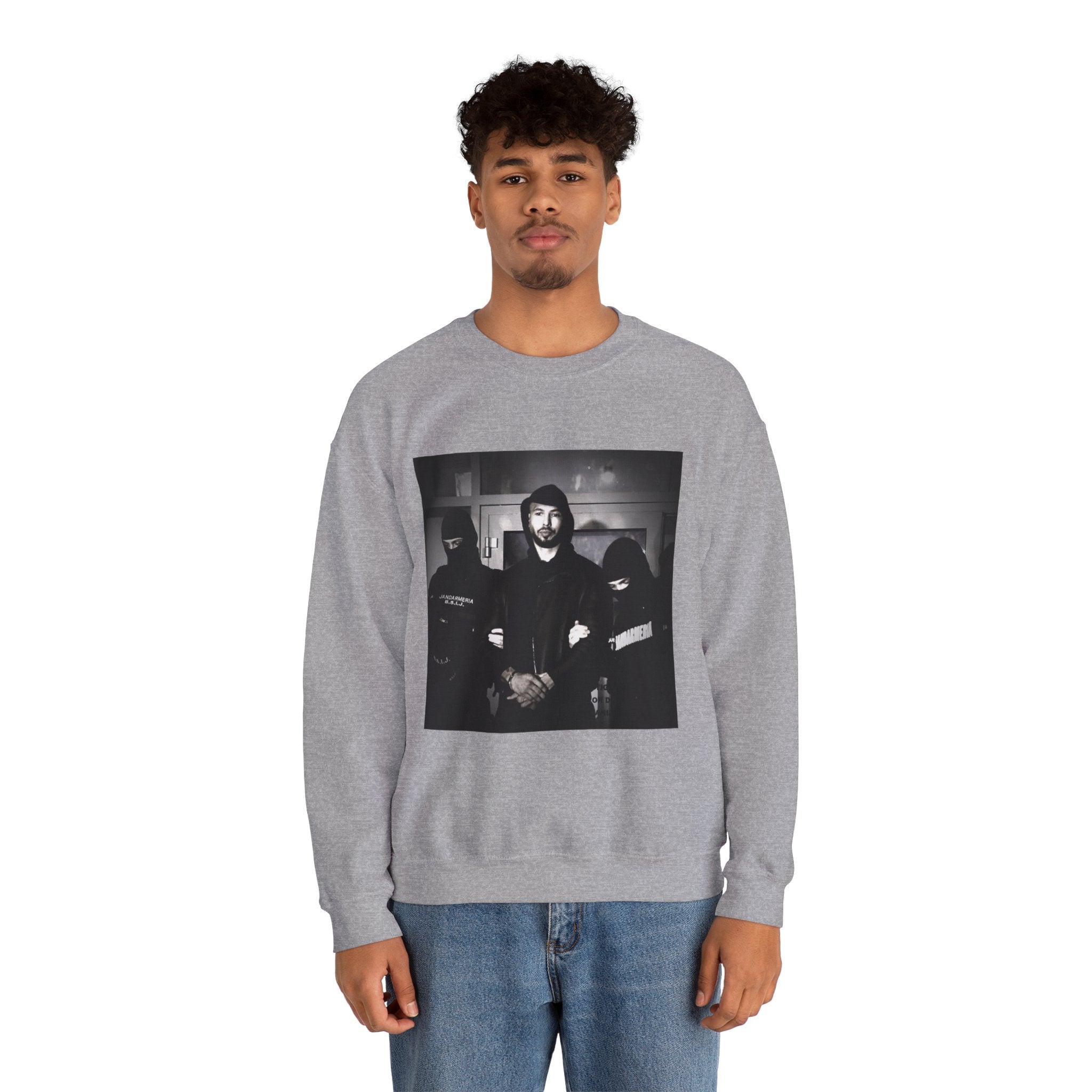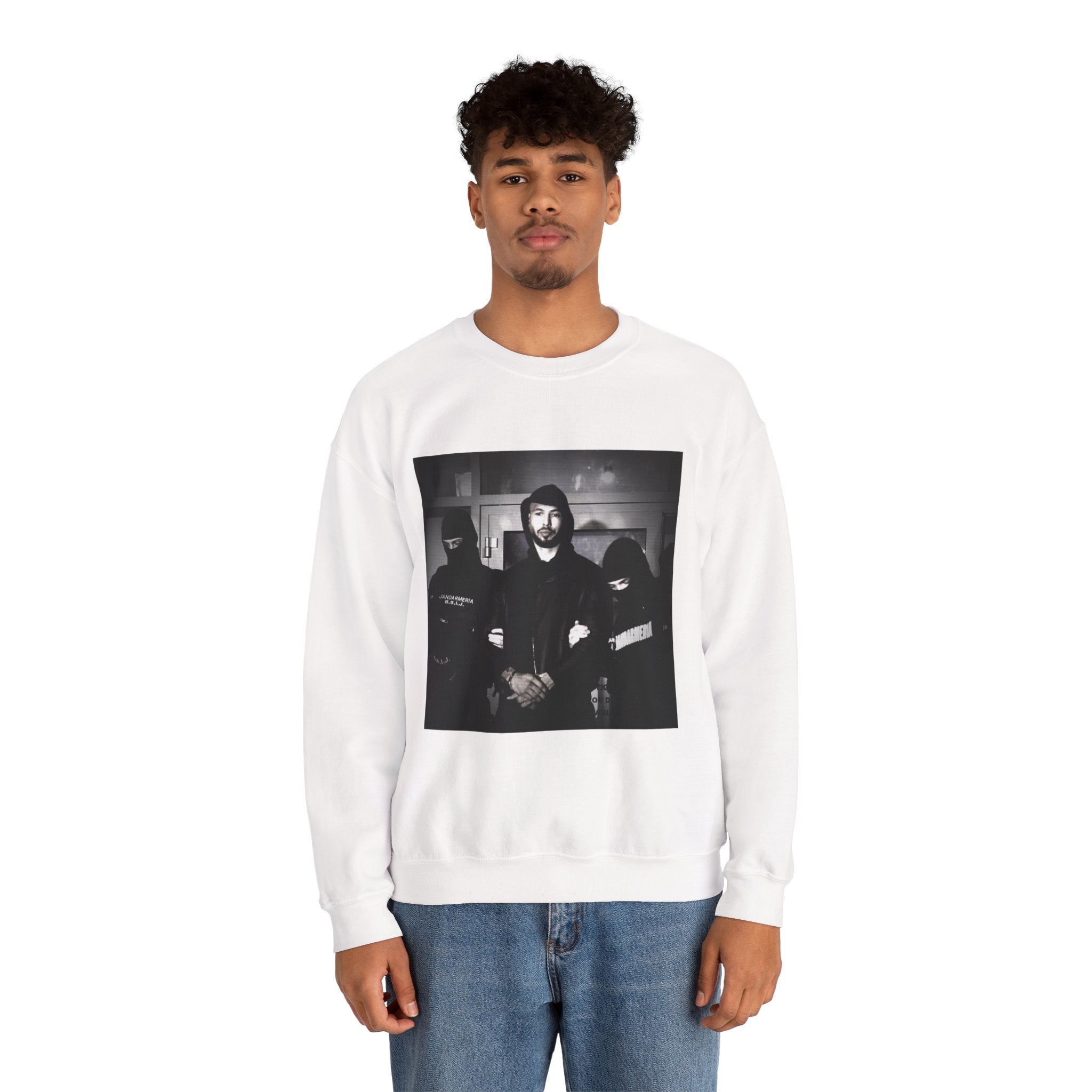 Level up your streetwear with the Unisex Andrew Tate Crewneck Sweatshirt. Featuring a striking black-and-white arrest graphic, this sweatshirt symbolizes resilience, ambition, and the never-quit mentality.