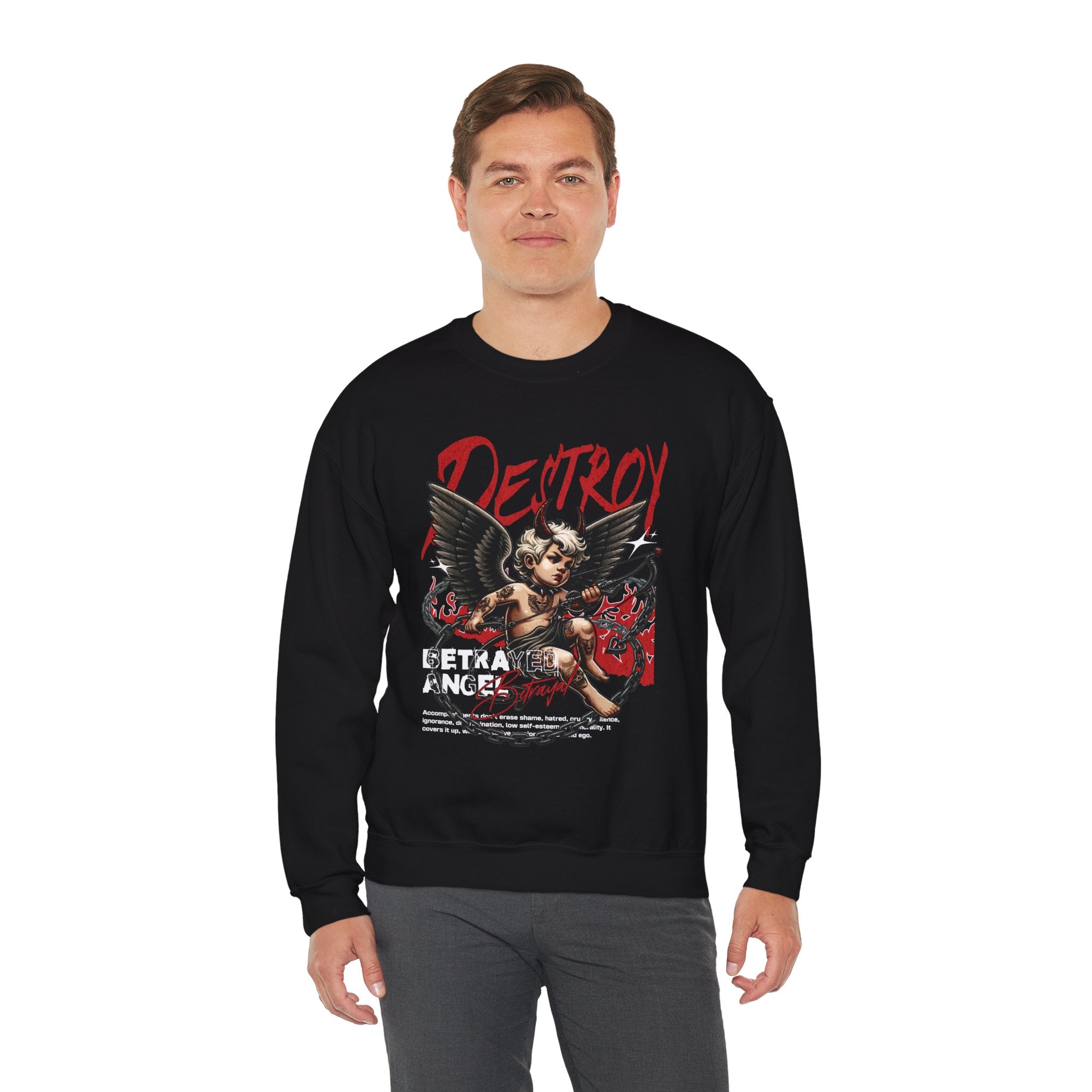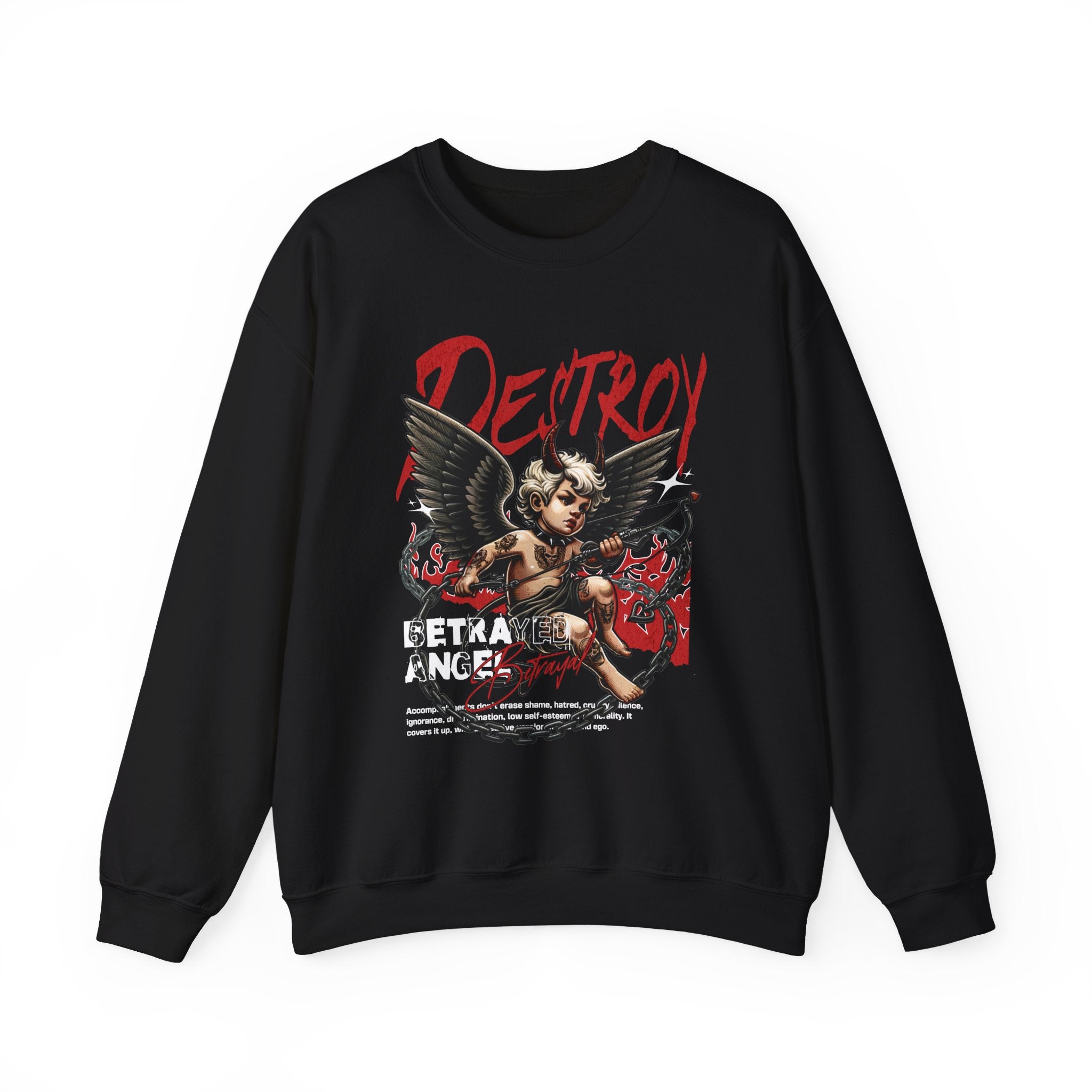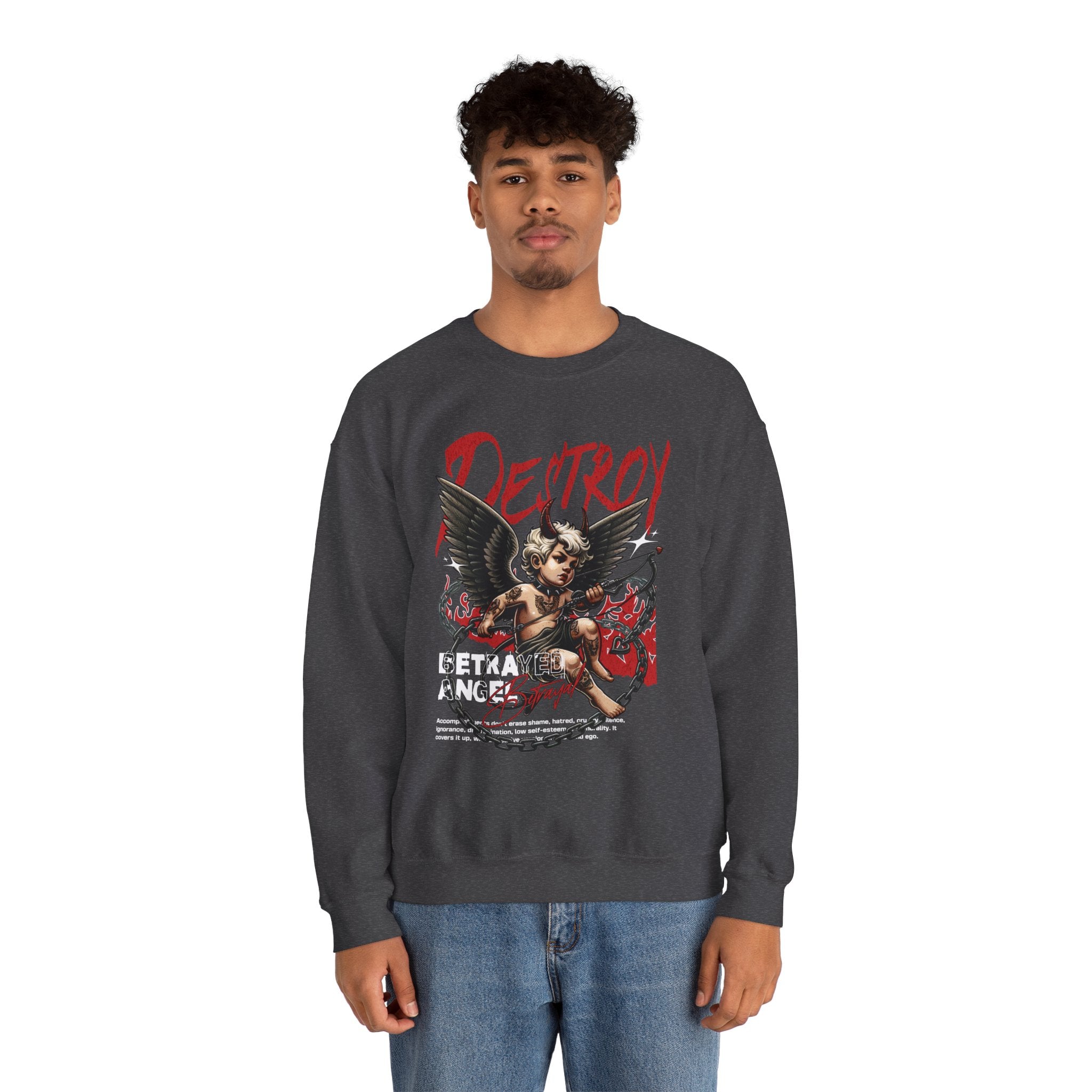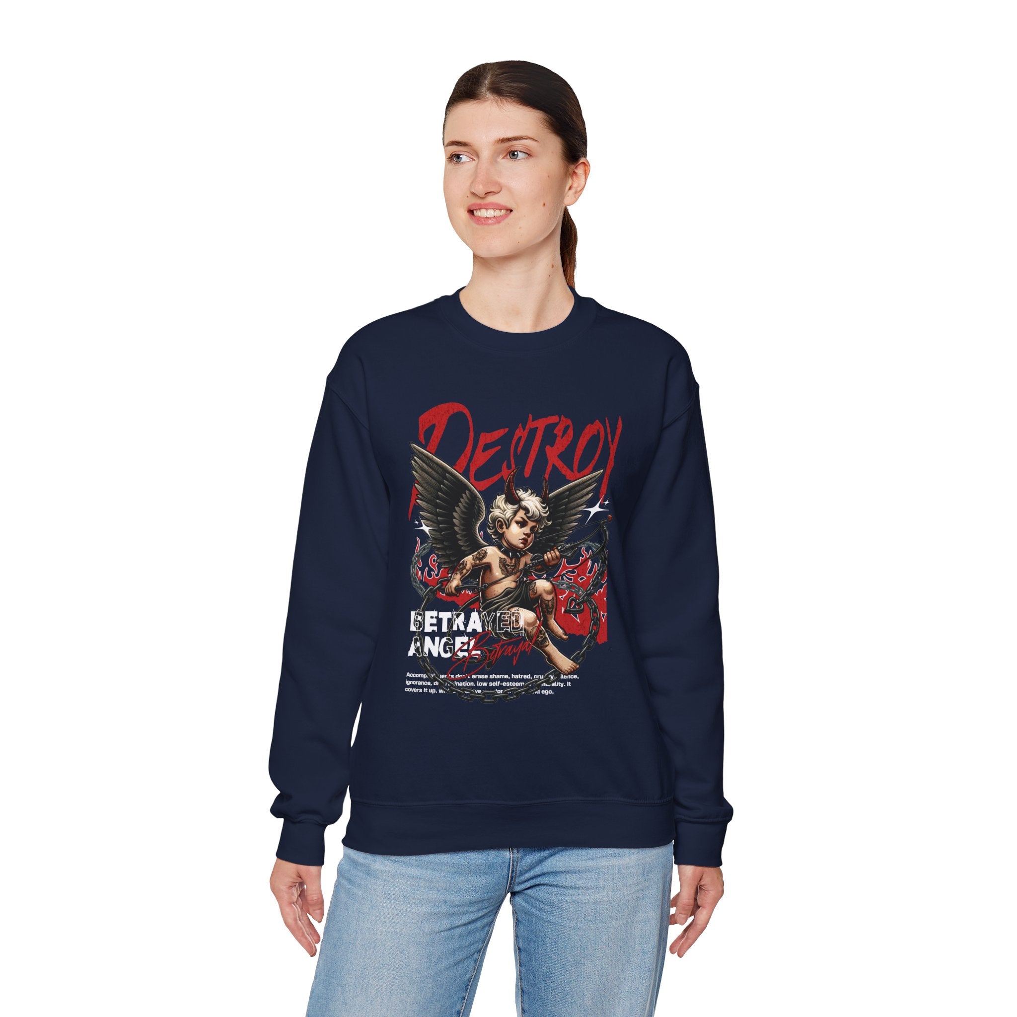 This Unisex Heavy Blend™ Crewneck Sweatshirt takes the fierce Betrayed Angel Destroy design and transforms it into a timeless pullover sweatshirt. The bold red DESTROY typography, dark-winged angel, and fiery gothic details symbolize resilience, rebellion, and fearless individuality.