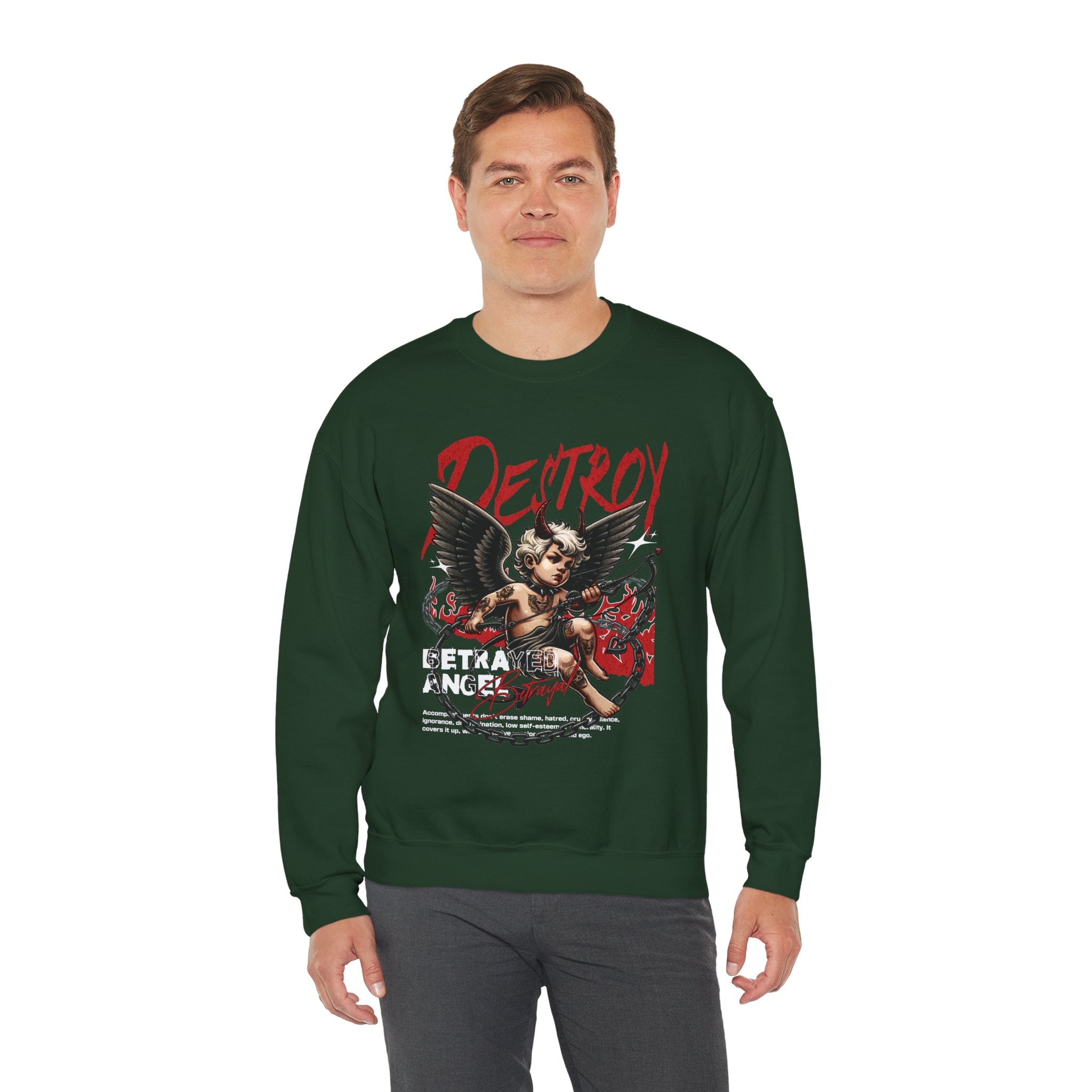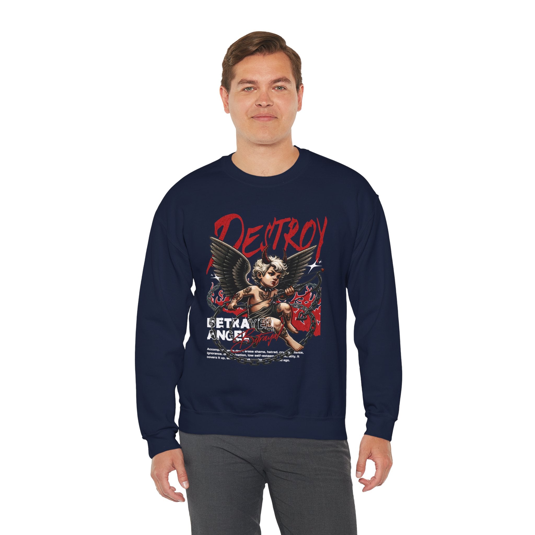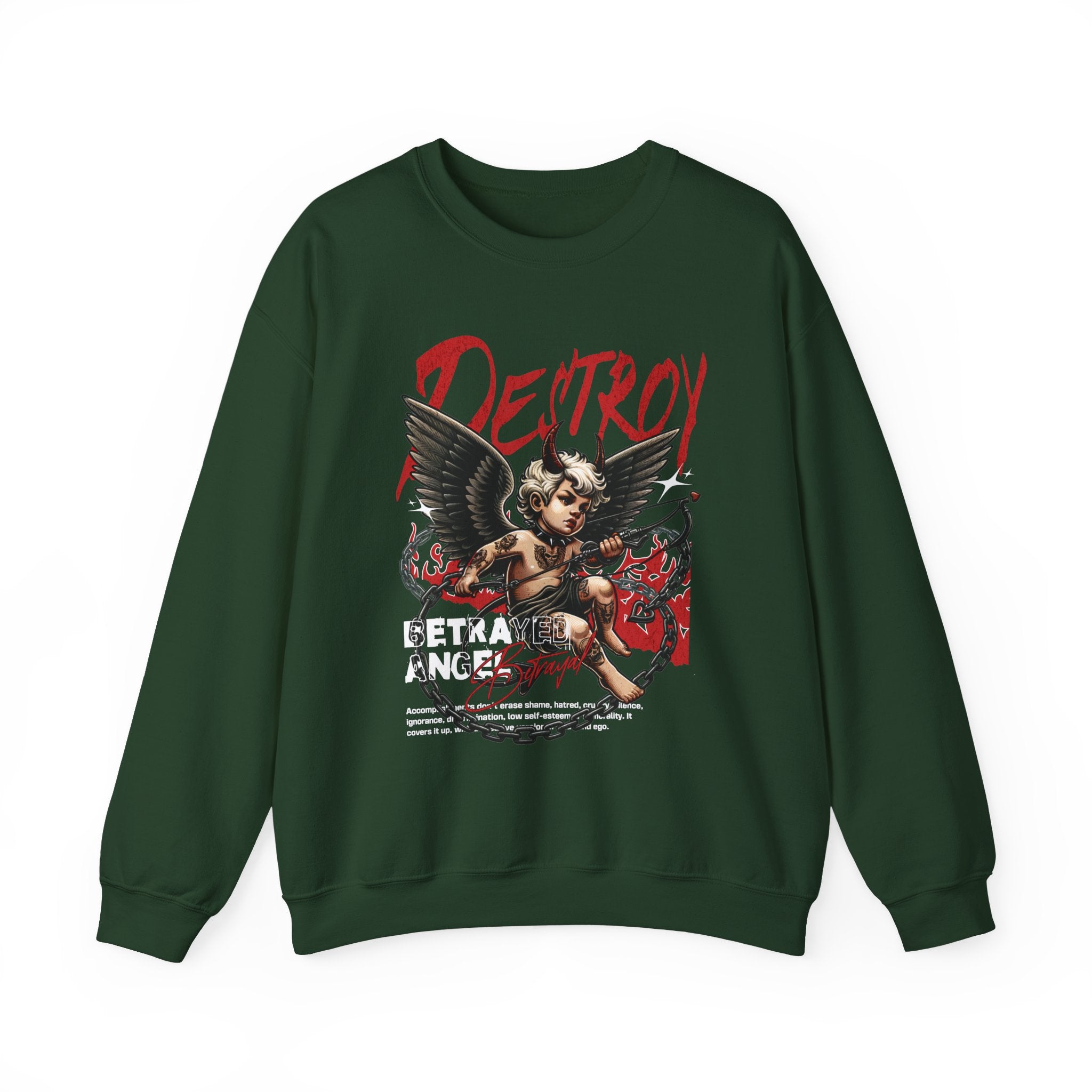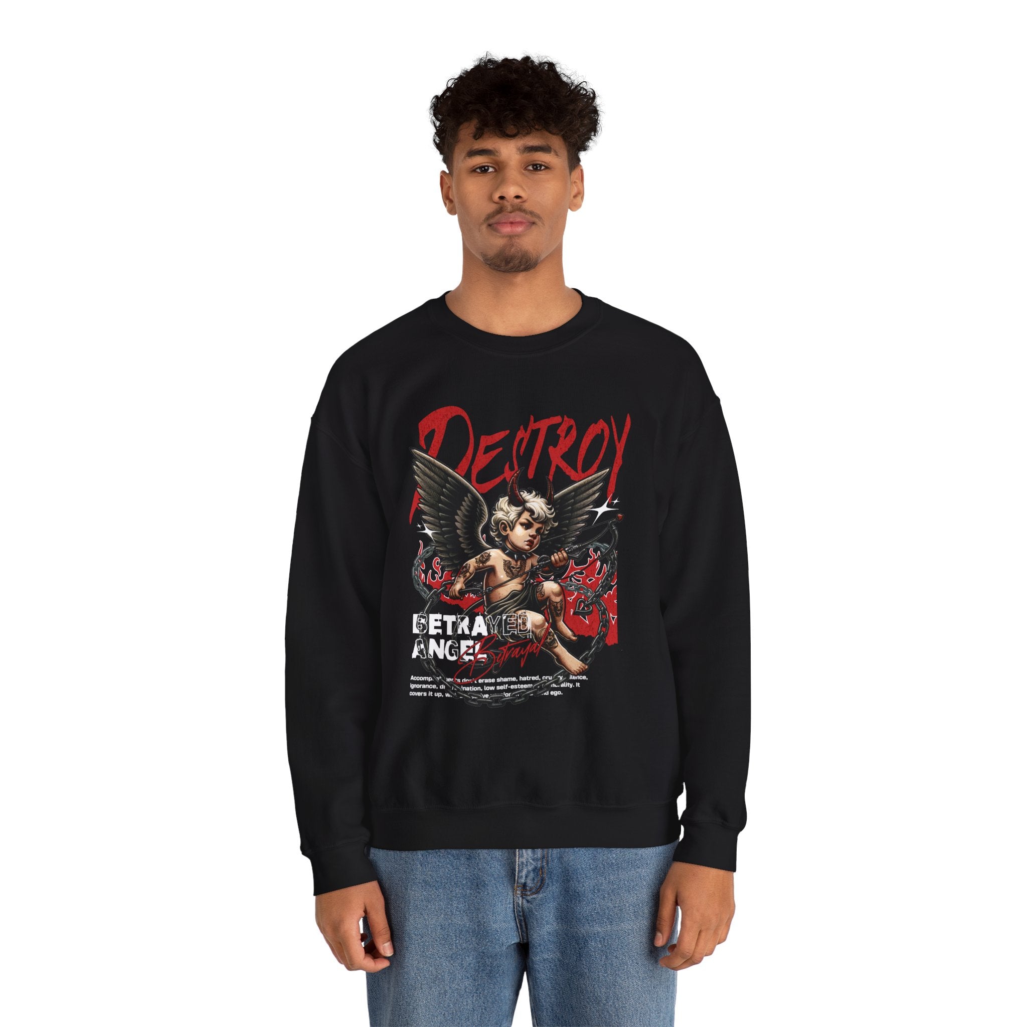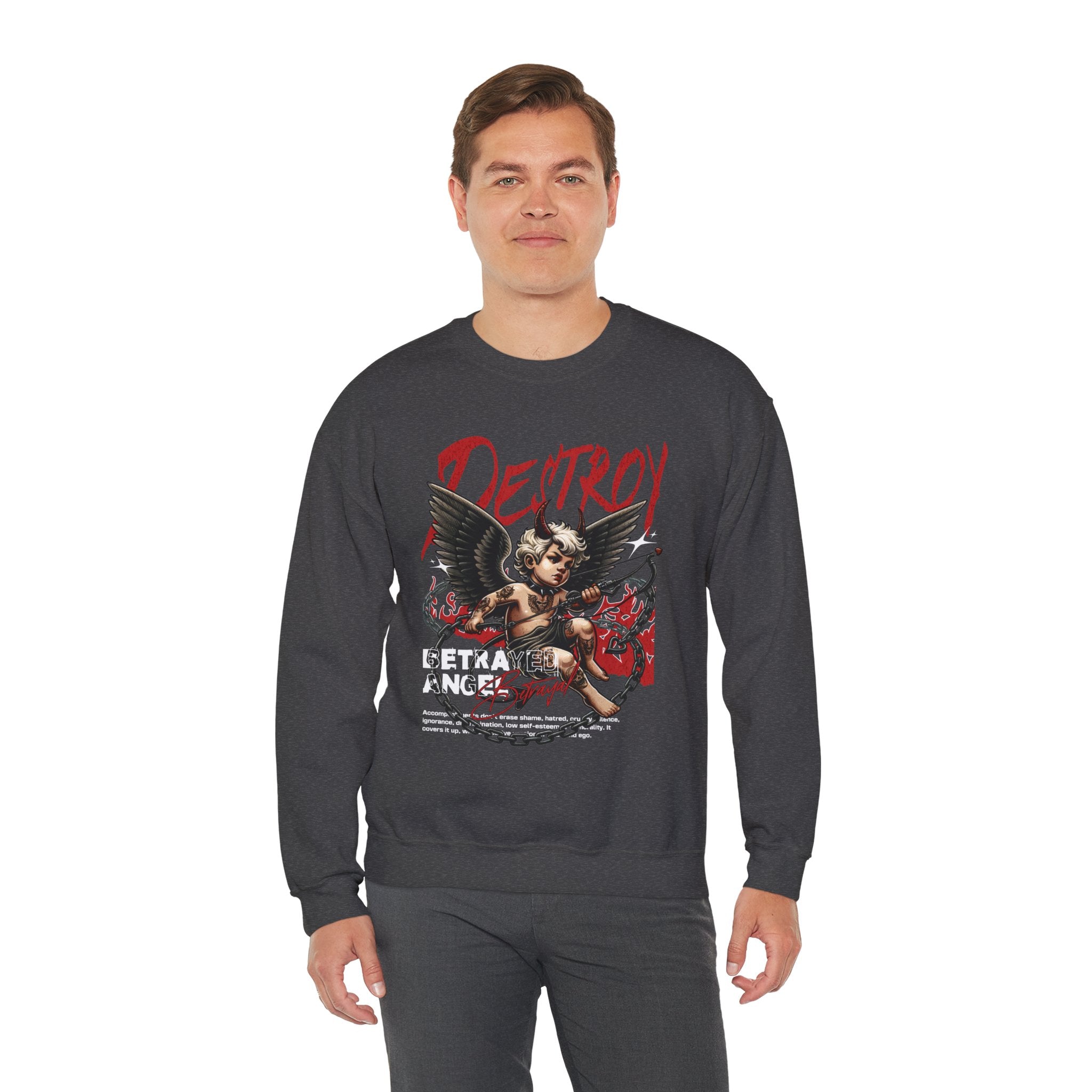 This Unisex Heavy Blend™ Crewneck Sweatshirt takes the fierce Betrayed Angel Destroy design and transforms it into a timeless pullover sweatshirt. The bold red DESTROY typography, dark-winged angel, and fiery gothic details symbolize resilience, rebellion, and fearless individuality.