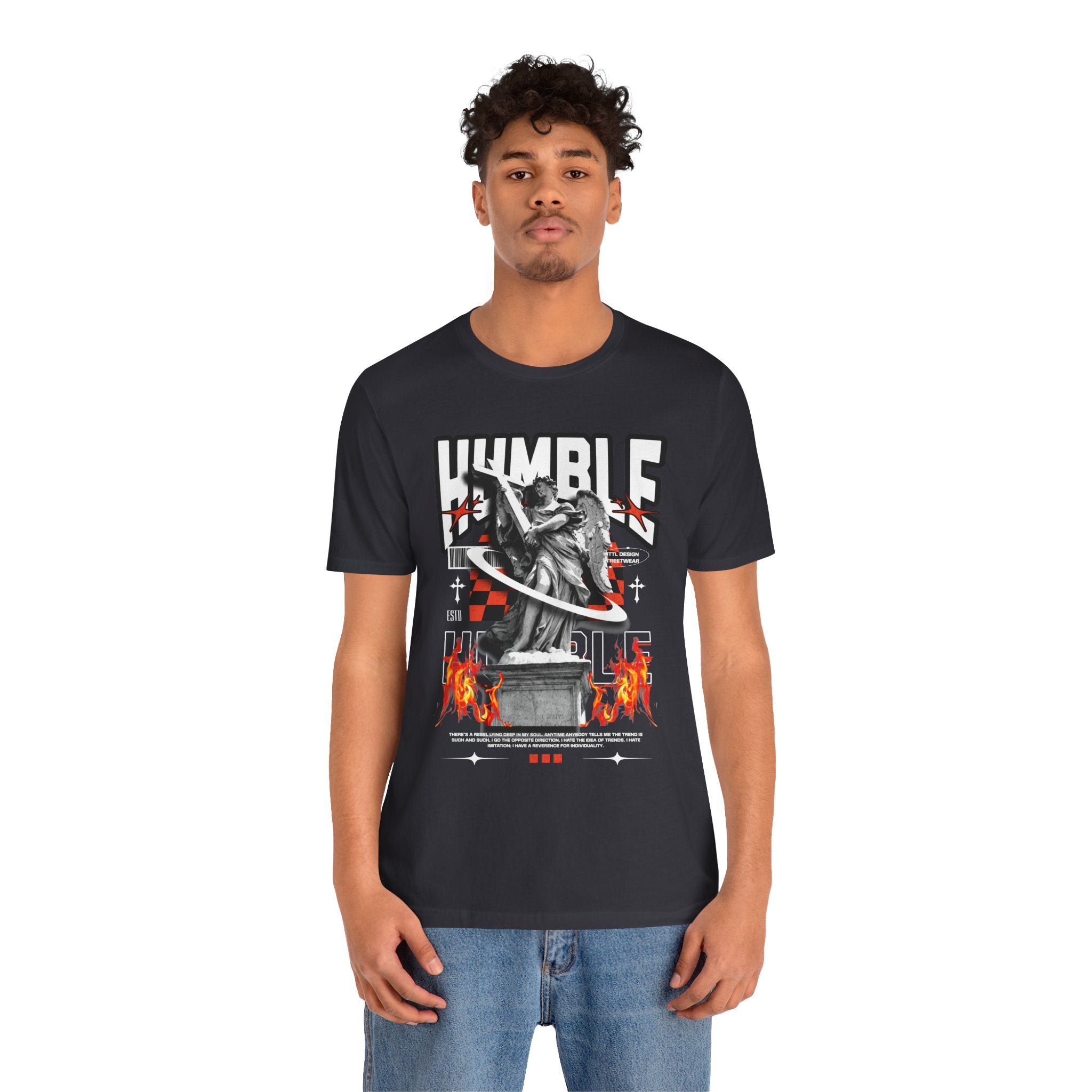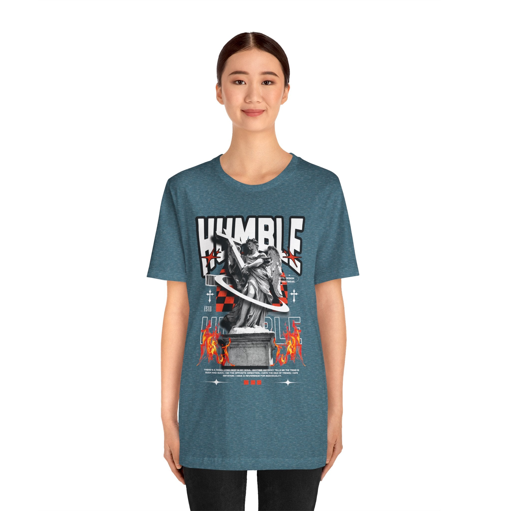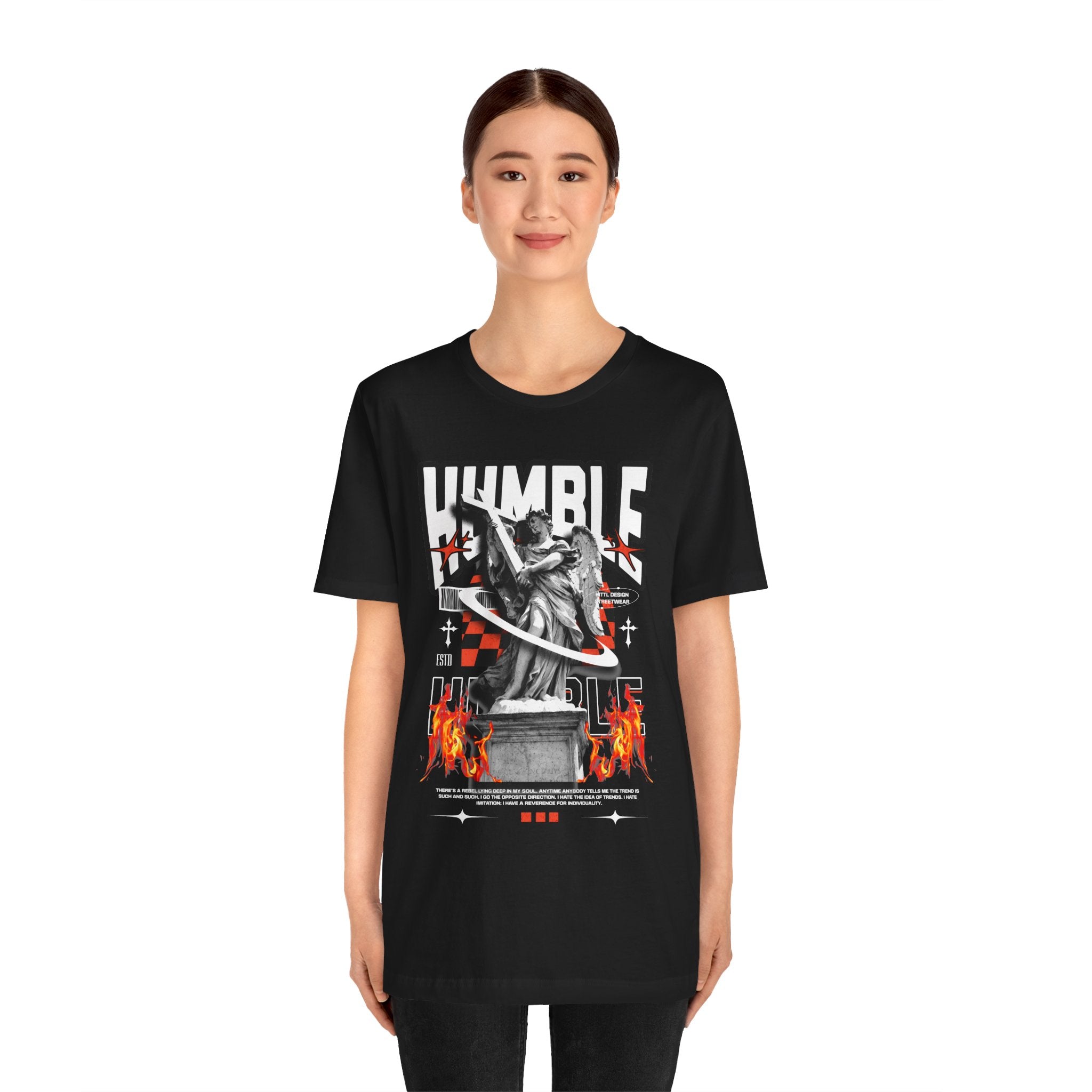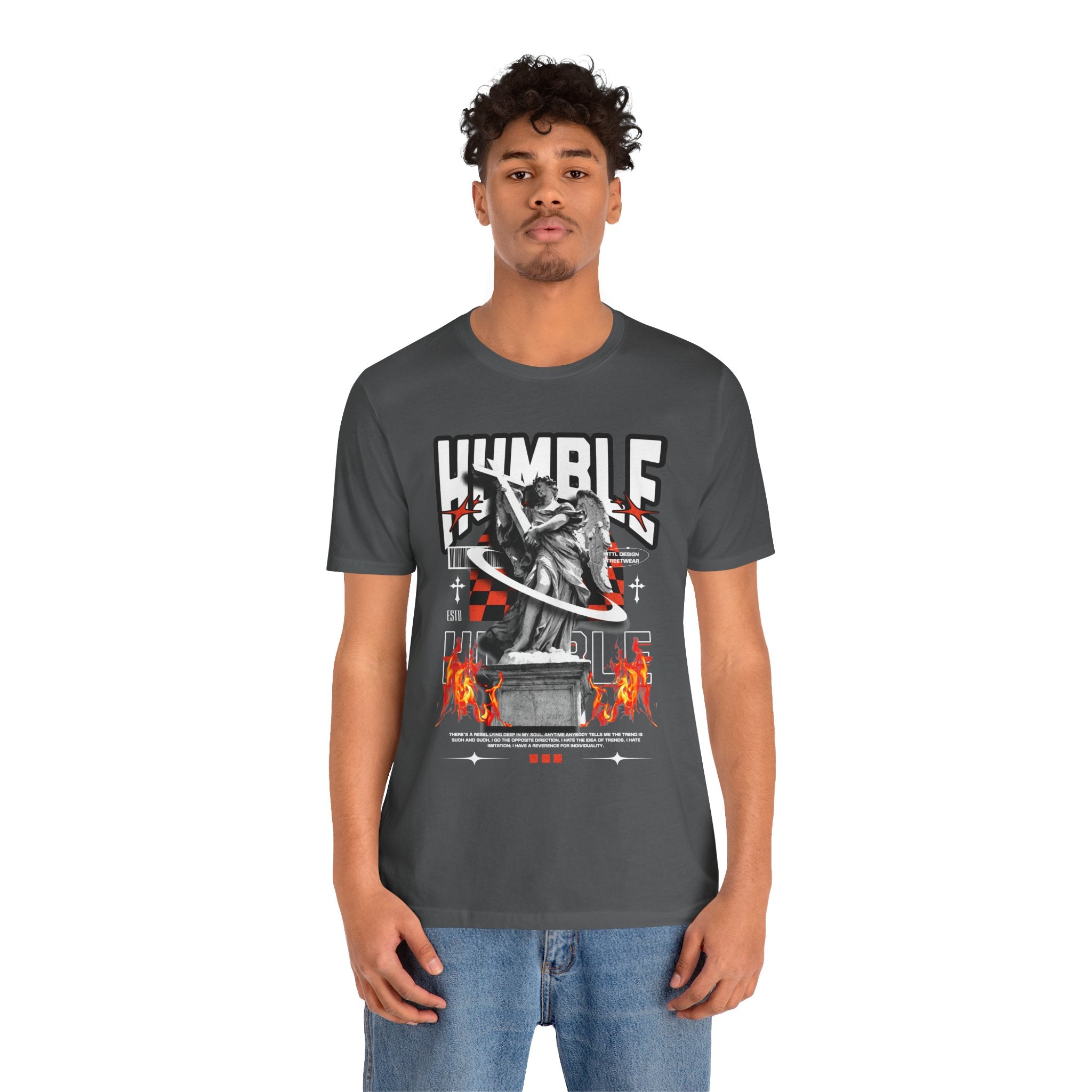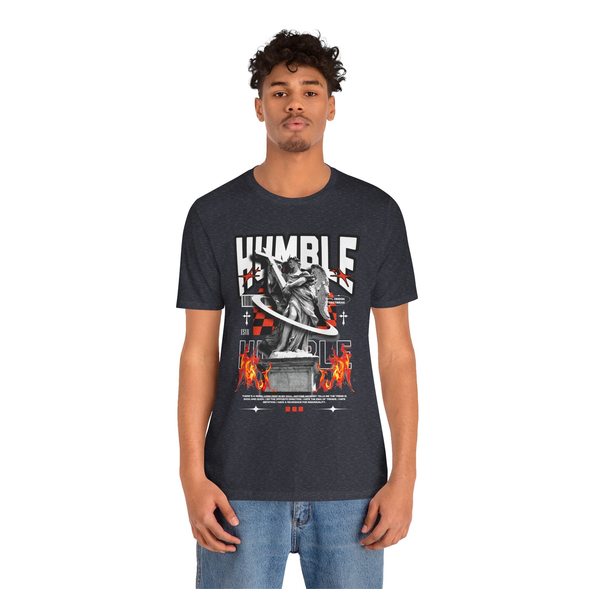 This Unisex Jersey Short Sleeve Tee combines bold streetwear design with deep symbolism — a majestic angel statue standing tall, surrounded by flames and strength, reminding you that true greatness is rooted in humility, resilience, and confidence.