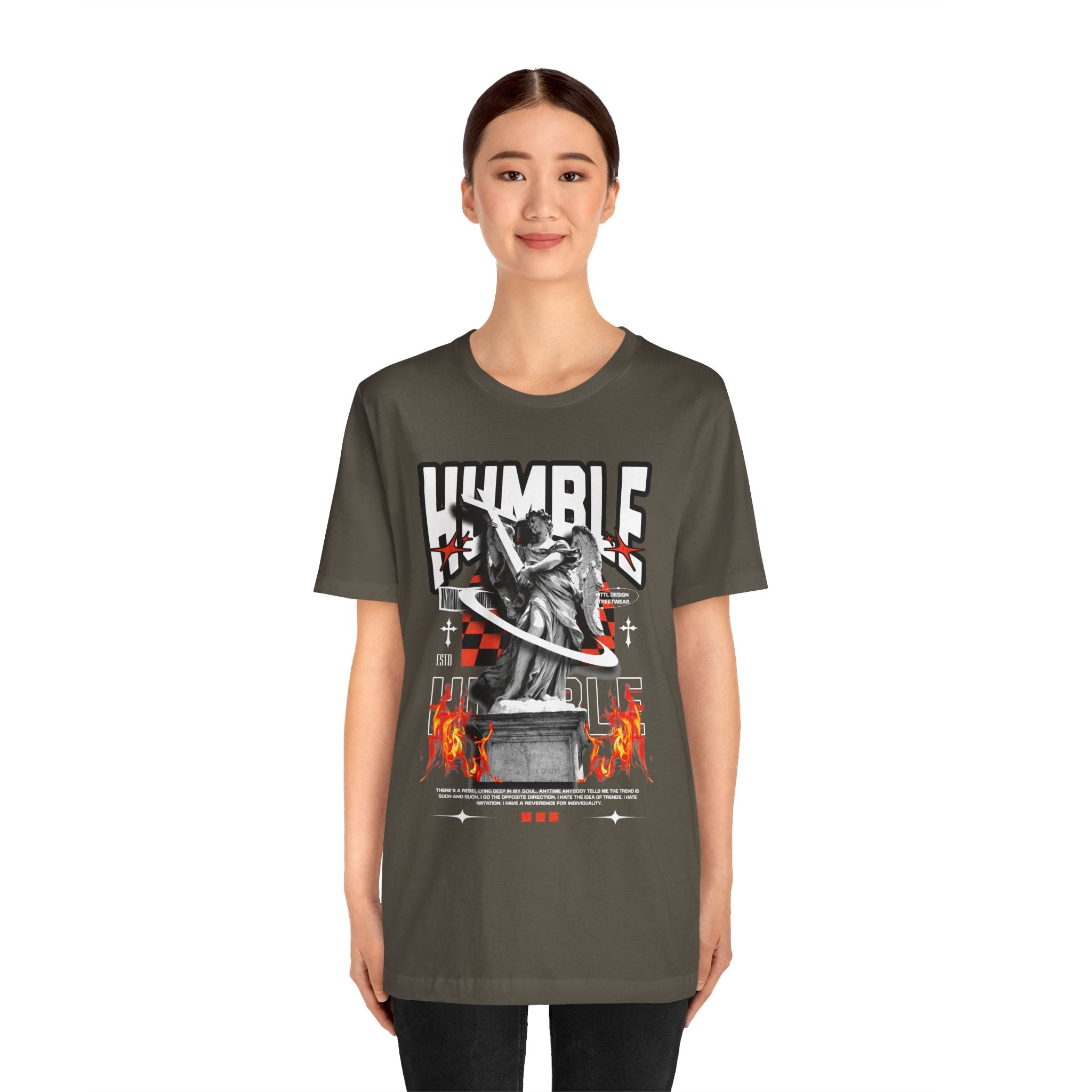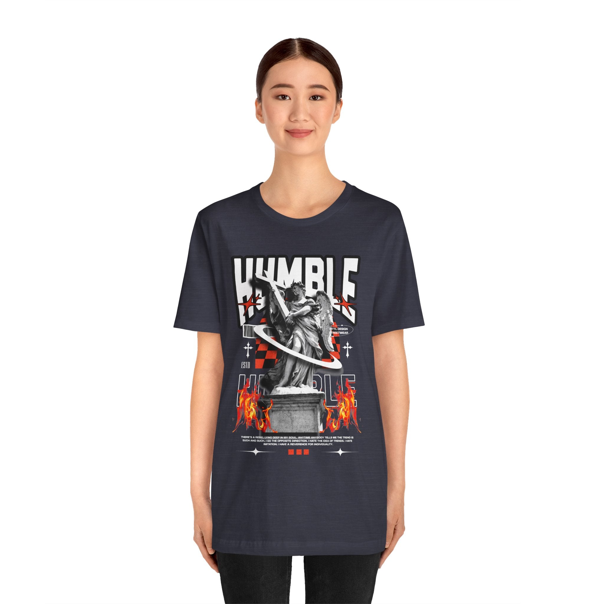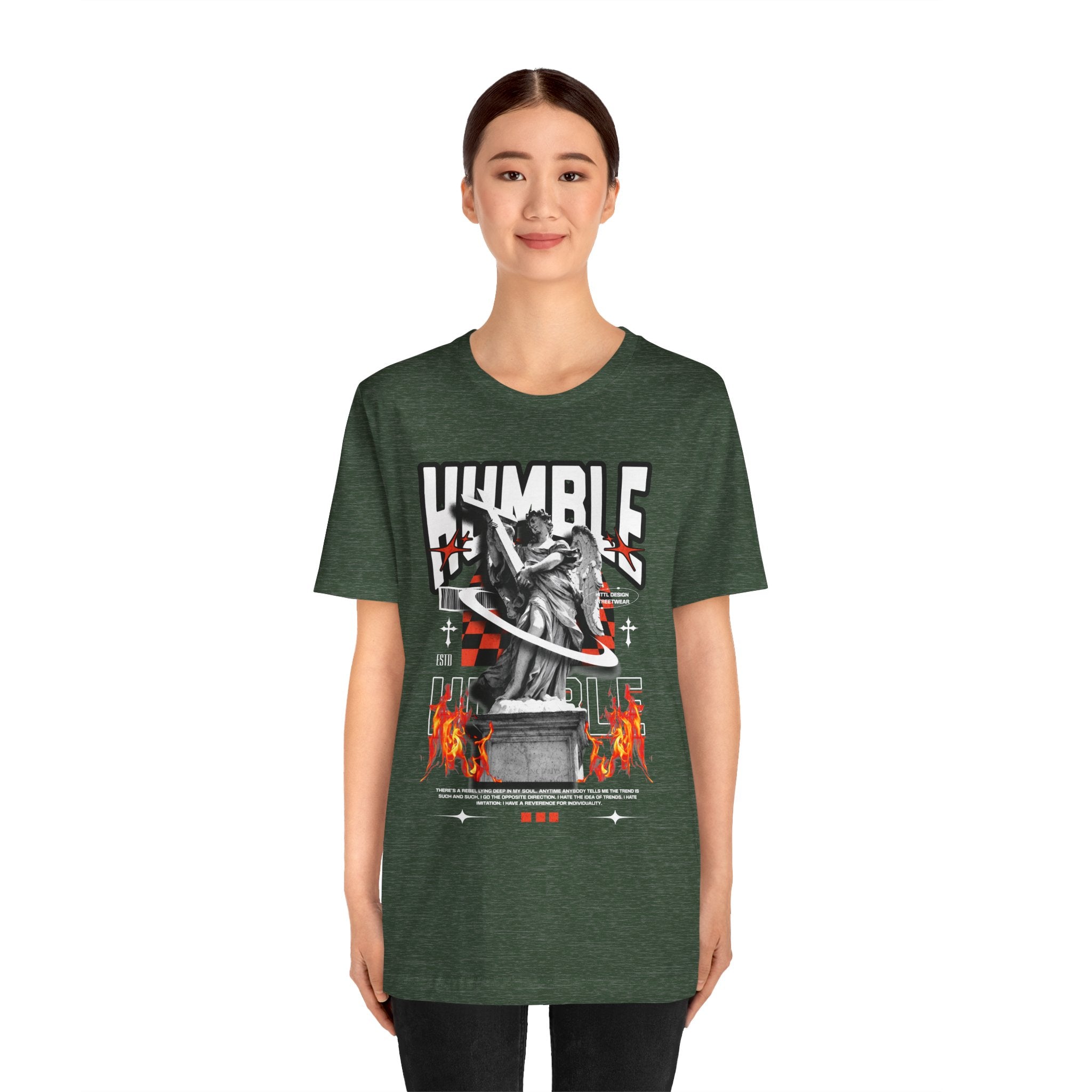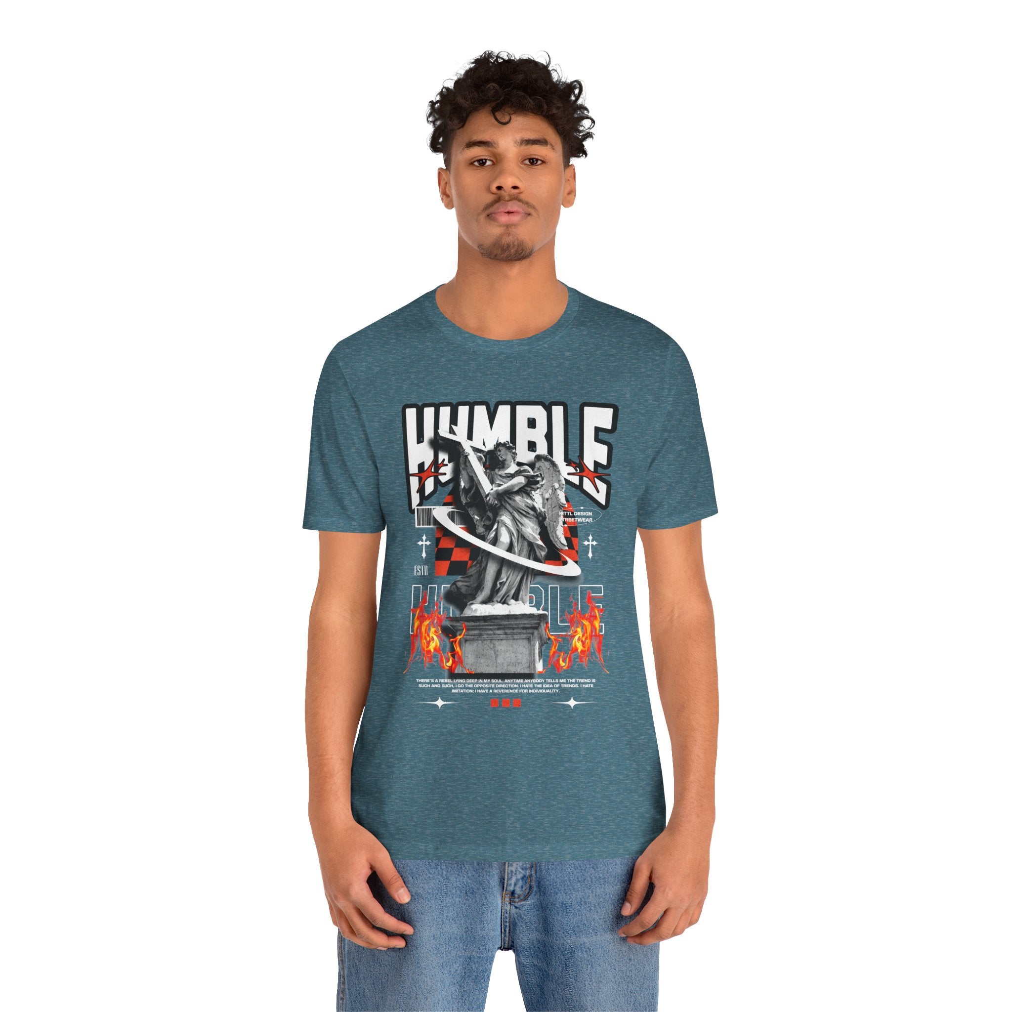This Unisex Jersey Short Sleeve Tee combines bold streetwear design with deep symbolism — a majestic angel statue standing tall, surrounded by flames and strength, reminding you that true greatness is rooted in humility, resilience, and confidence.