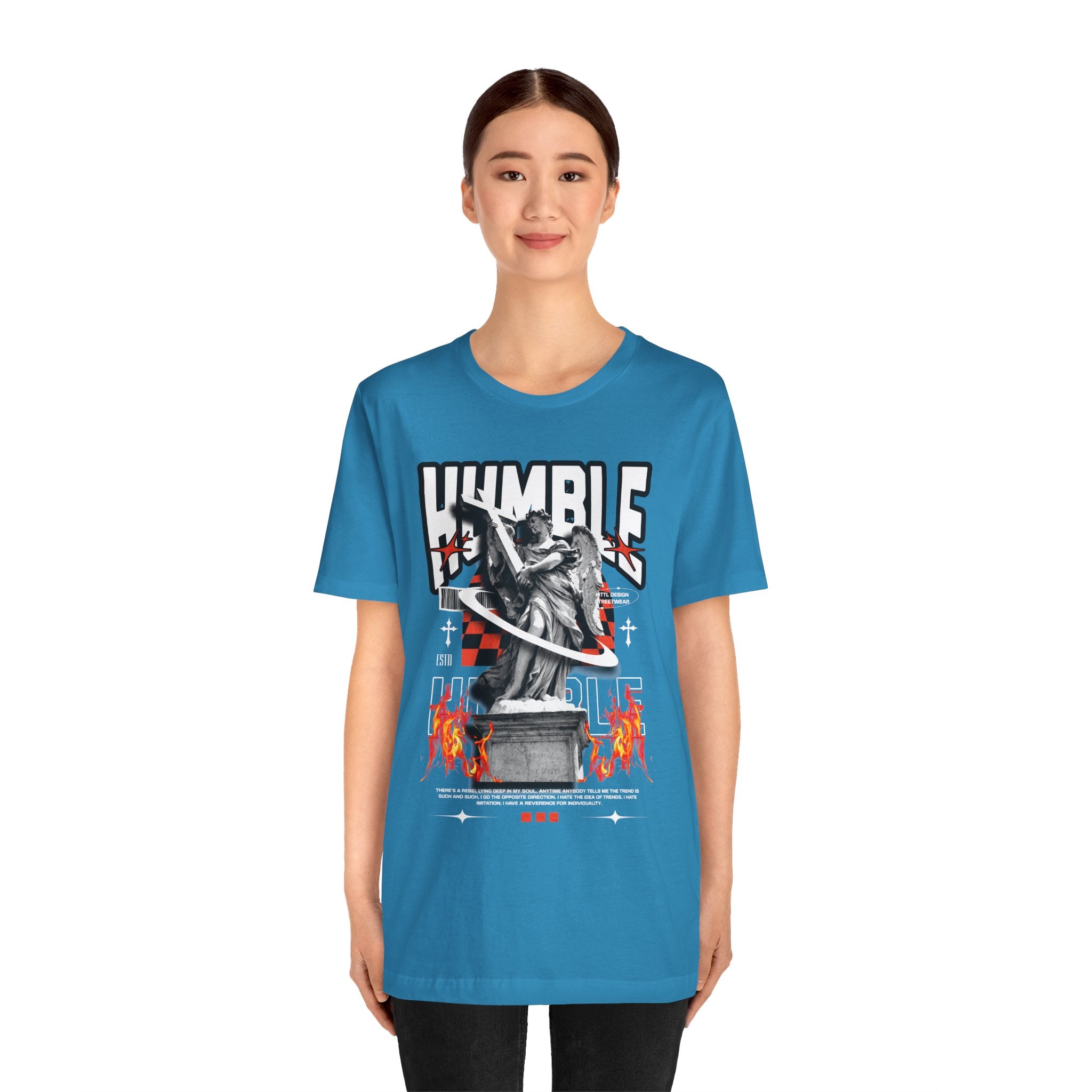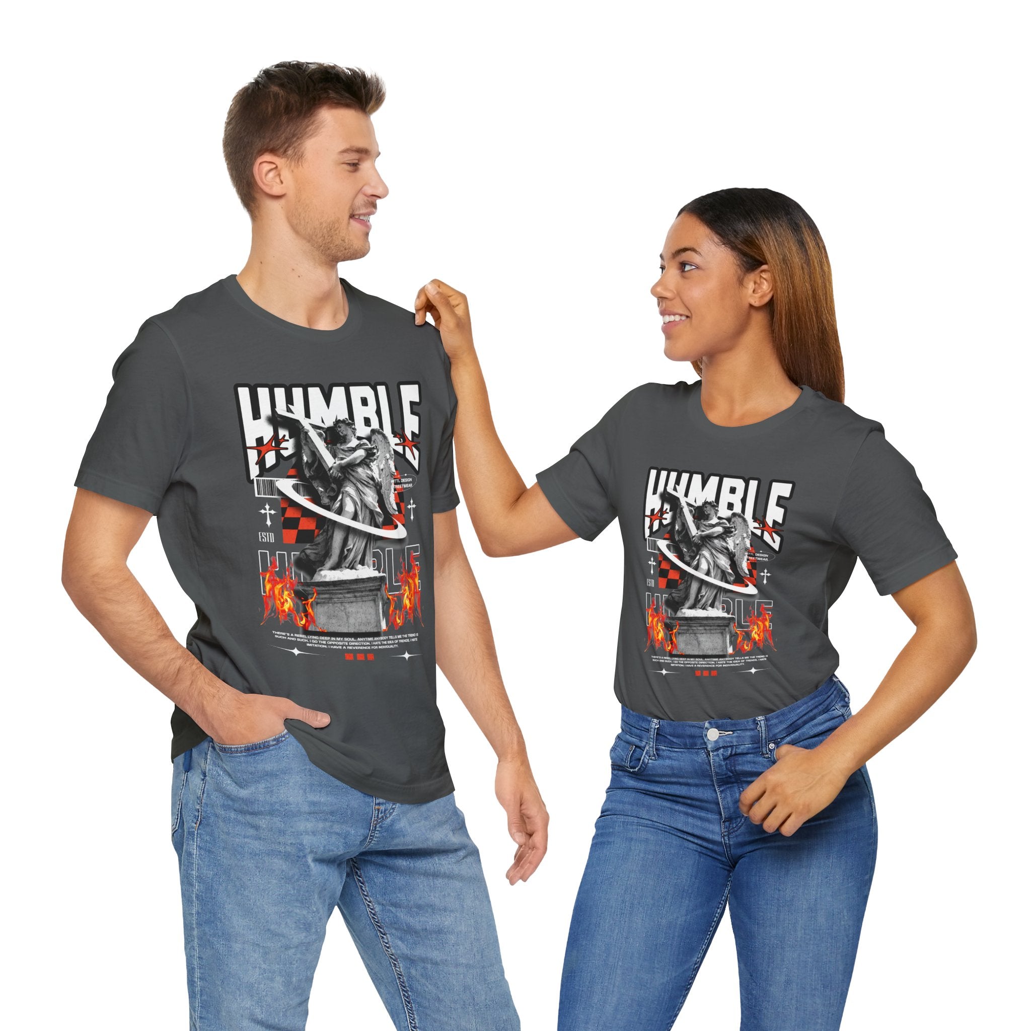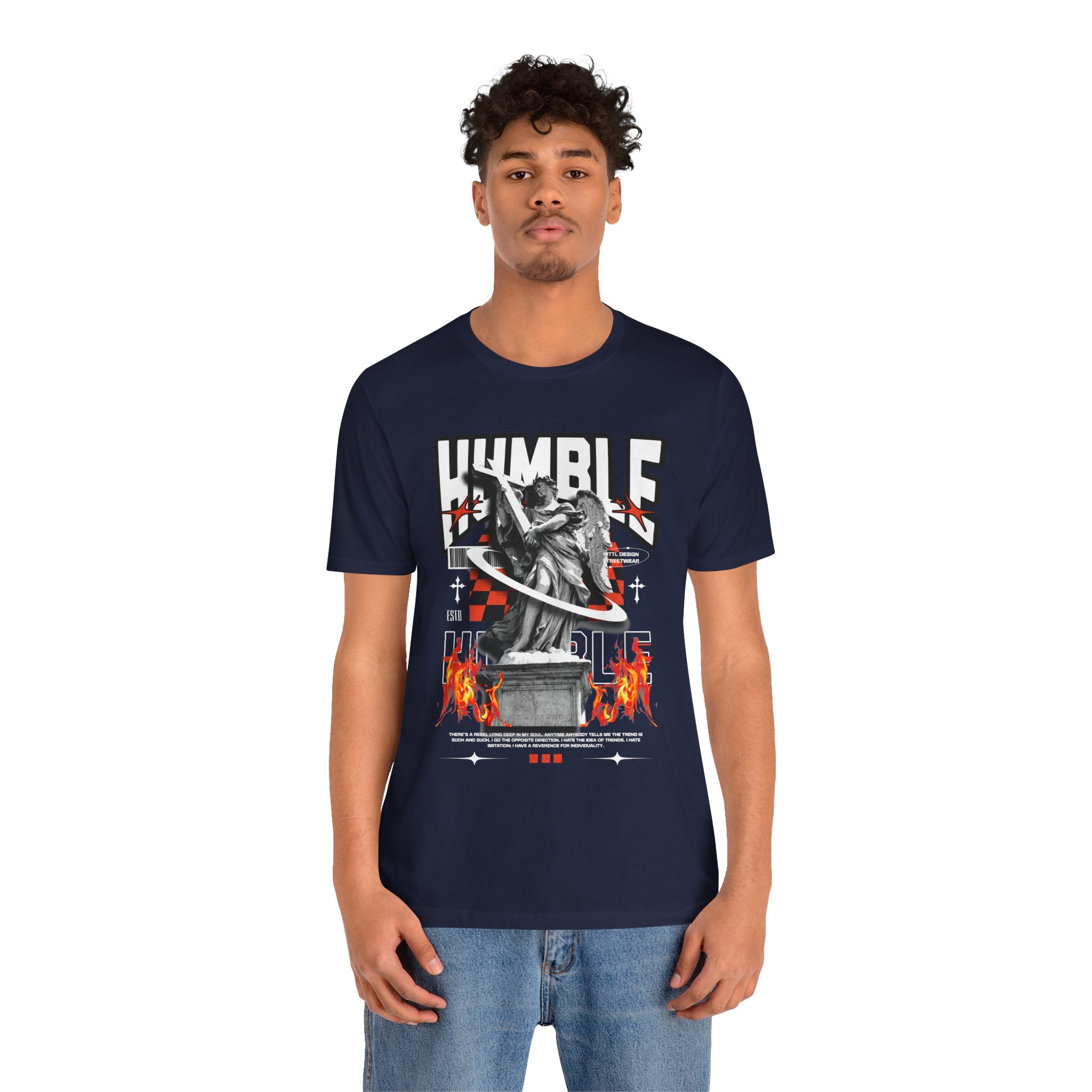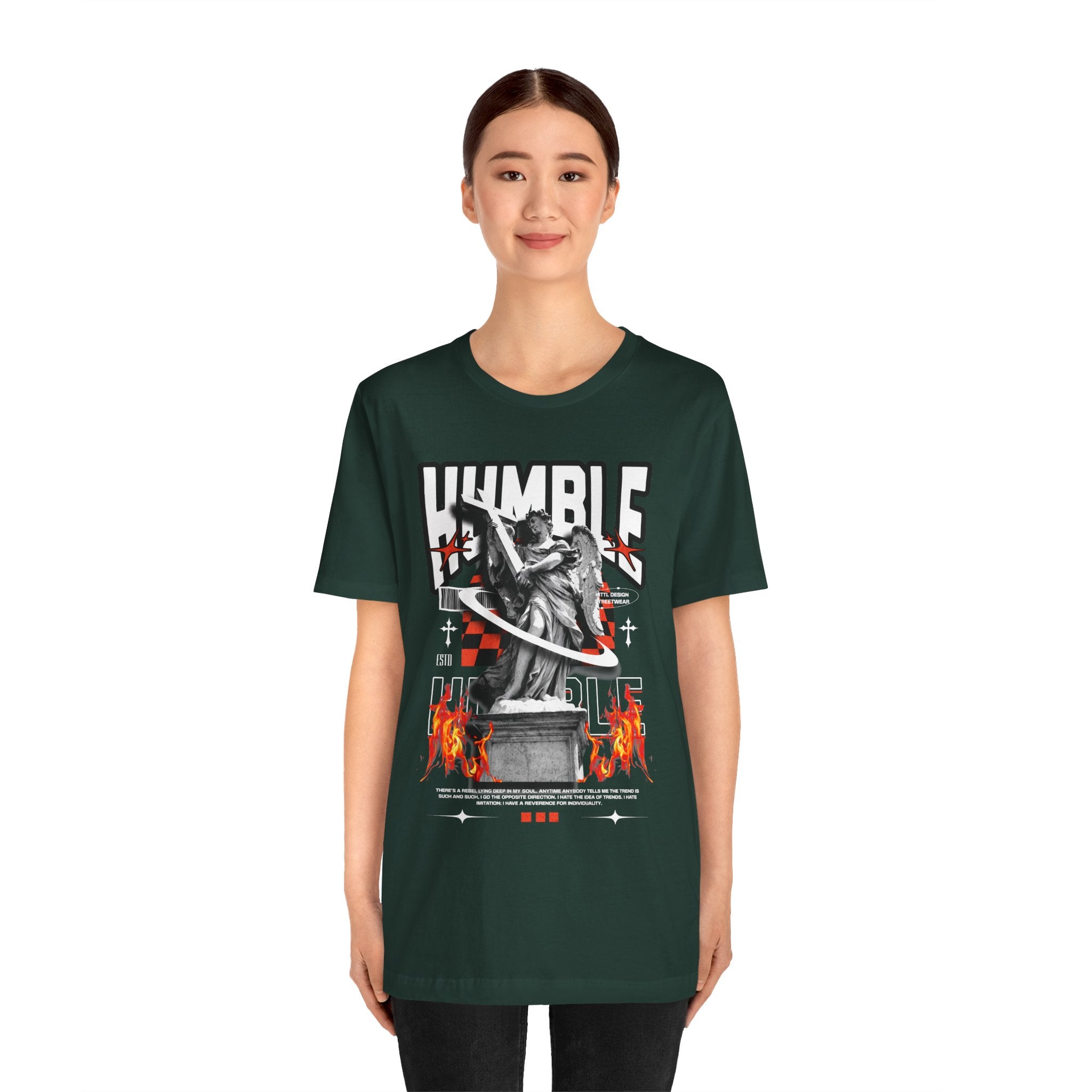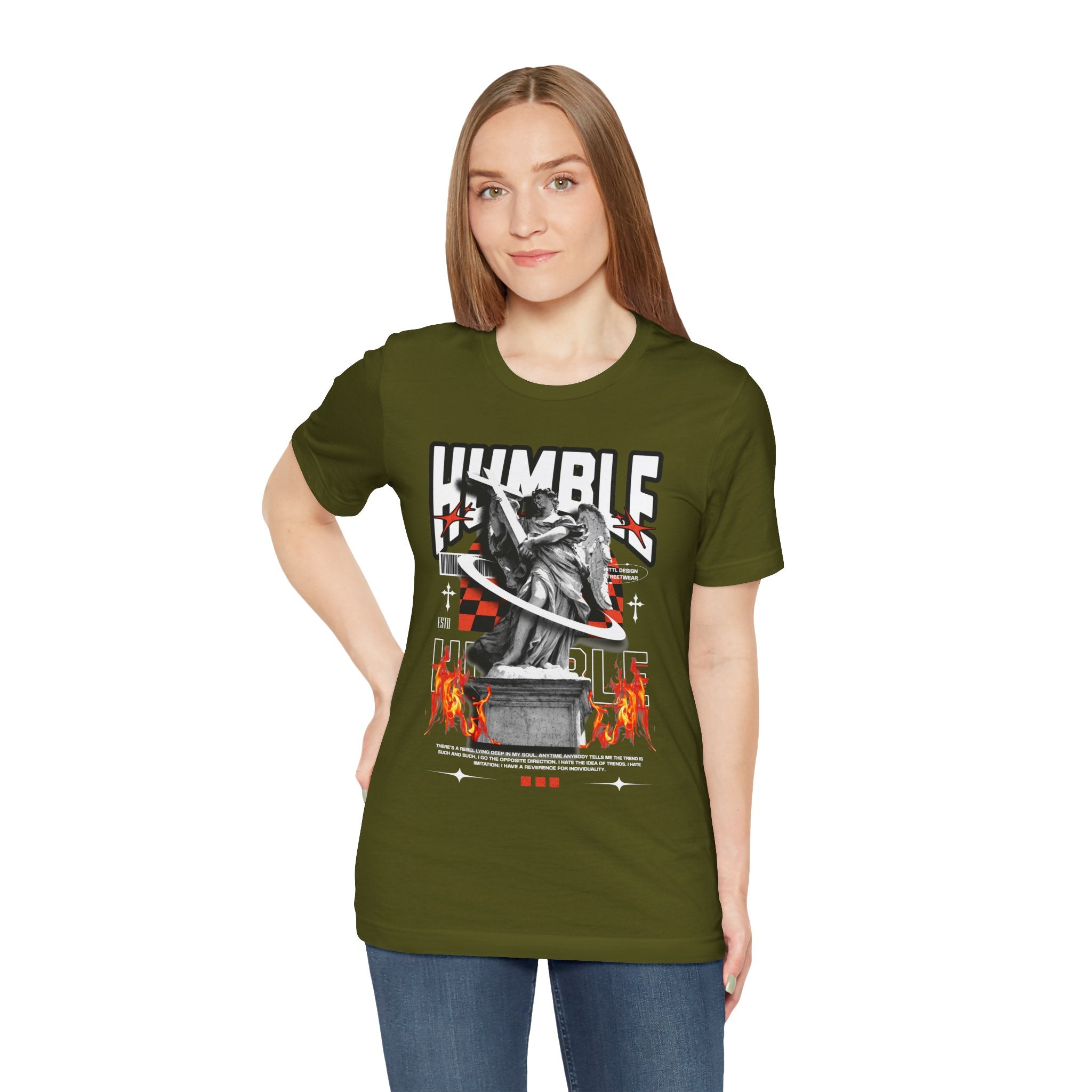 This Unisex Jersey Short Sleeve Tee combines bold streetwear design with deep symbolism — a majestic angel statue standing tall, surrounded by flames and strength, reminding you that true greatness is rooted in humility, resilience, and confidence.