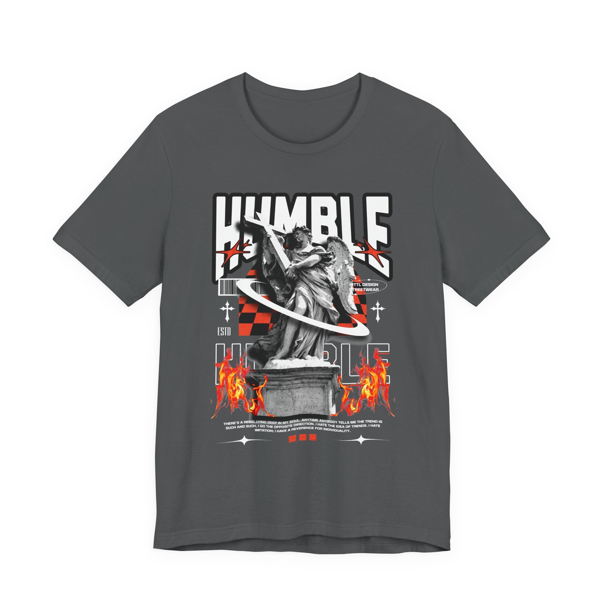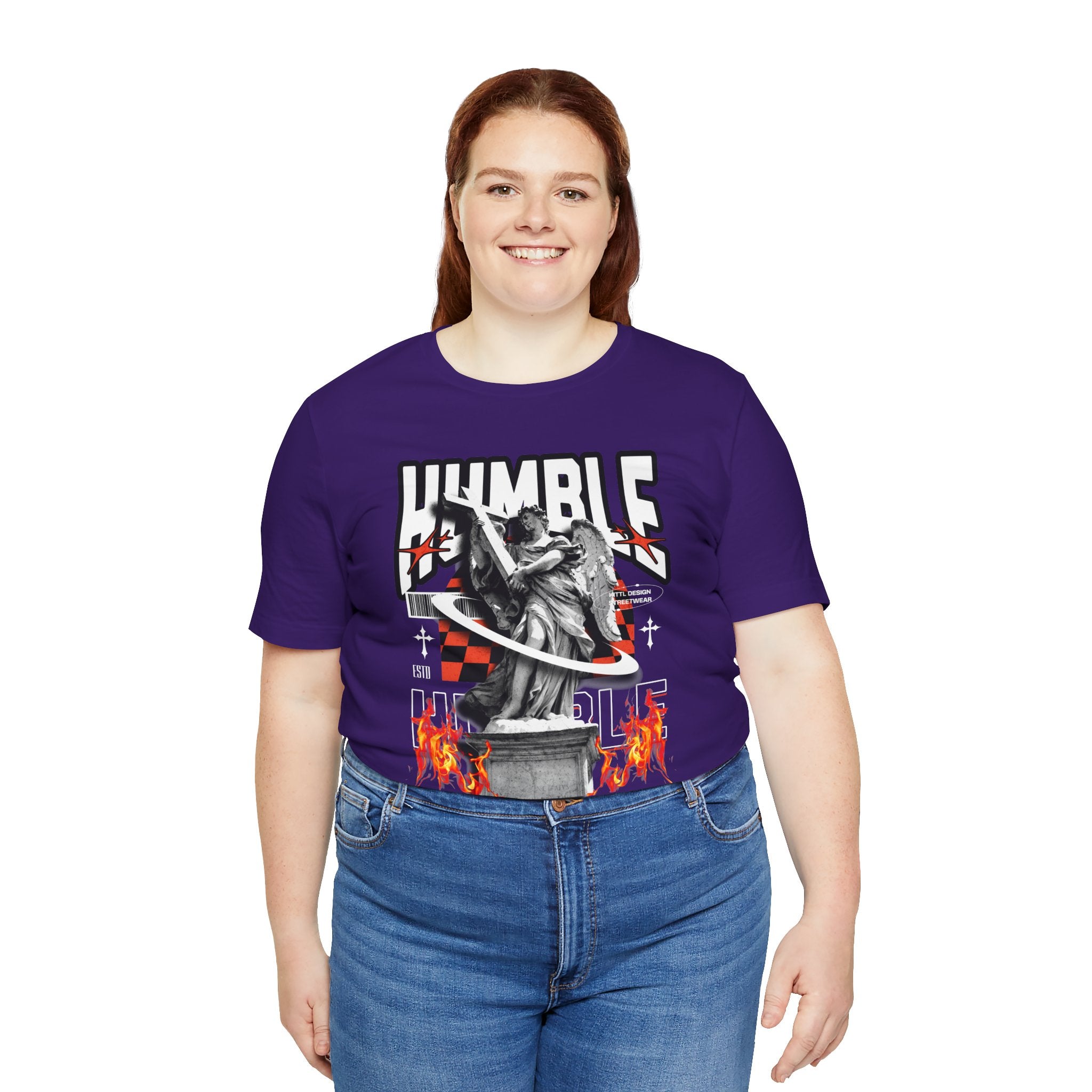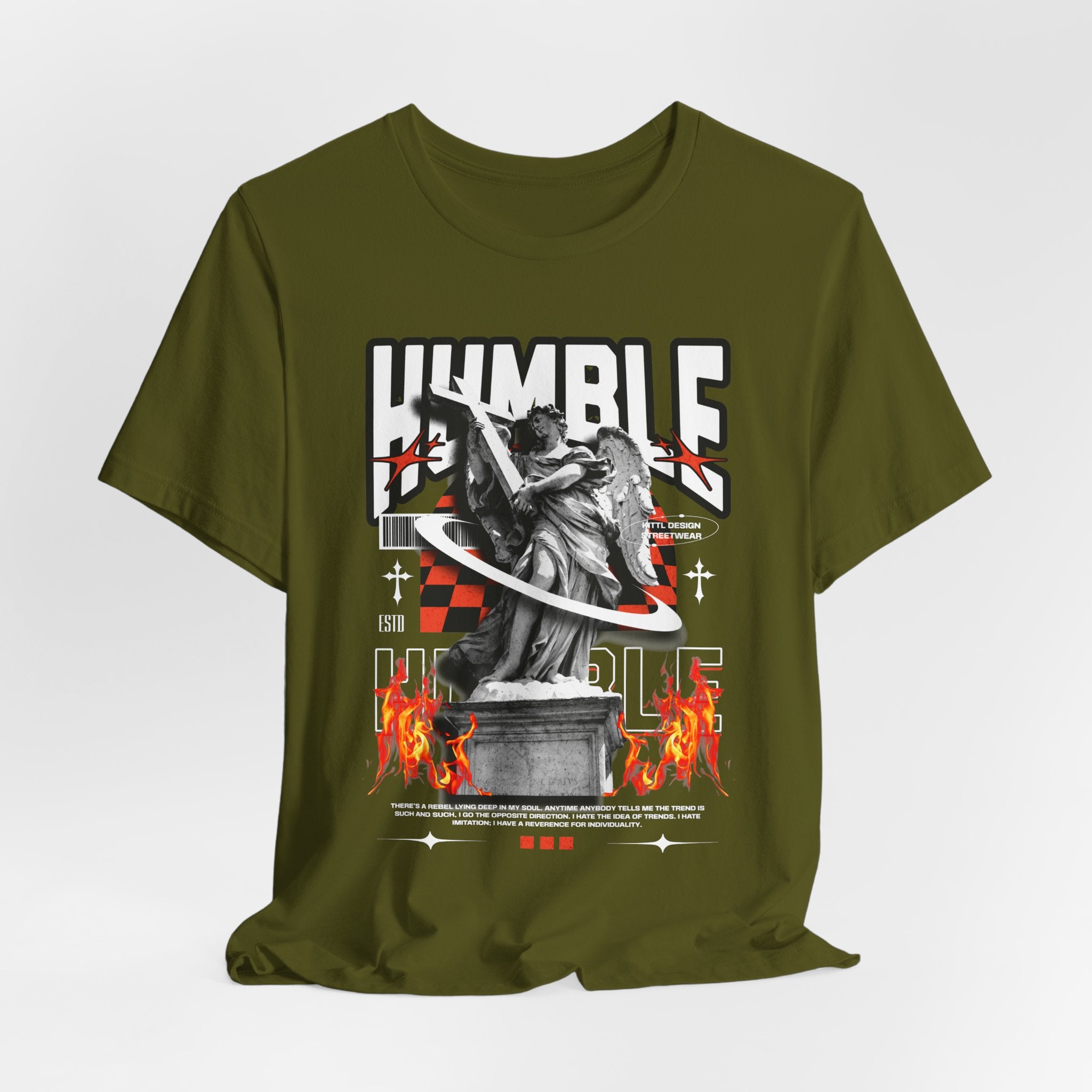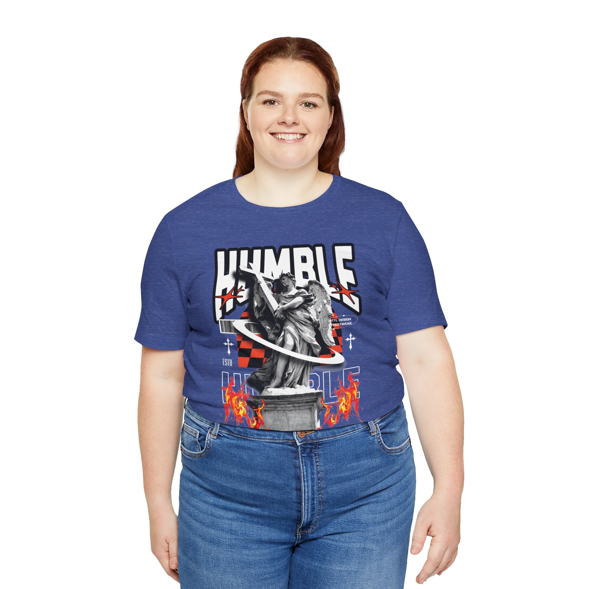 This Unisex Jersey Short Sleeve Tee combines bold streetwear design with deep symbolism — a majestic angel statue standing tall, surrounded by flames and strength, reminding you that true greatness is rooted in humility, resilience, and confidence.
