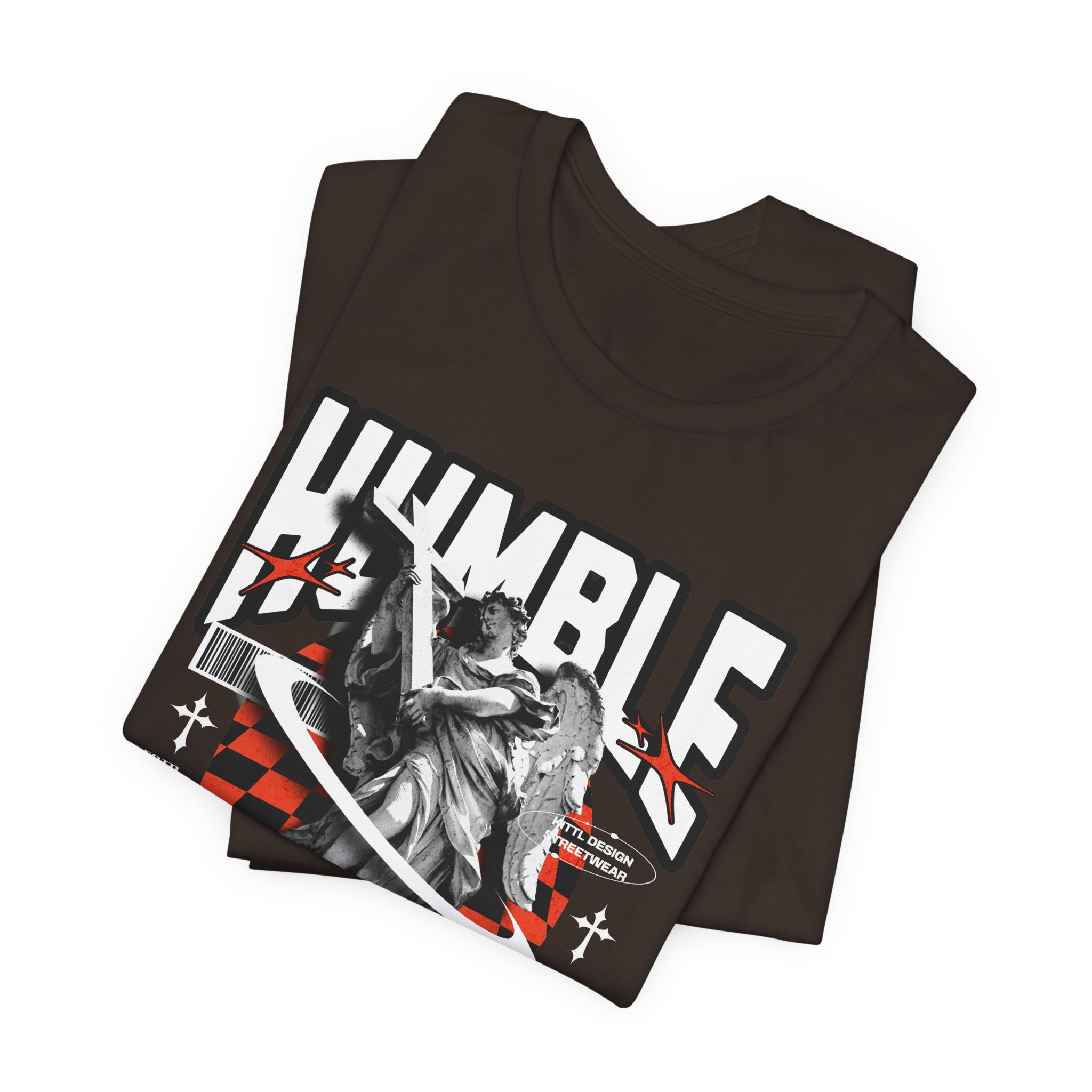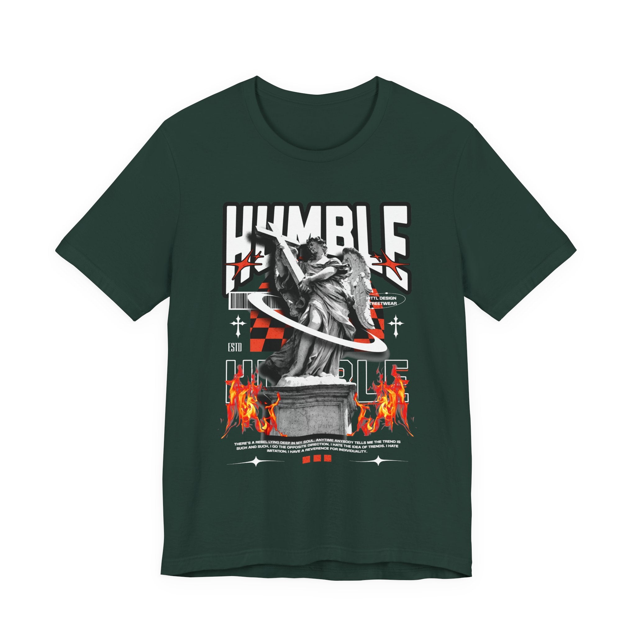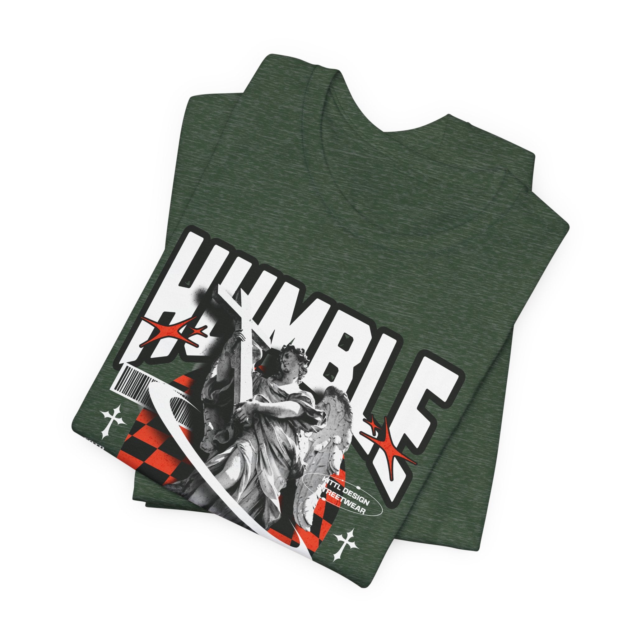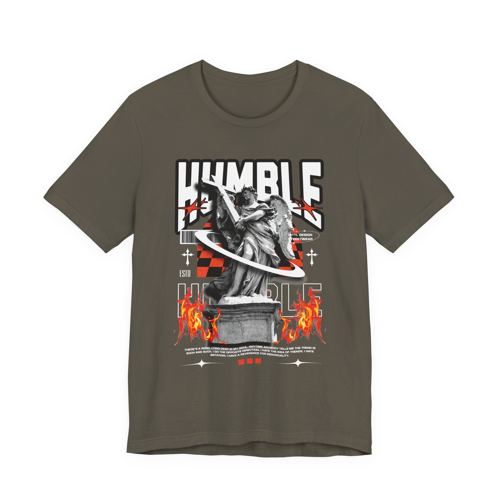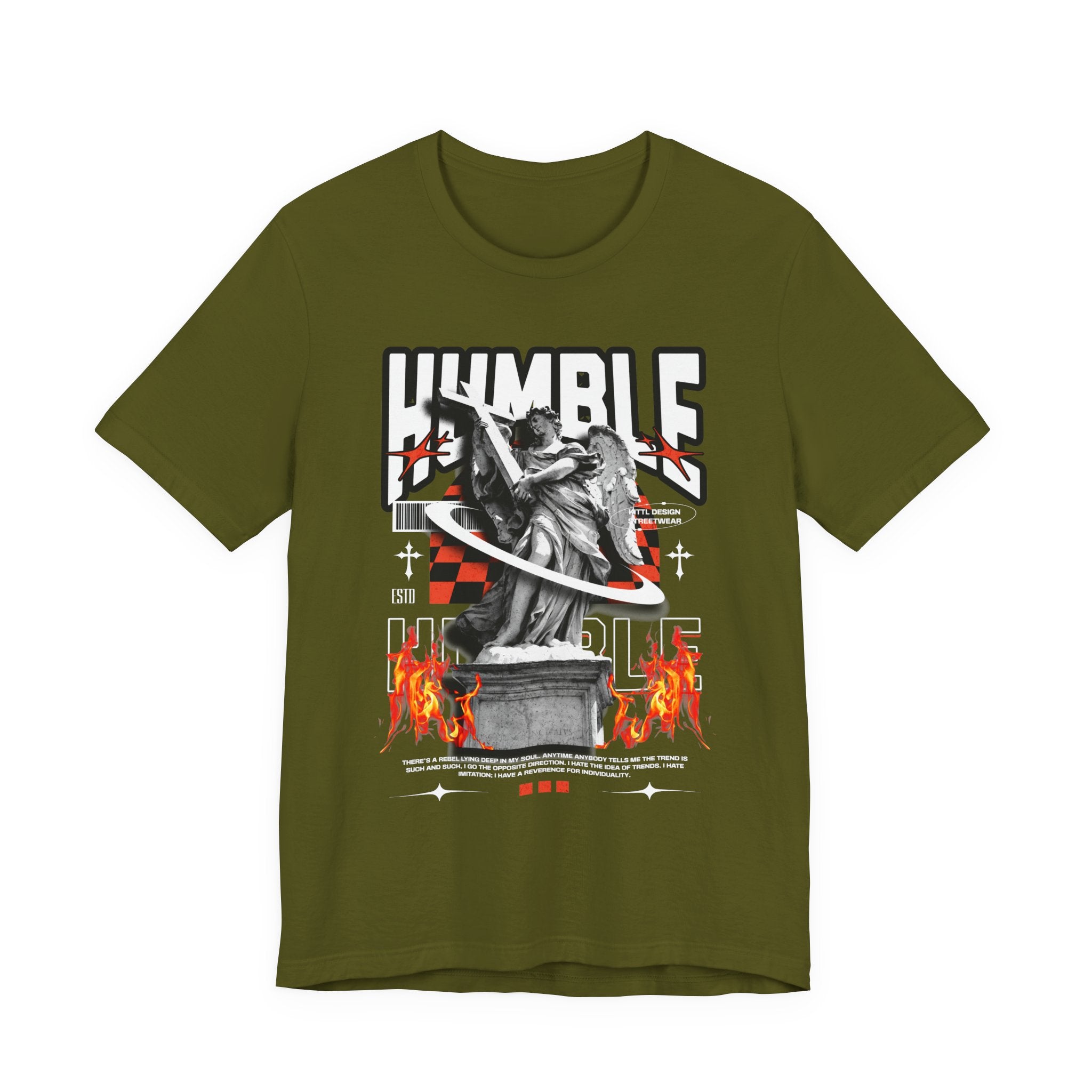This Unisex Jersey Short Sleeve Tee combines bold streetwear design with deep symbolism — a majestic angel statue standing tall, surrounded by flames and strength, reminding you that true greatness is rooted in humility, resilience, and confidence.