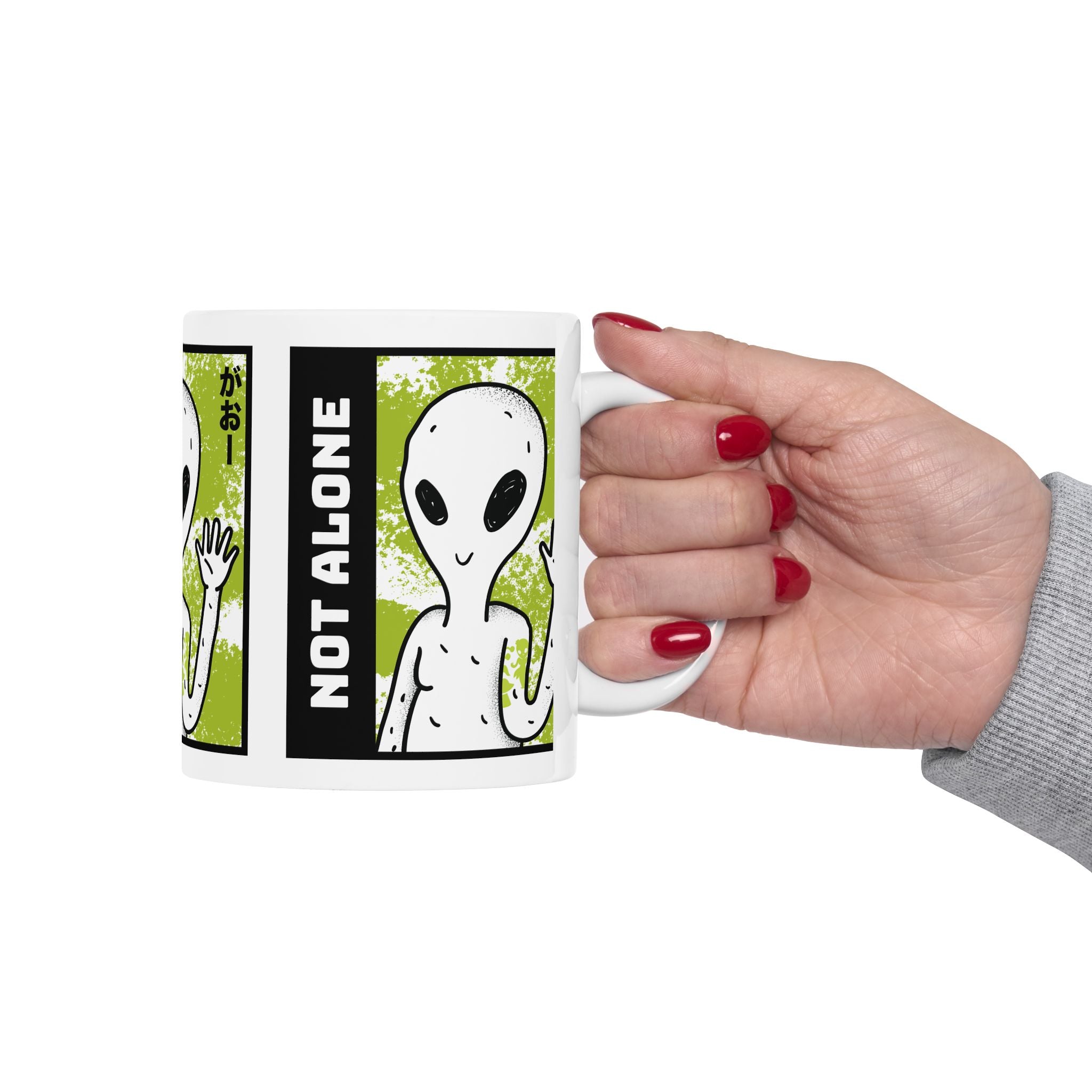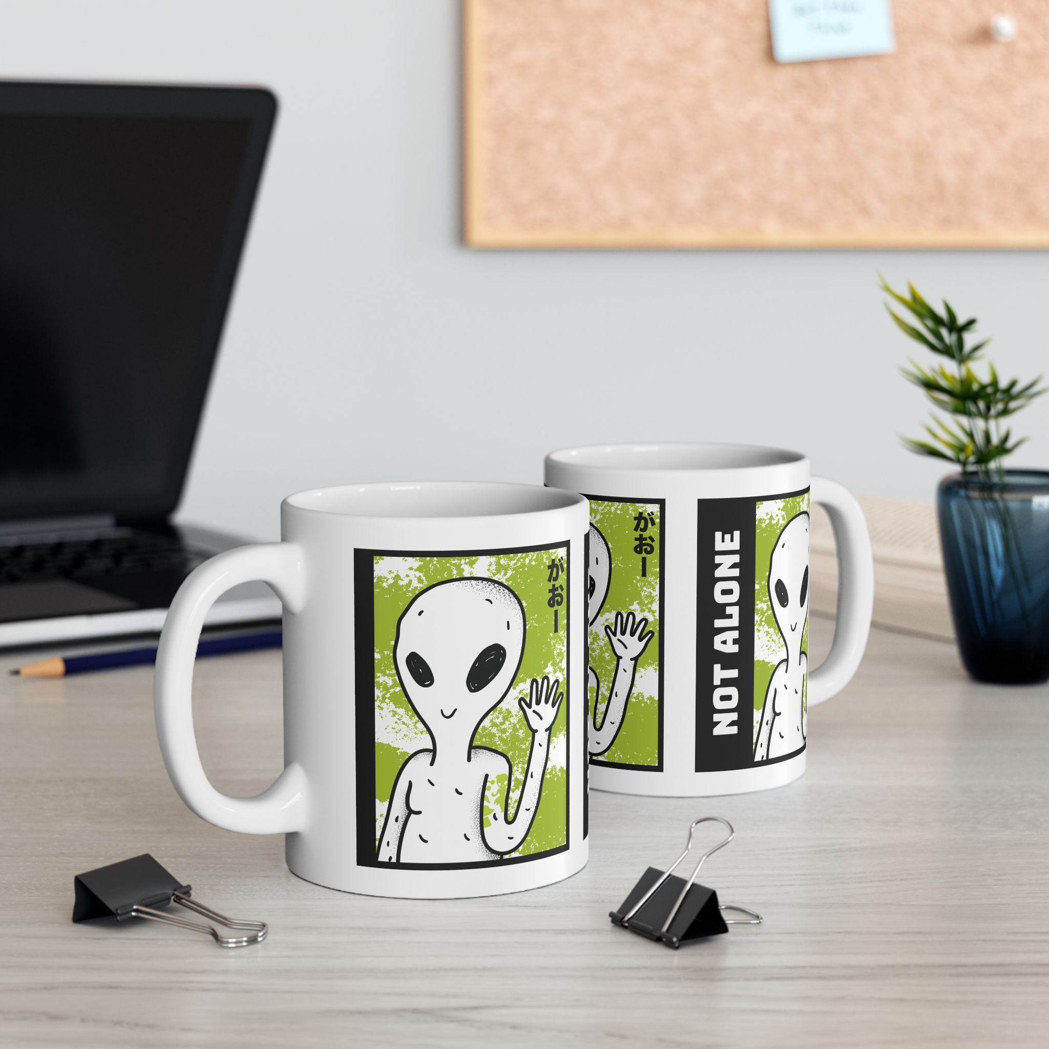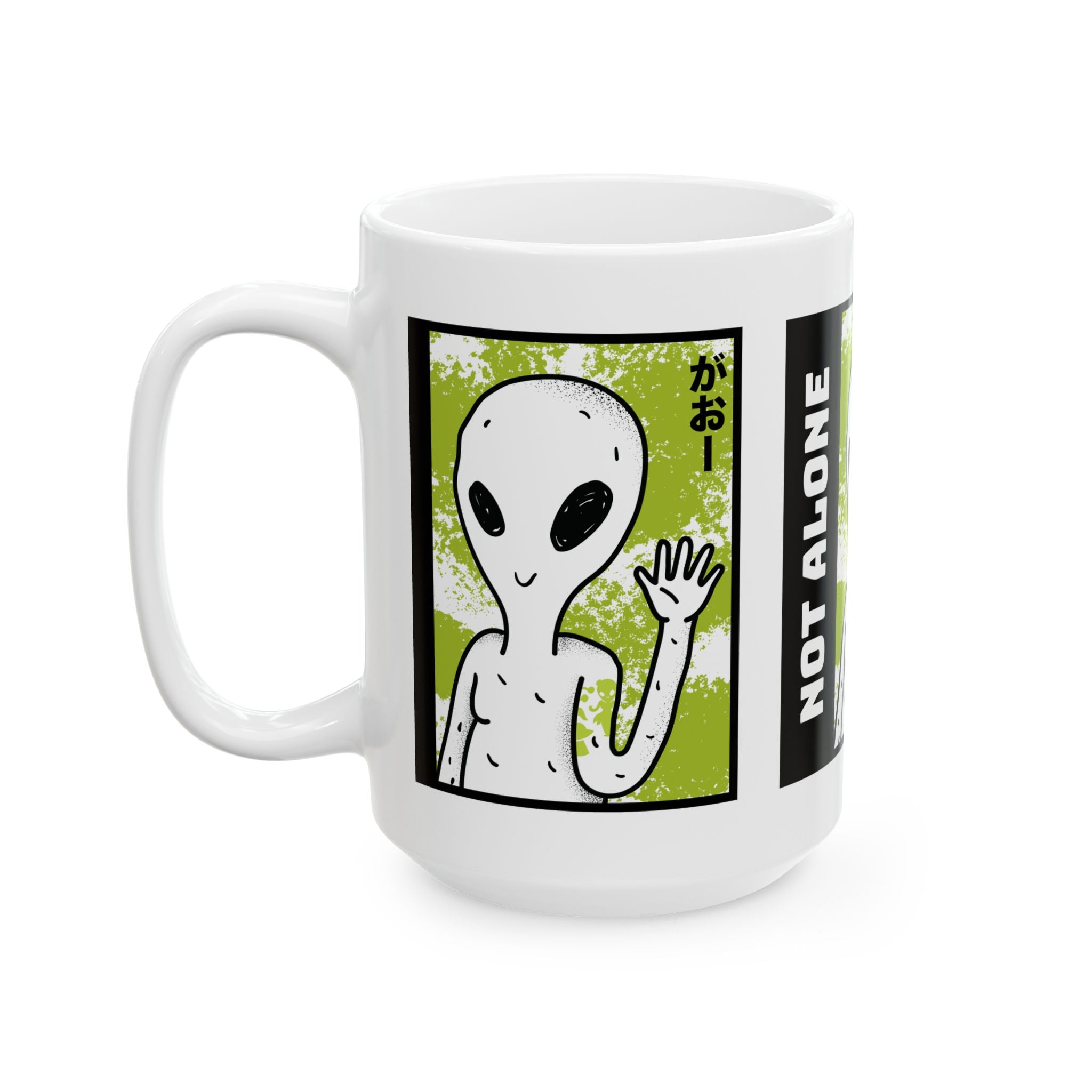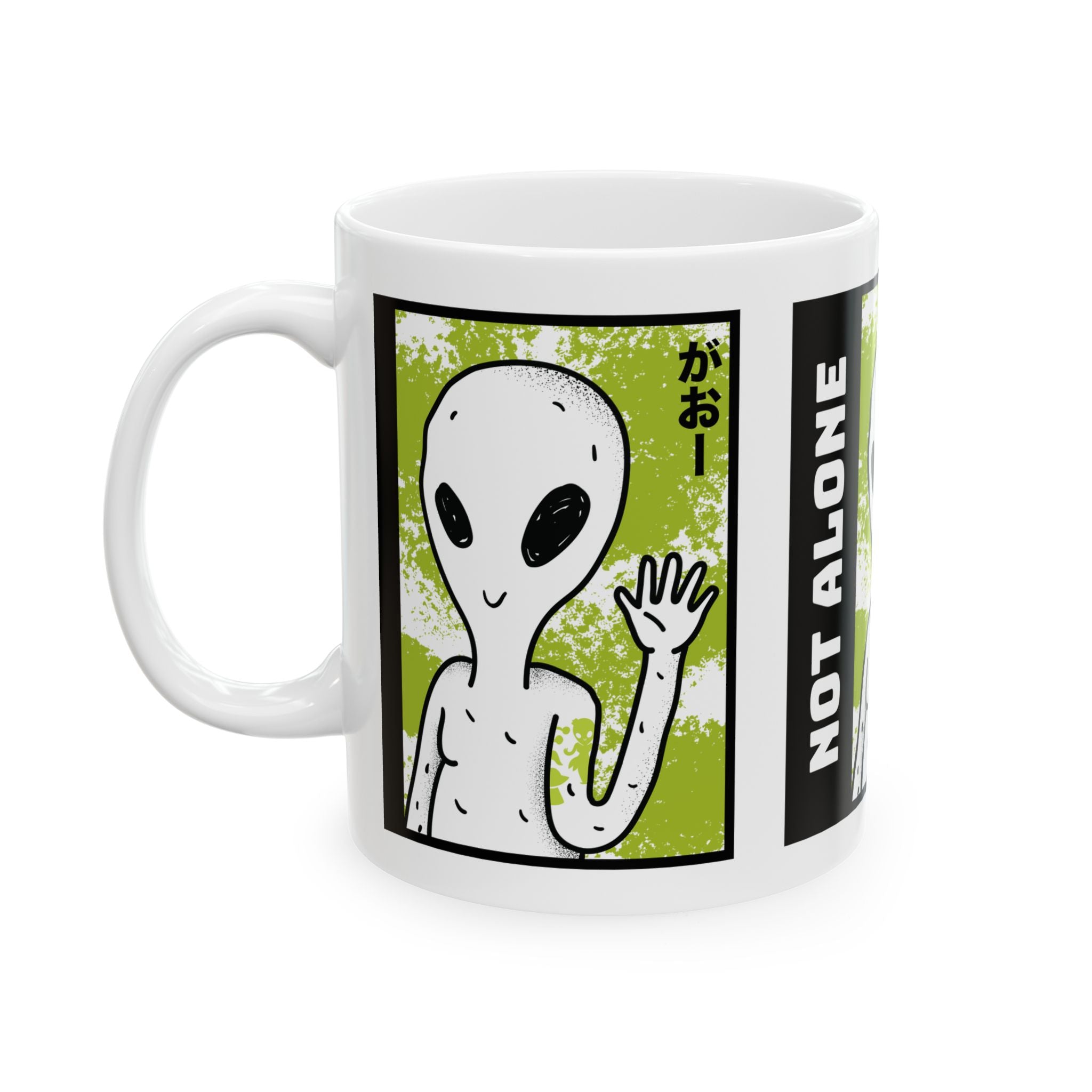 Start your day with a reminder that you’re not alone. The Alien “Not Alone” Ceramic Mug features a playful extraterrestrial waving hello with bold lettering — the perfect blend of fun, curiosity, and cosmic style.