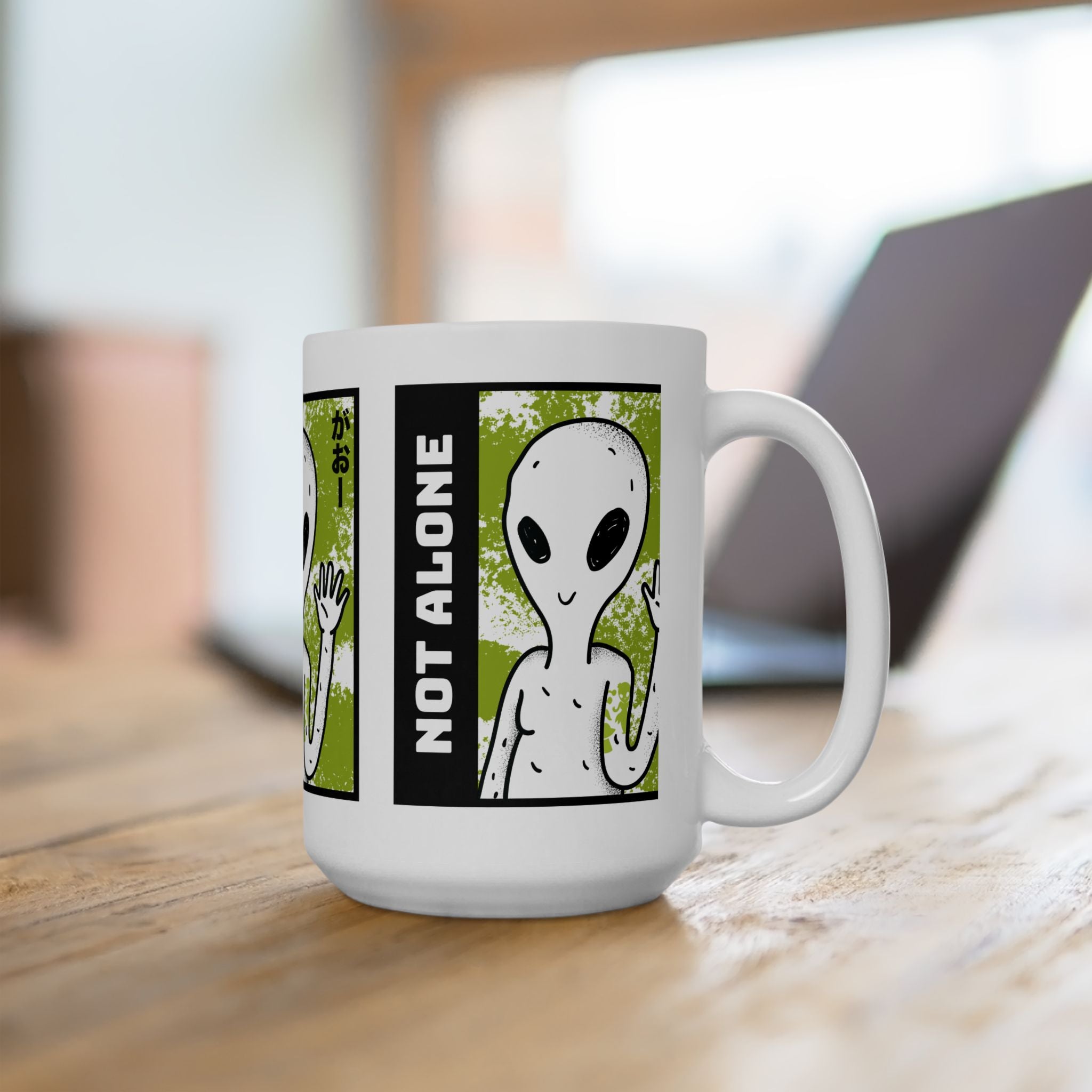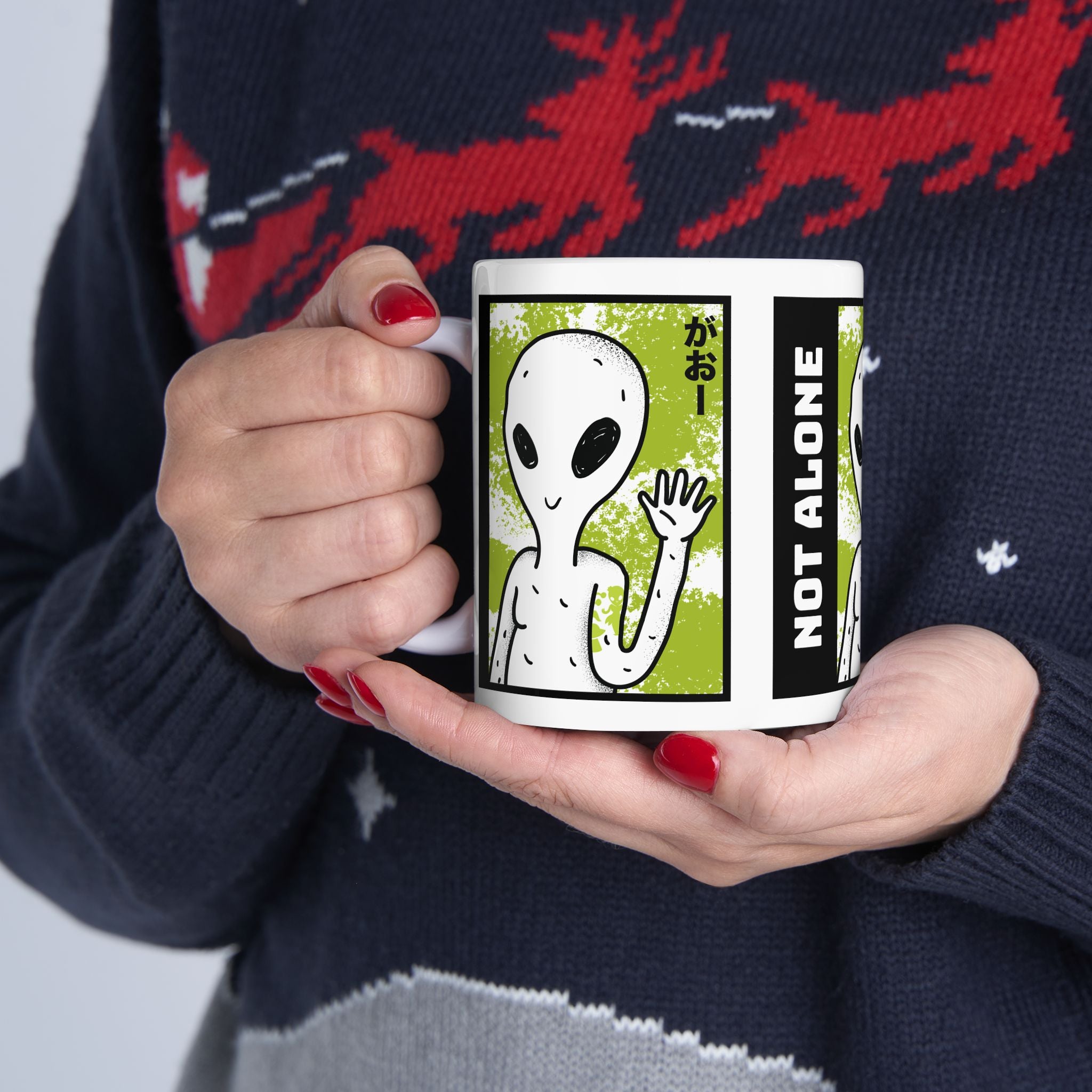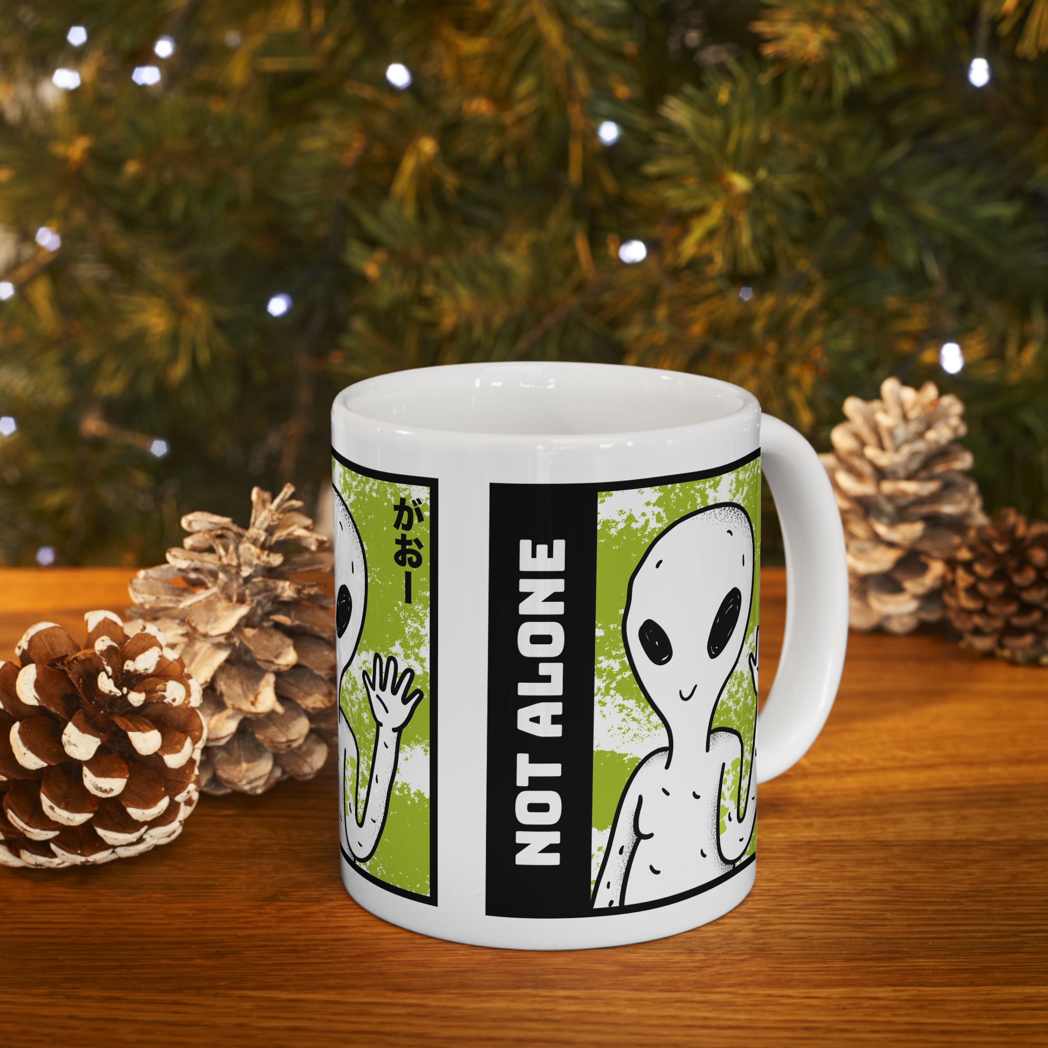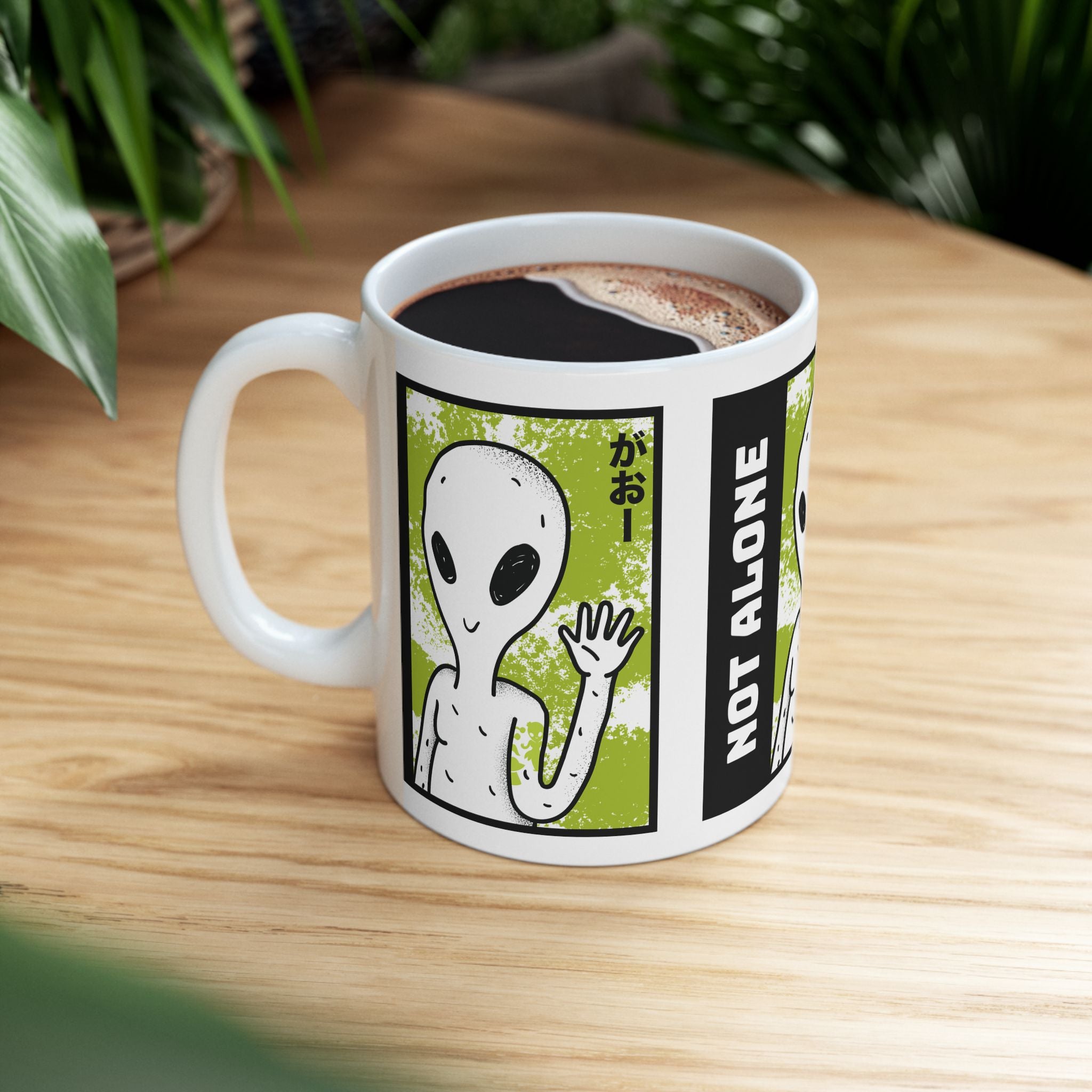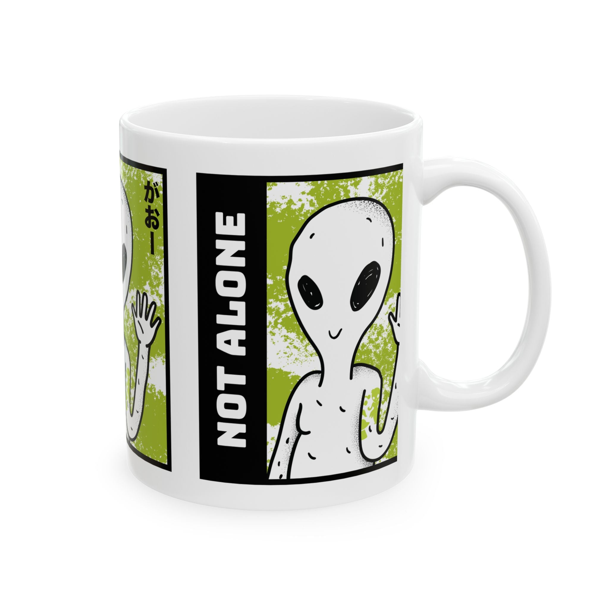 Start your day with a reminder that you’re not alone. The Alien “Not Alone” Ceramic Mug features a playful extraterrestrial waving hello with bold lettering — the perfect blend of fun, curiosity, and cosmic style.