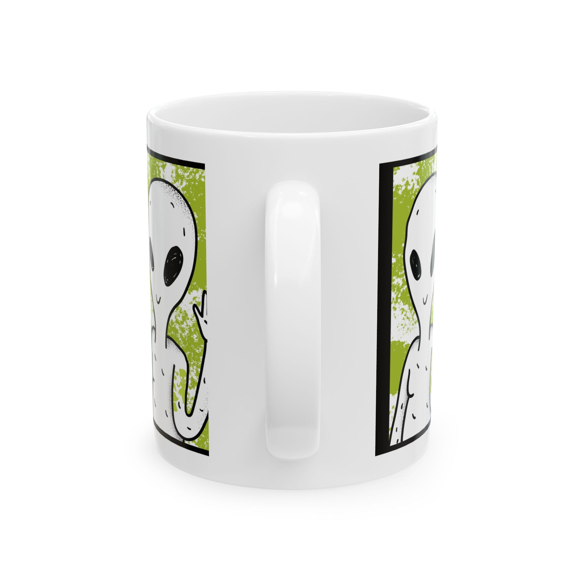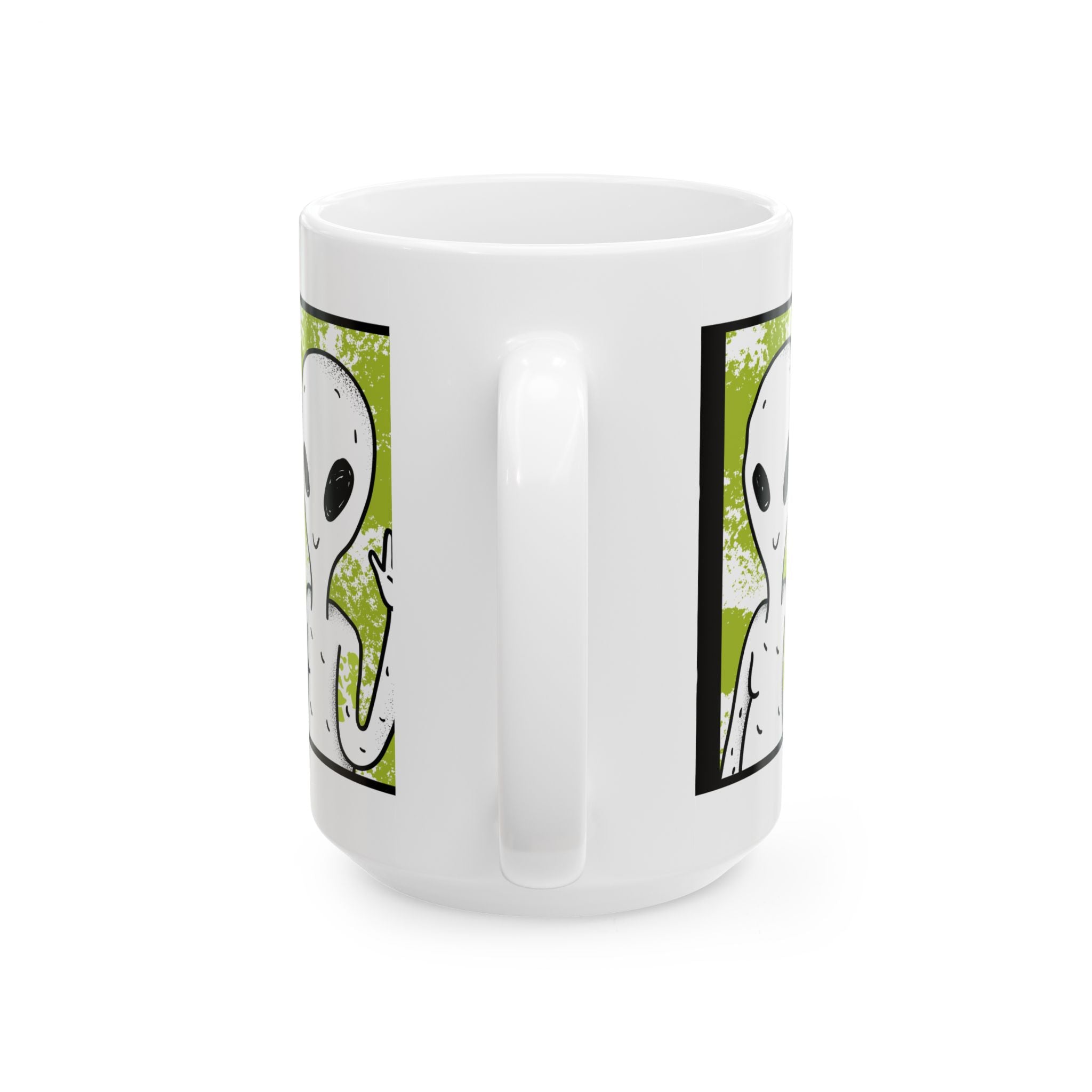 Unisex ceramic mug with bold alien cartoon graphic