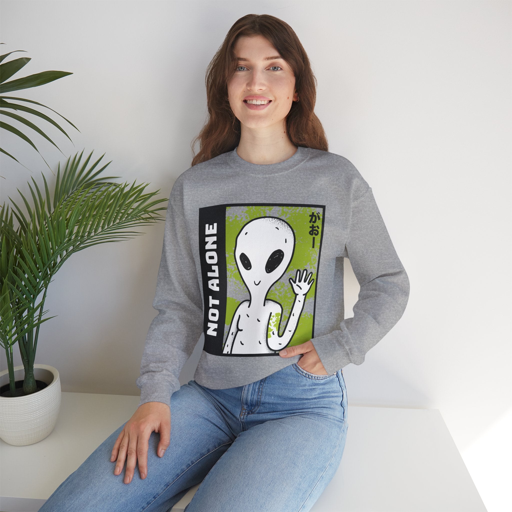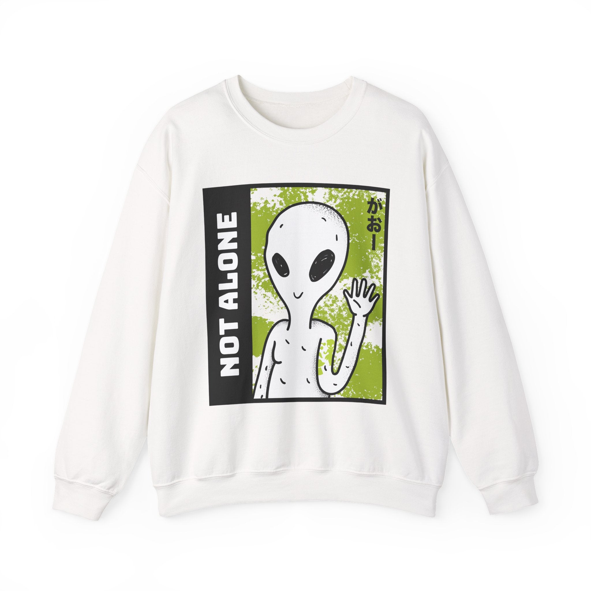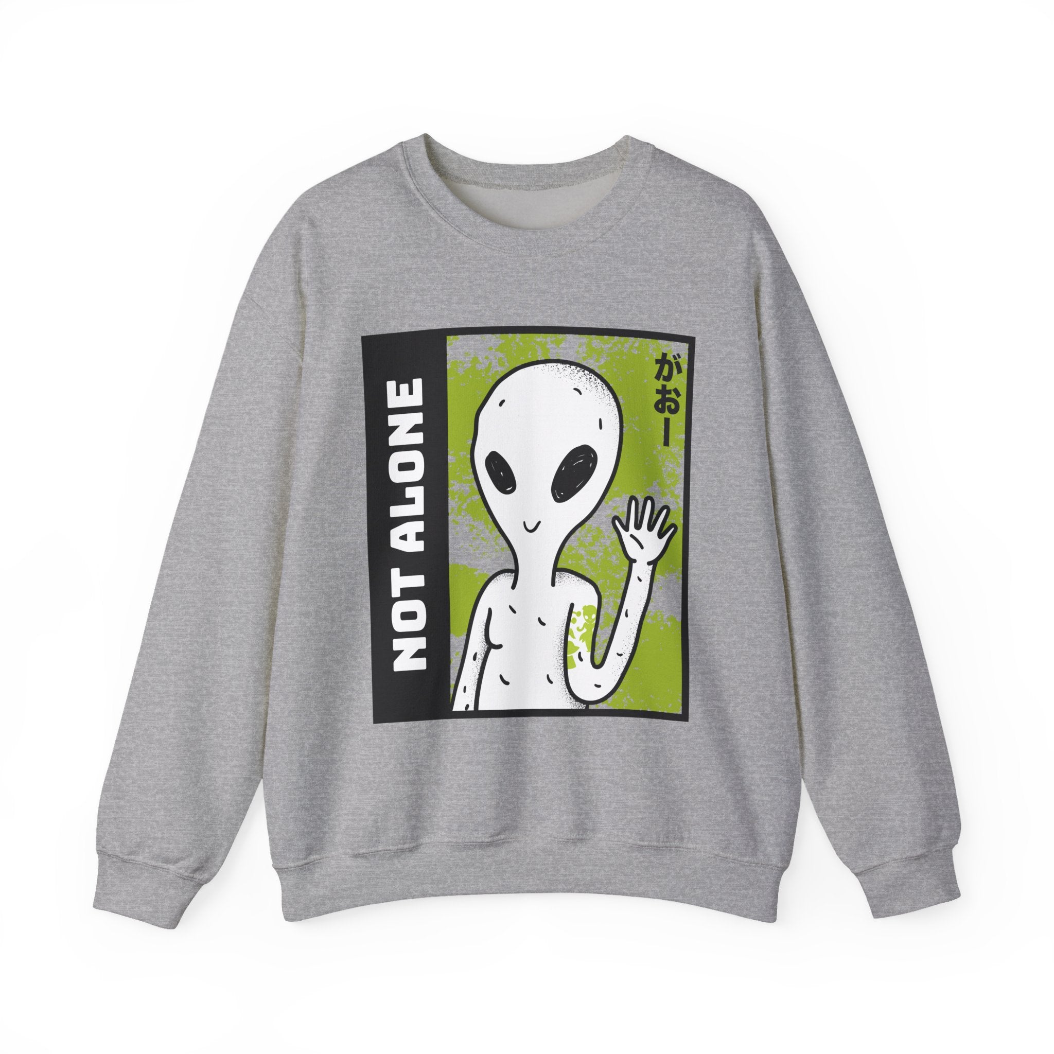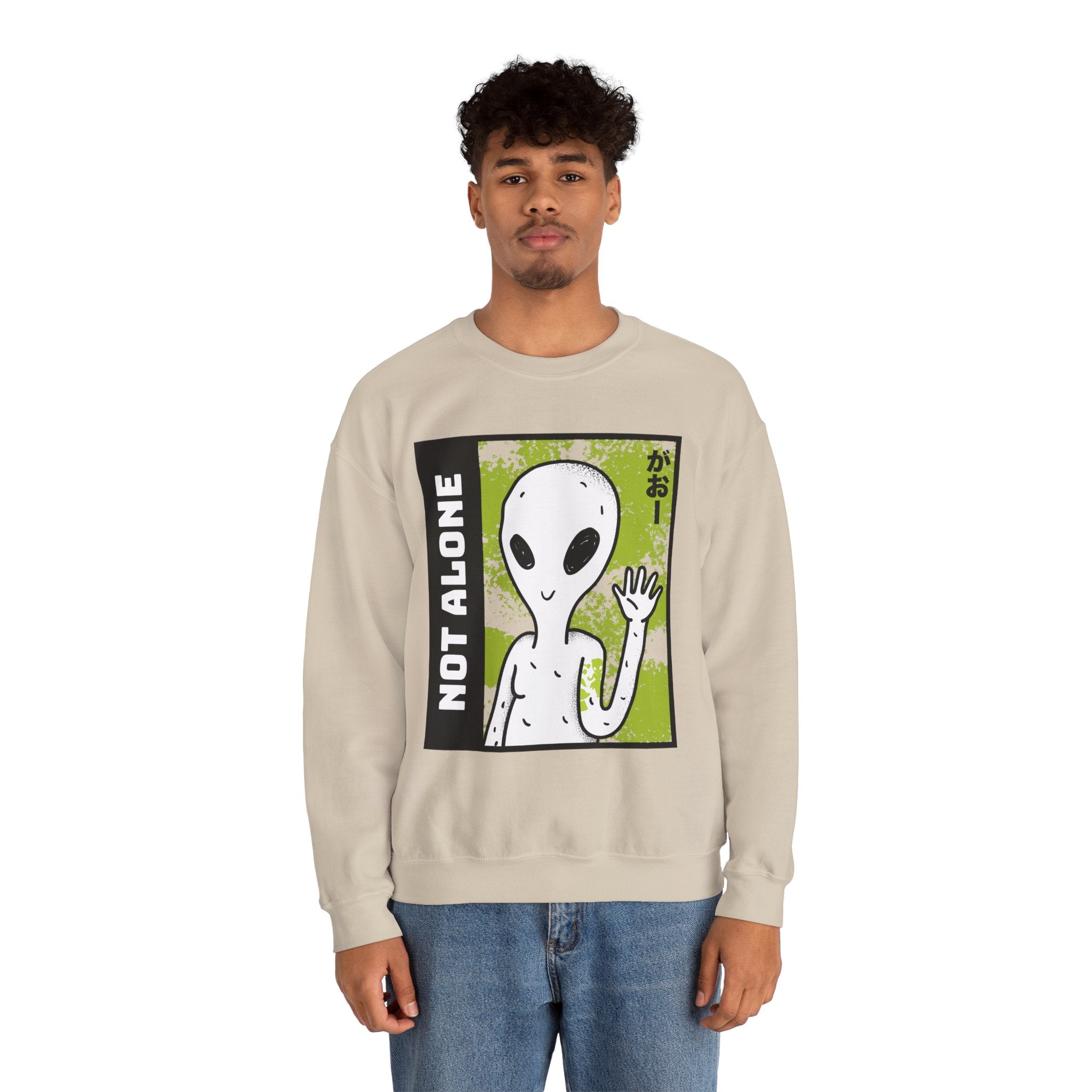 The Unisex “Not Alone” Alien Crewneck Sweatshirt blends playful extraterrestrial vibes with streetwear comfort. Featuring a friendly waving alien graphic with bold lettering, this sweatshirt makes a fun statement while keeping you warm and stylish.