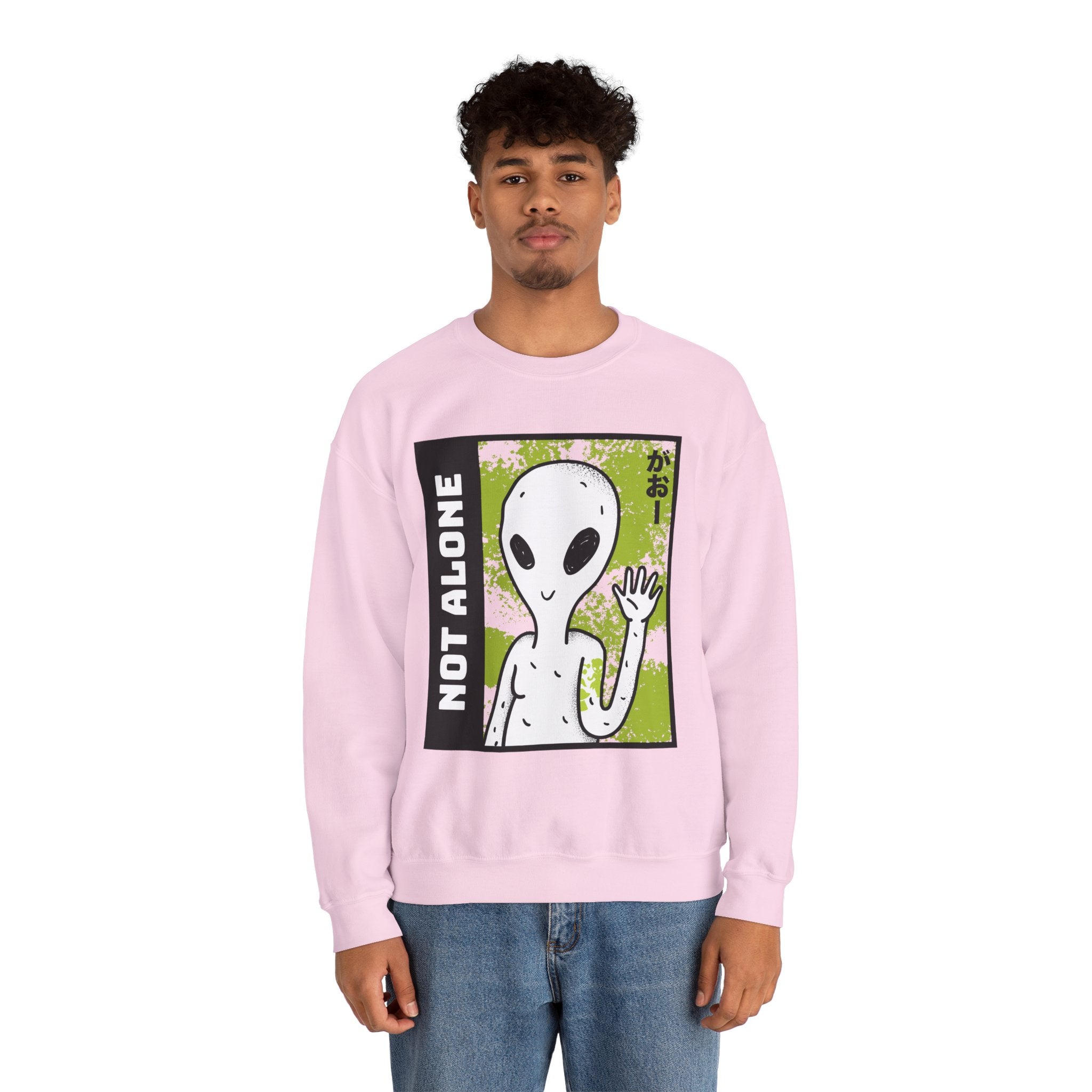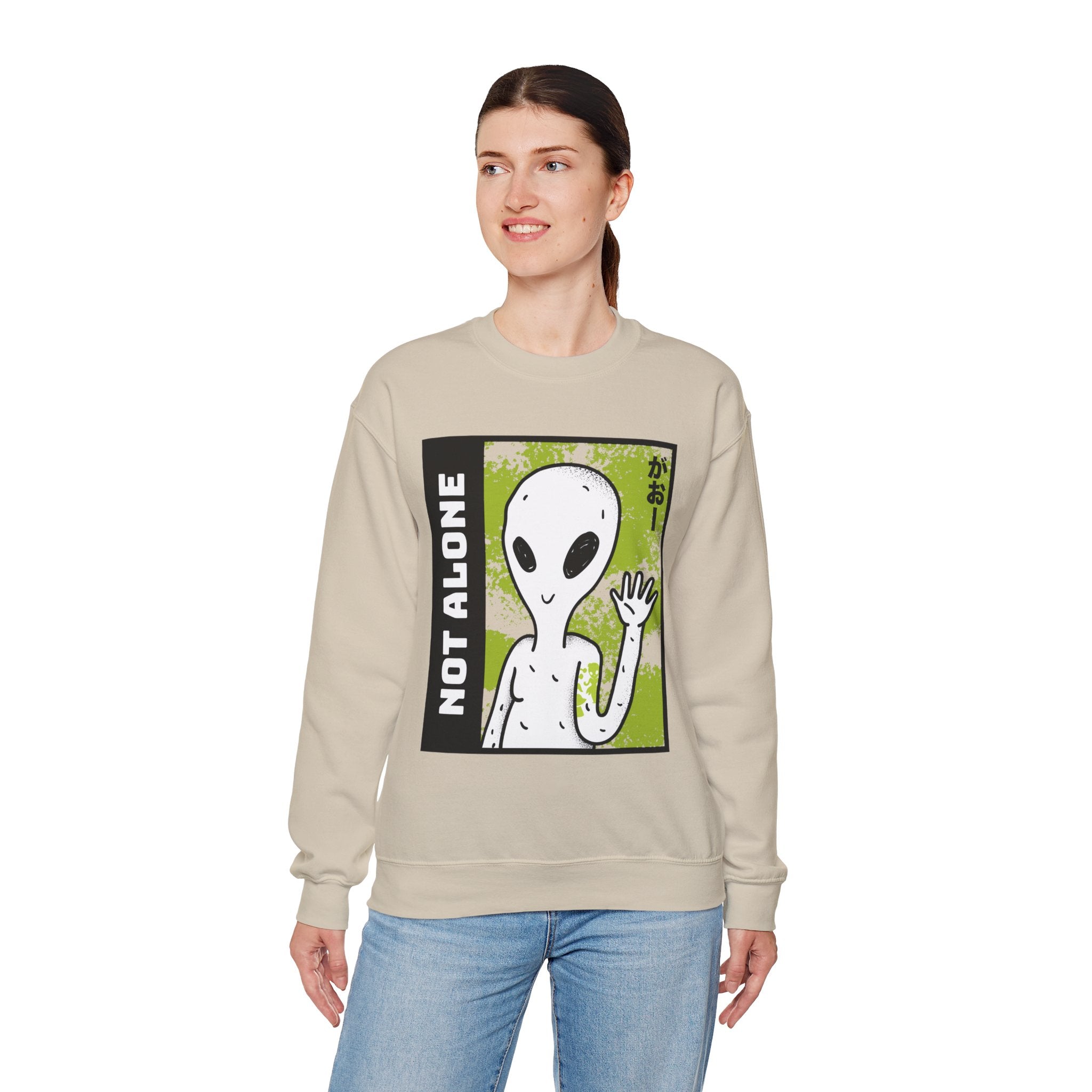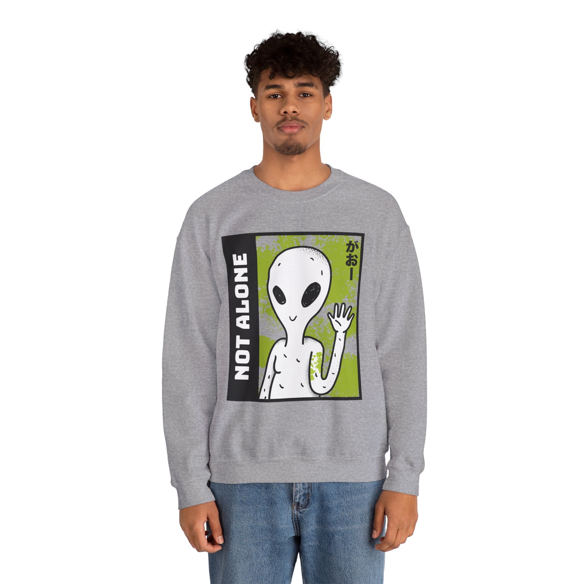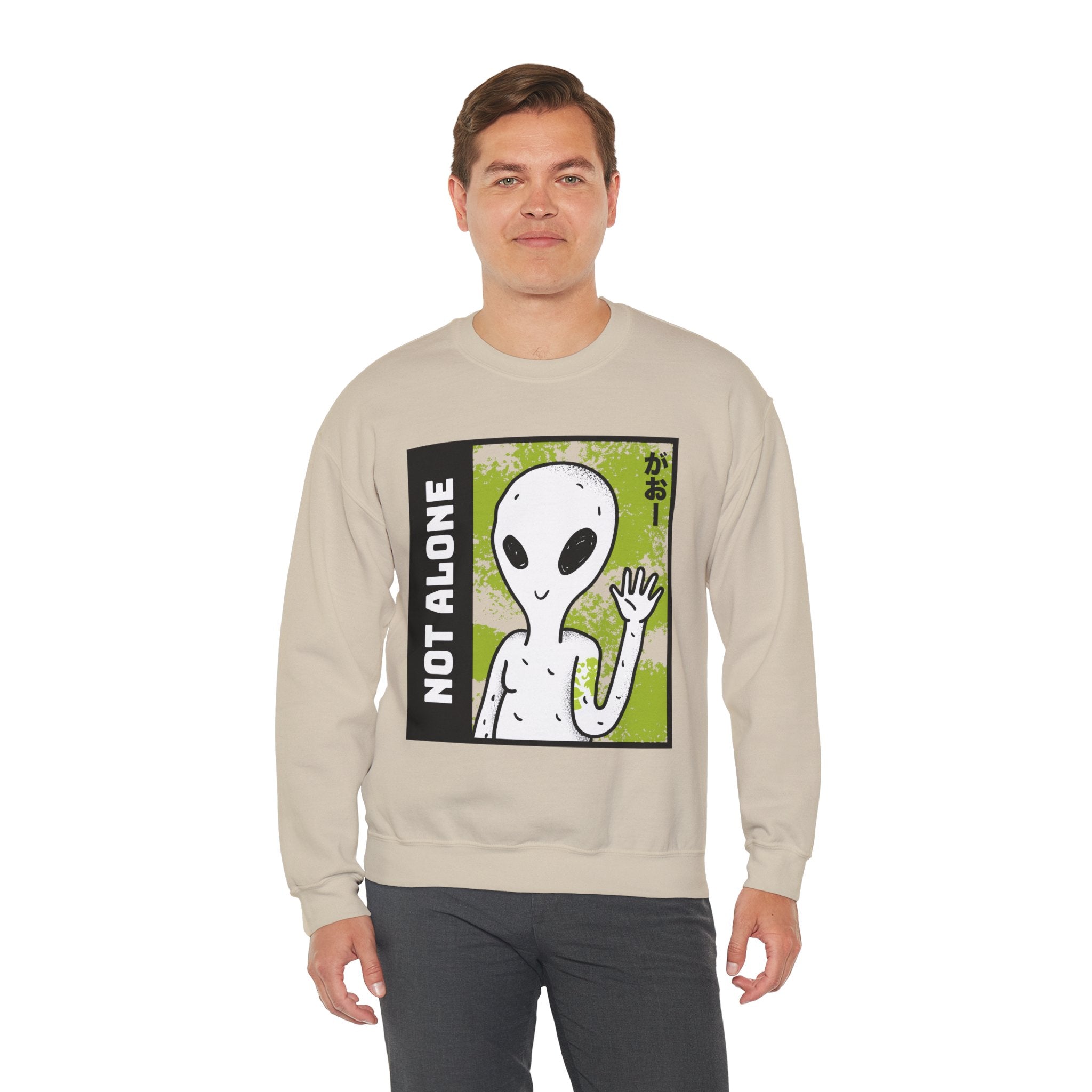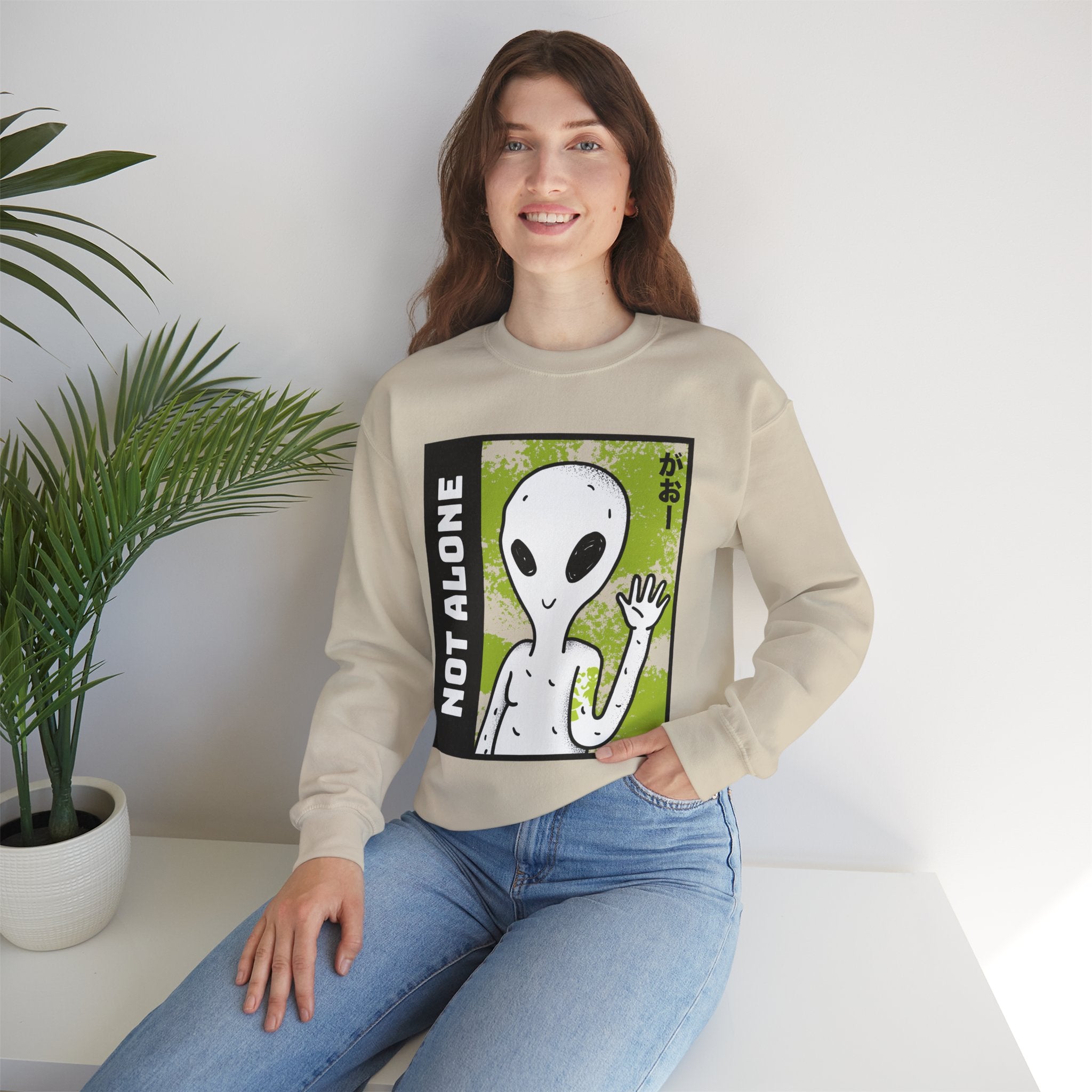 The Unisex “Not Alone” Alien Crewneck Sweatshirt blends playful extraterrestrial vibes with streetwear comfort. Featuring a friendly waving alien graphic with bold lettering, this sweatshirt makes a fun statement while keeping you warm and stylish.