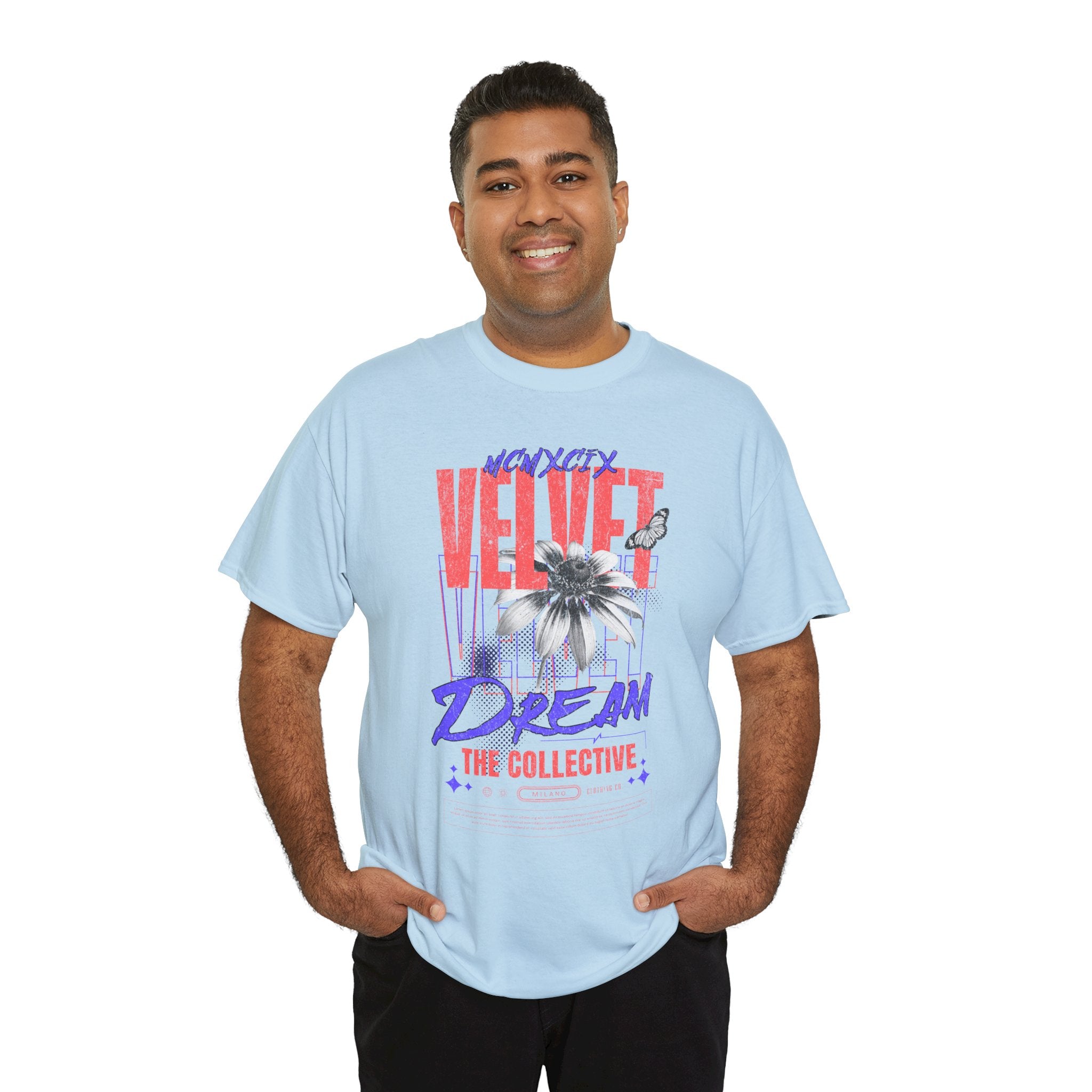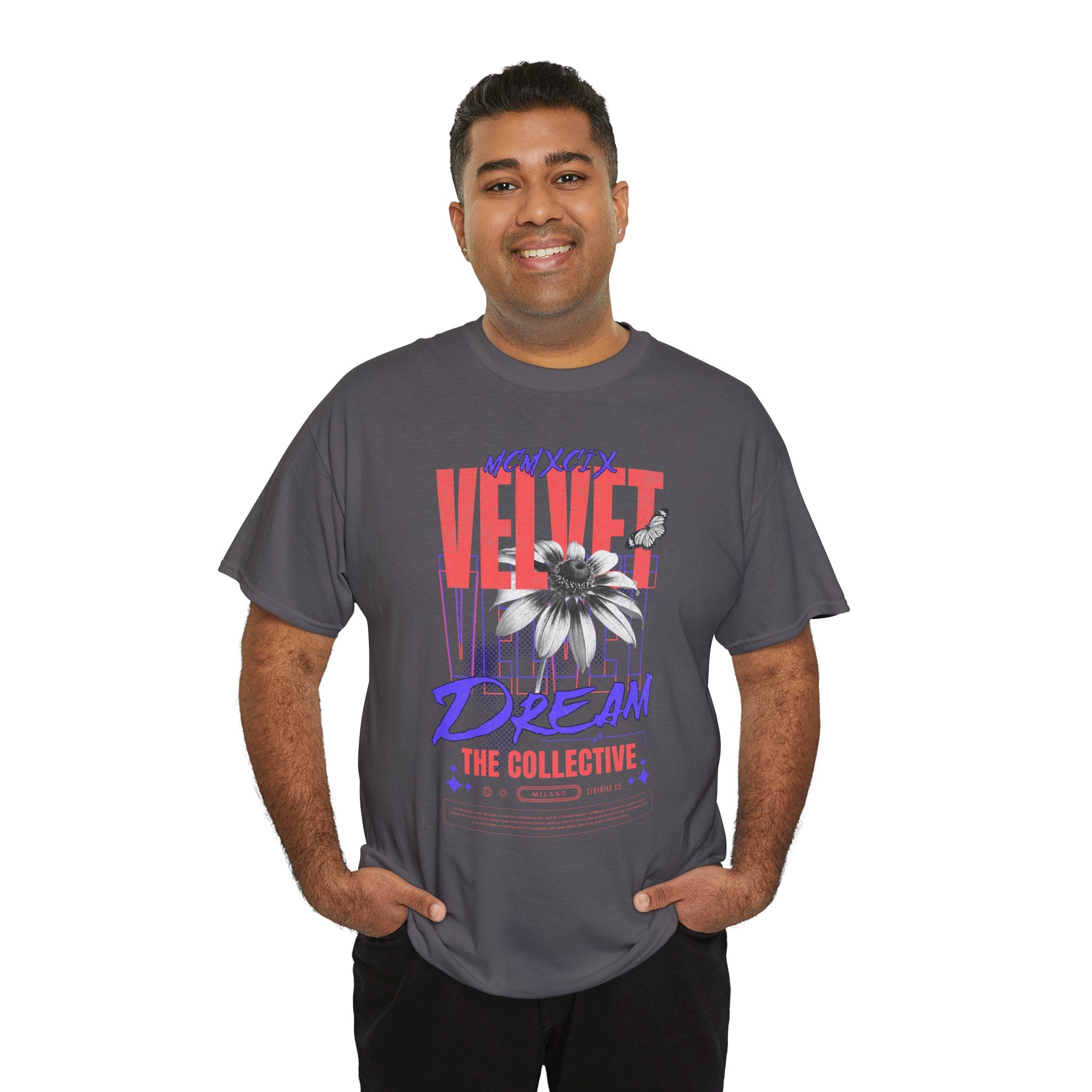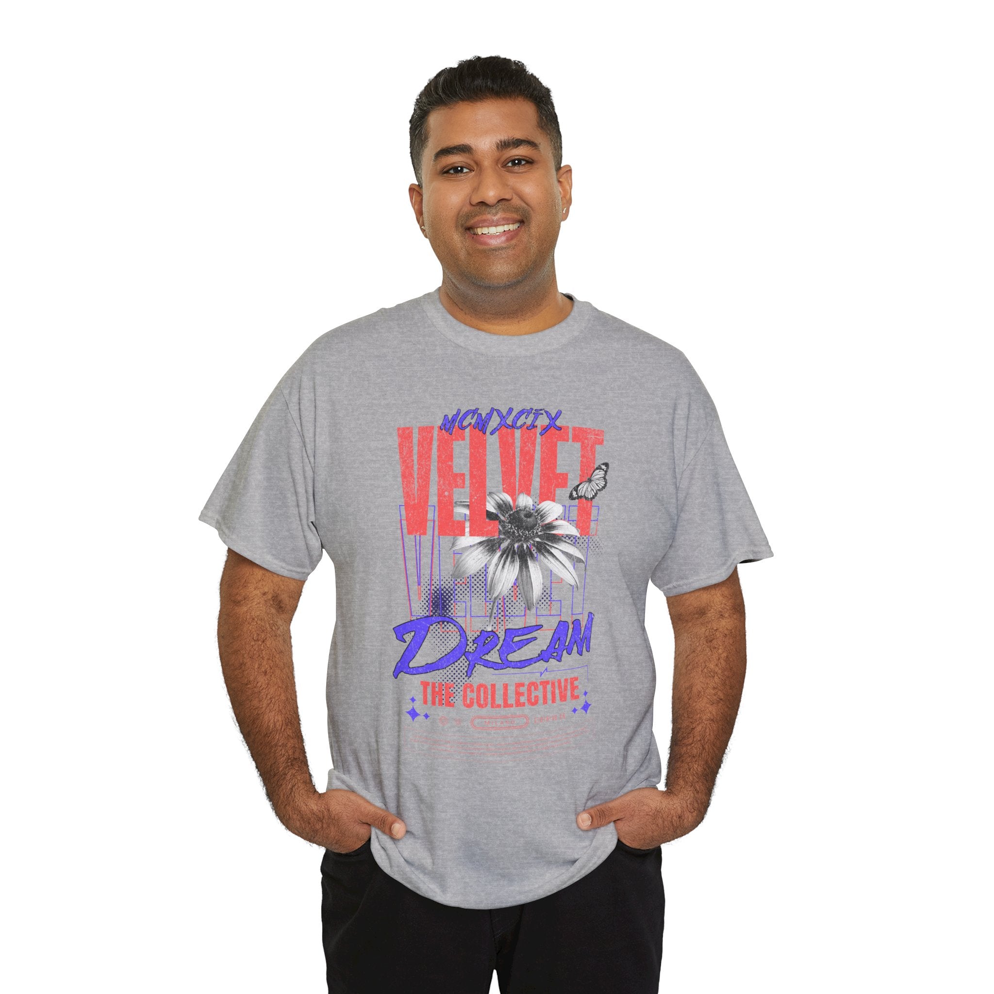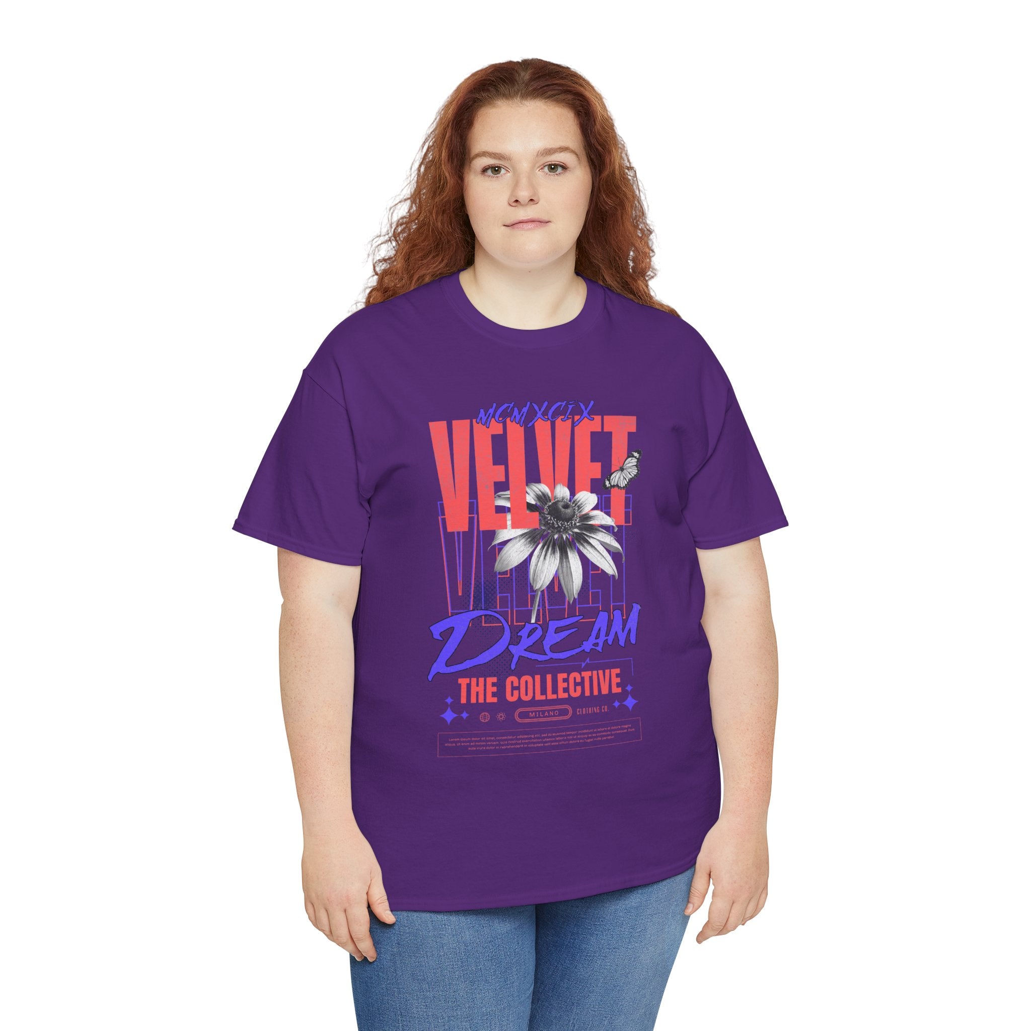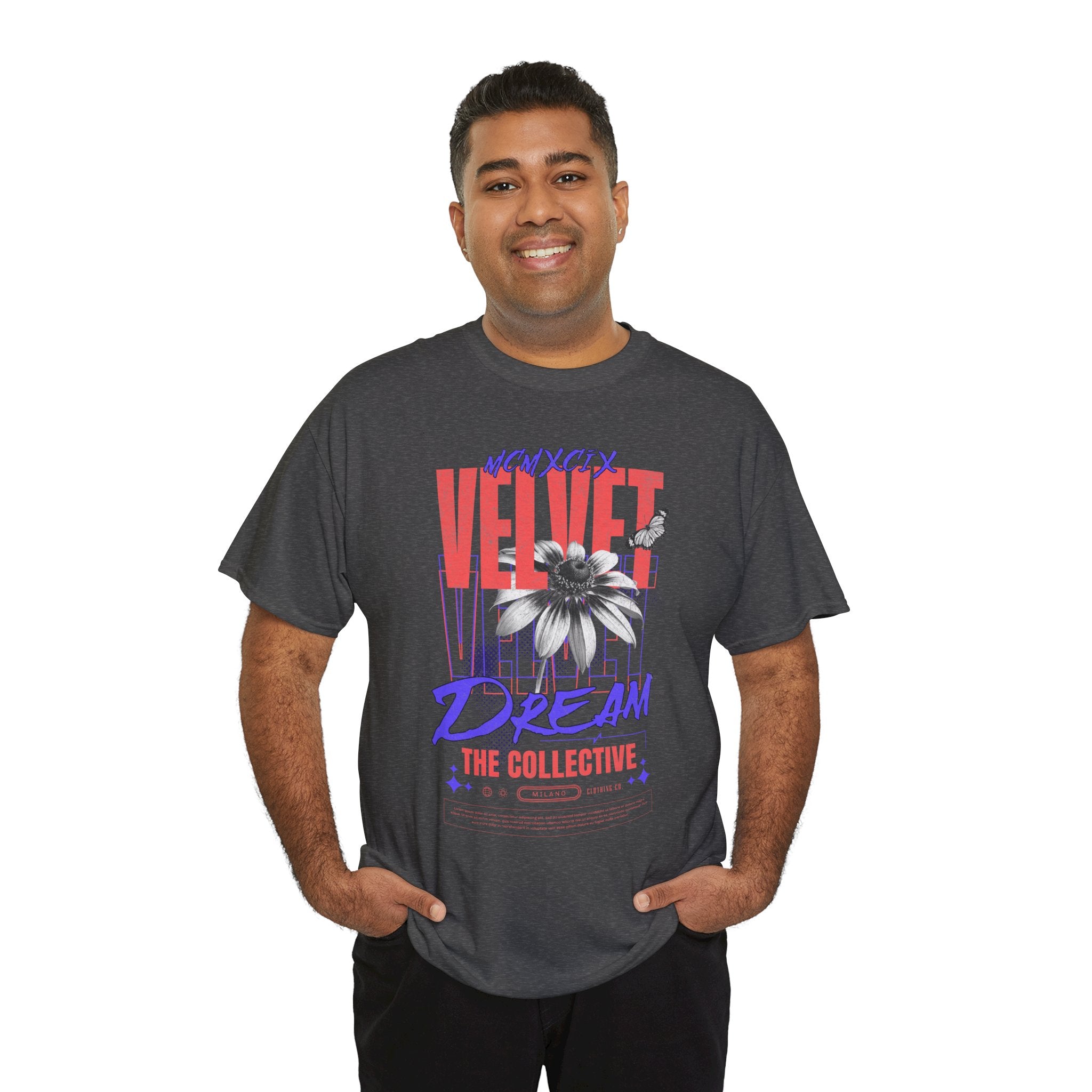 Step into the world of artistic expression with the Velvet Dream The Collective Unisex Heavy Cotton Tee. Featuring bold typography and a striking monochrome flower paired with vibrant red and purple accents, this design captures the spirit of creativity, individuality, and modern streetwear culture.
