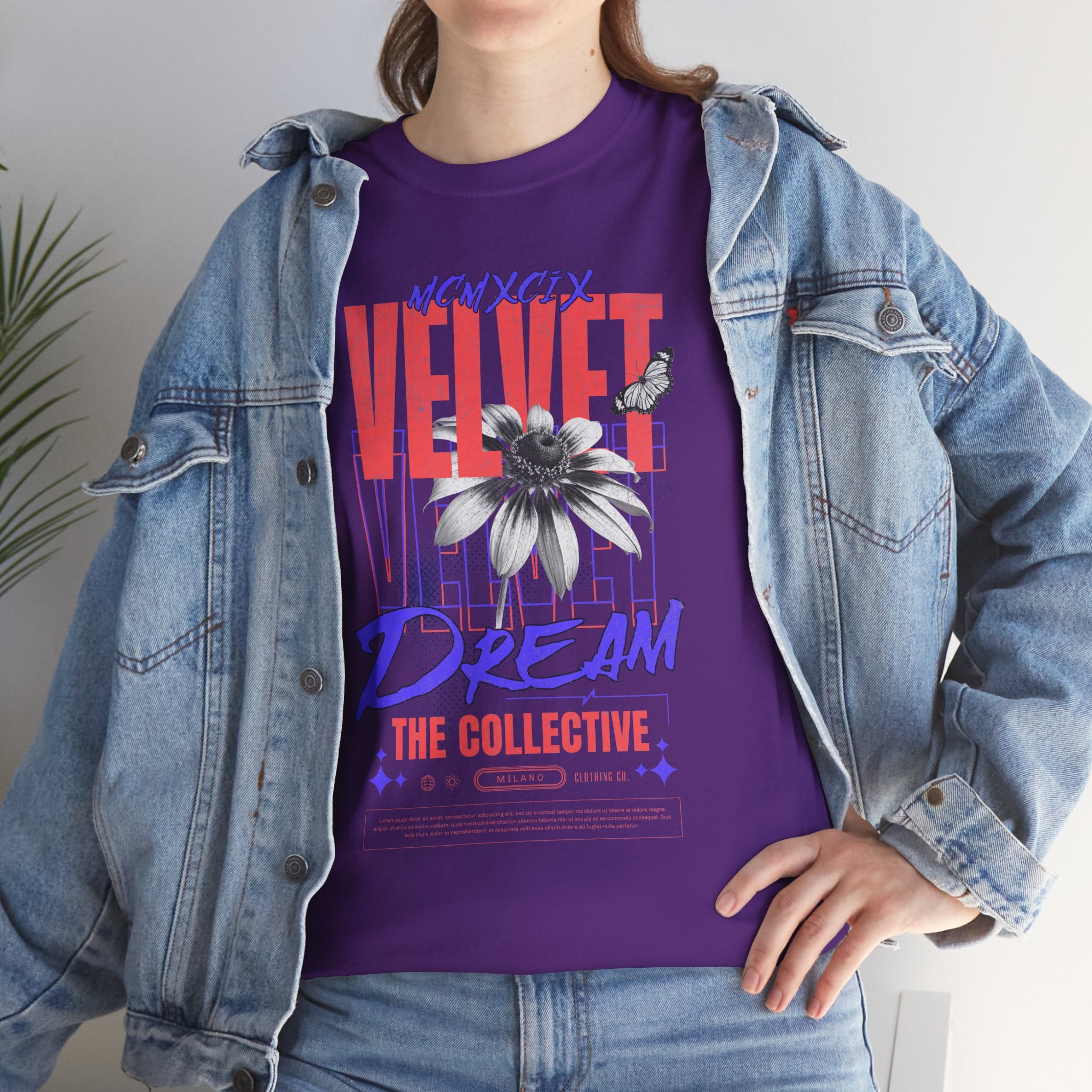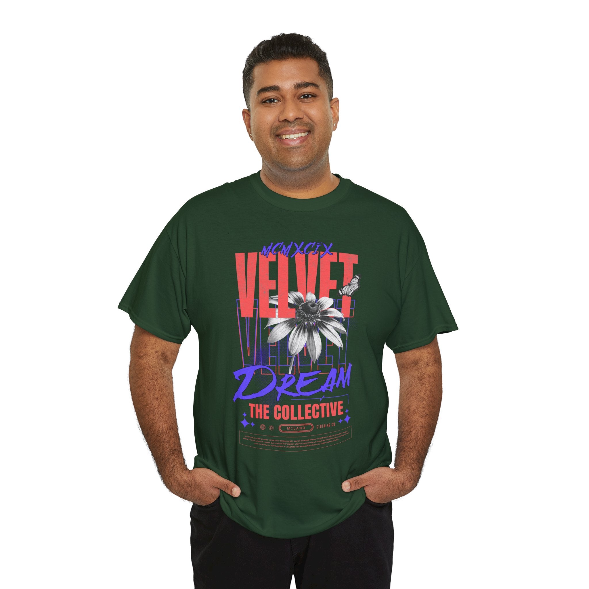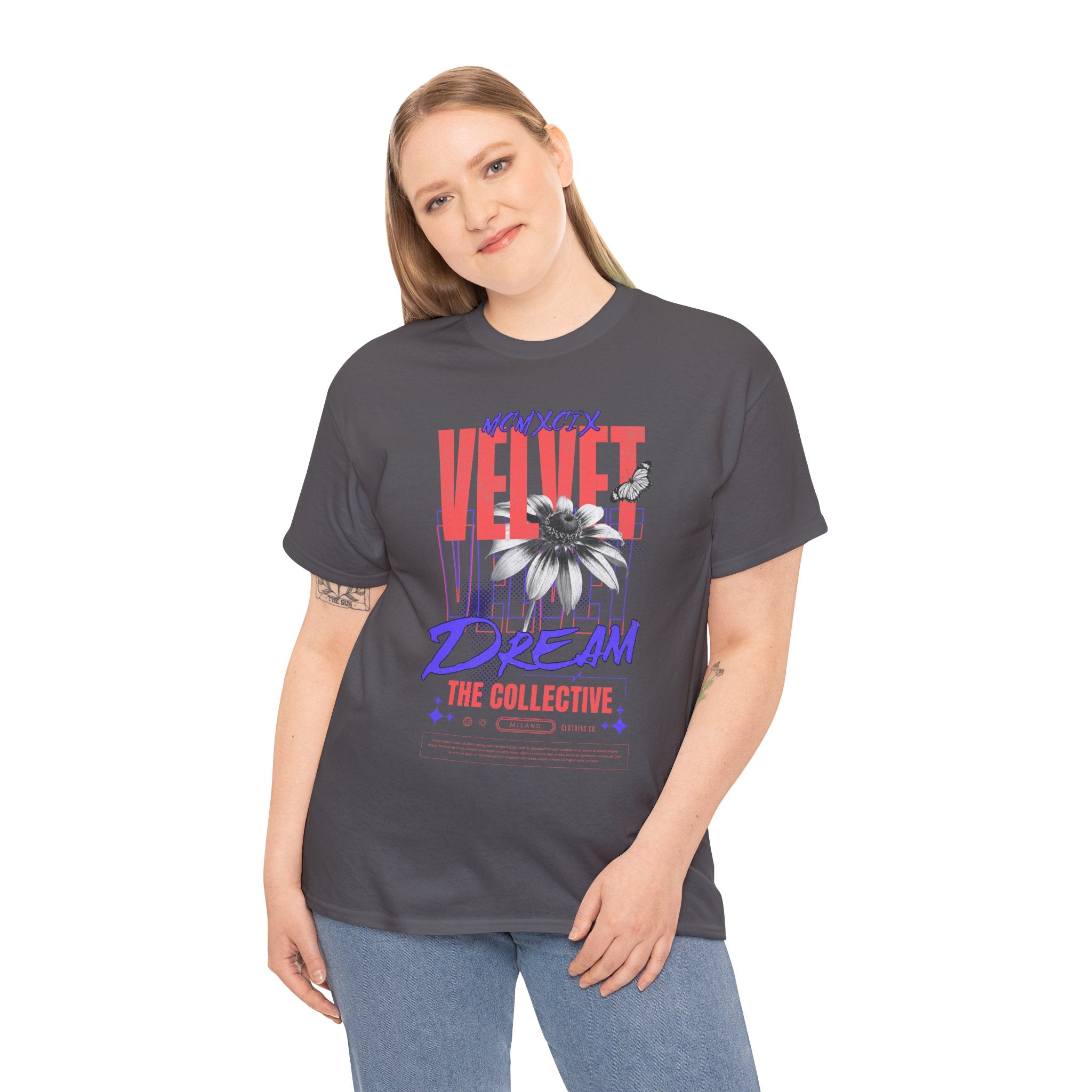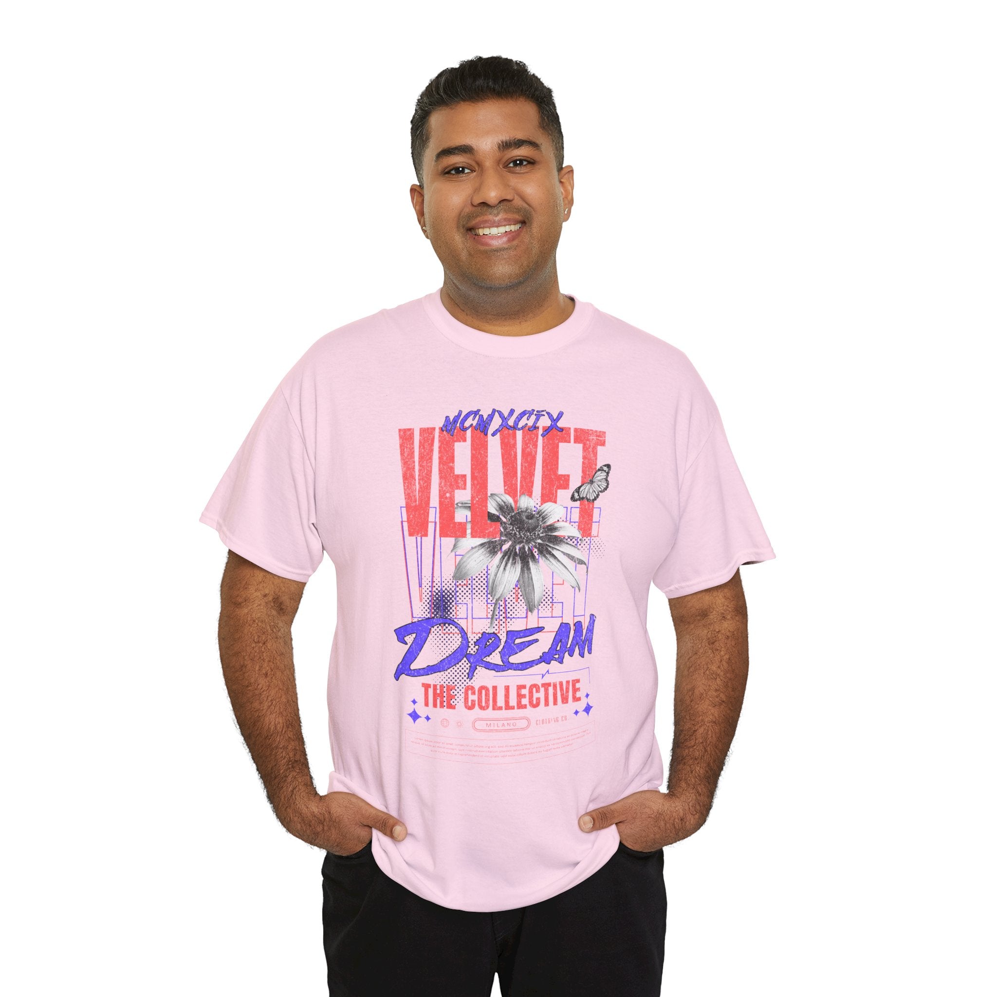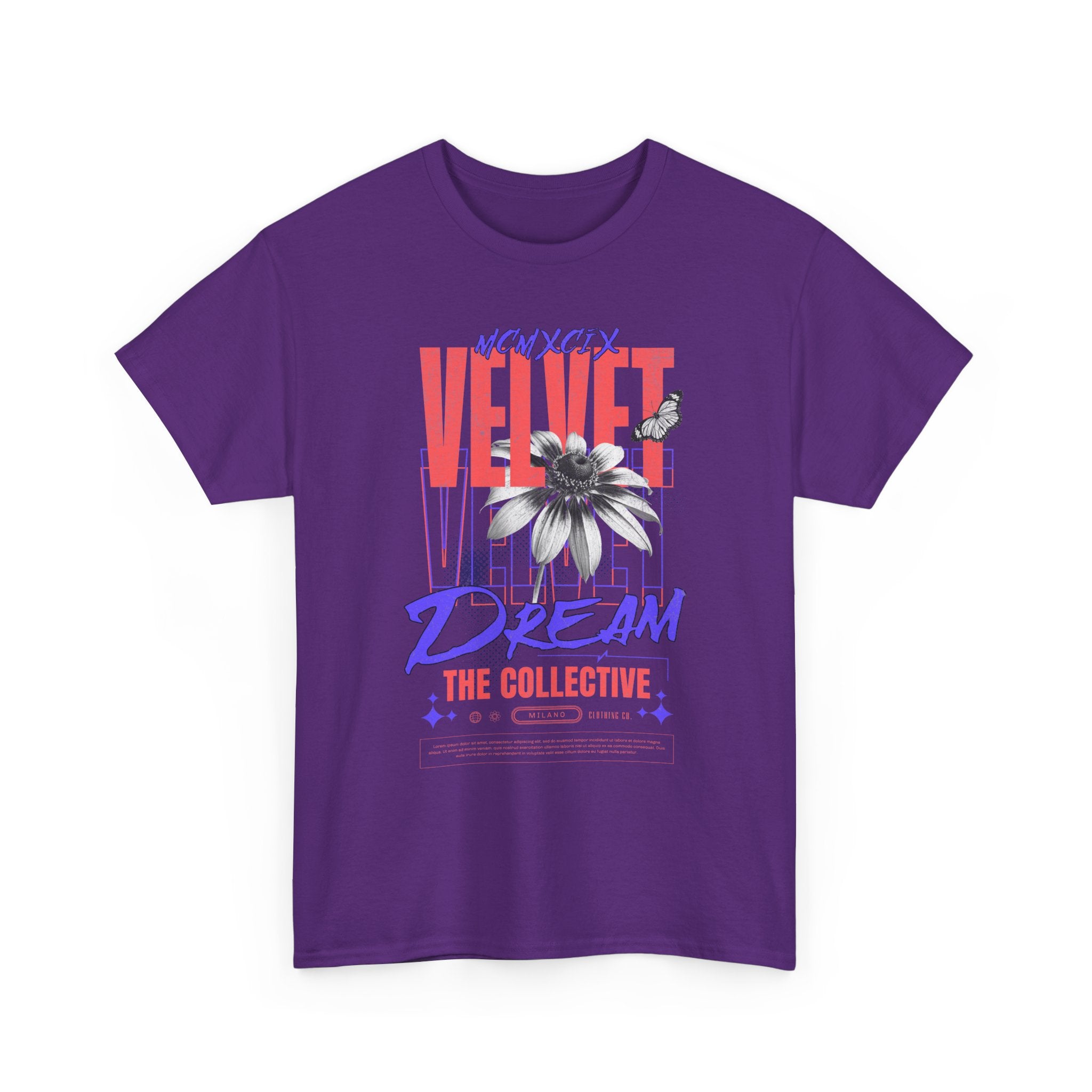 Step into the world of artistic expression with the Velvet Dream The Collective Unisex Heavy Cotton Tee. Featuring bold typography and a striking monochrome flower paired with vibrant red and purple accents, this design captures the spirit of creativity, individuality, and modern streetwear culture.