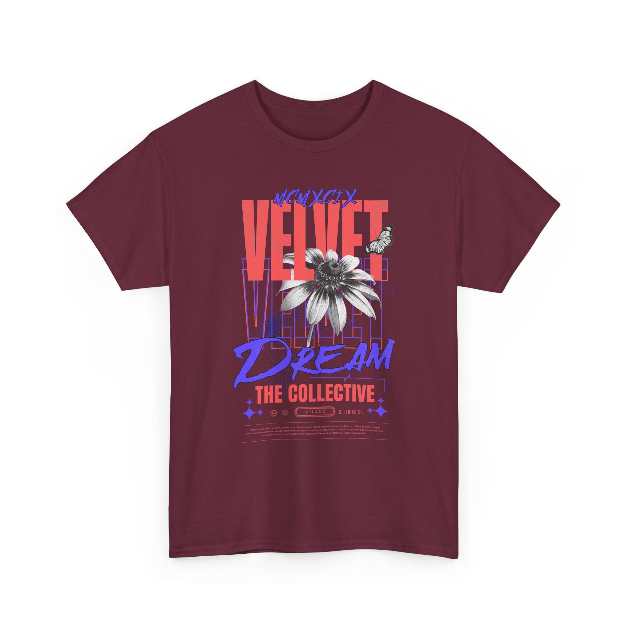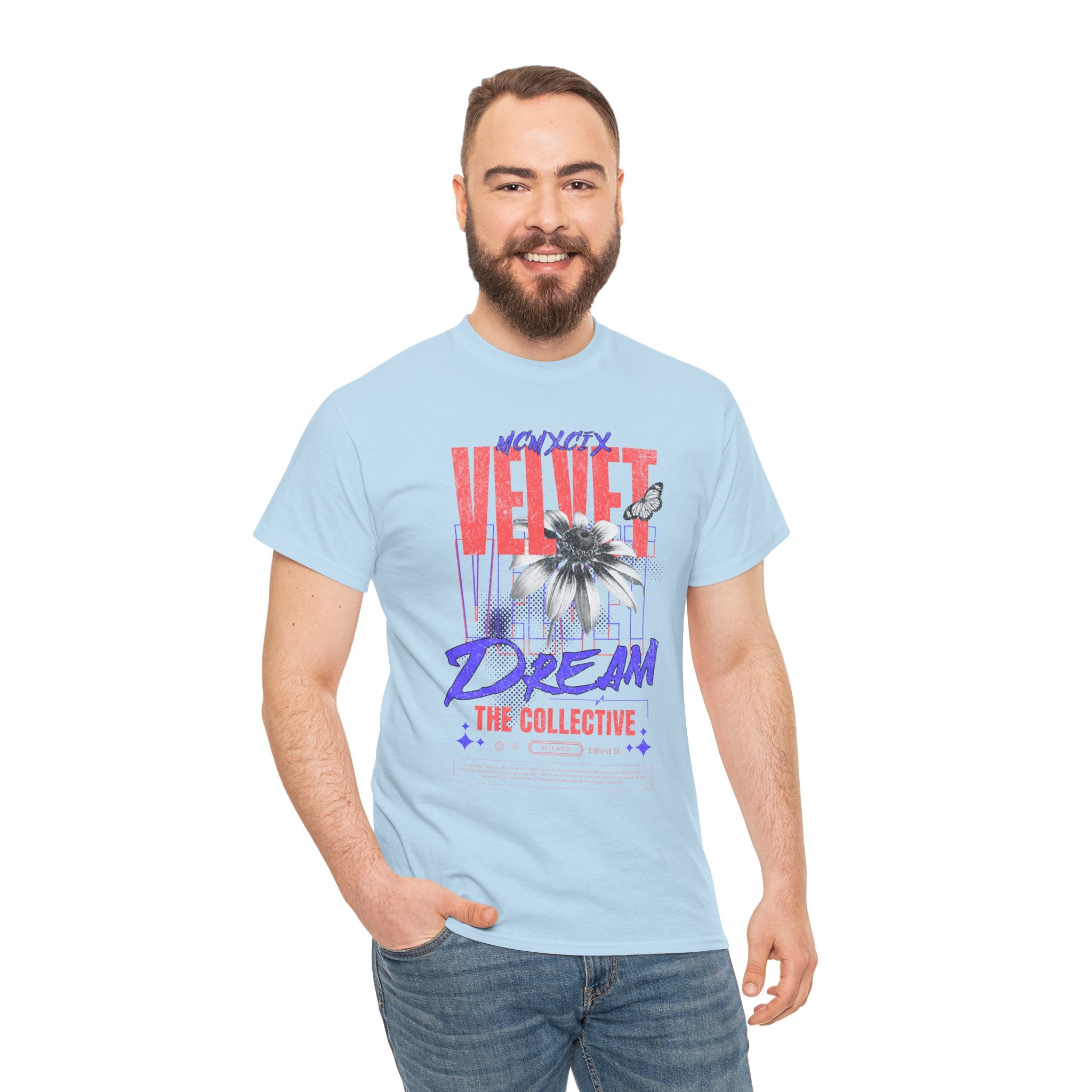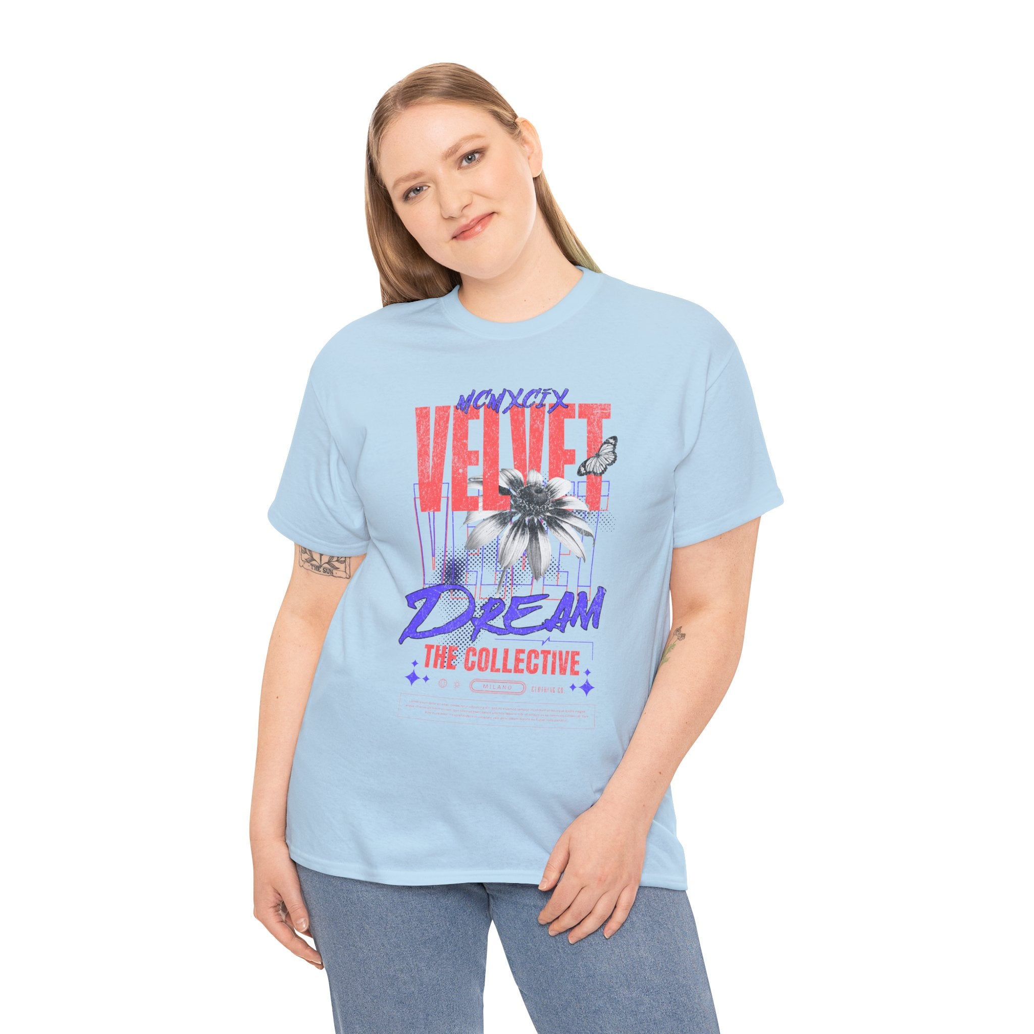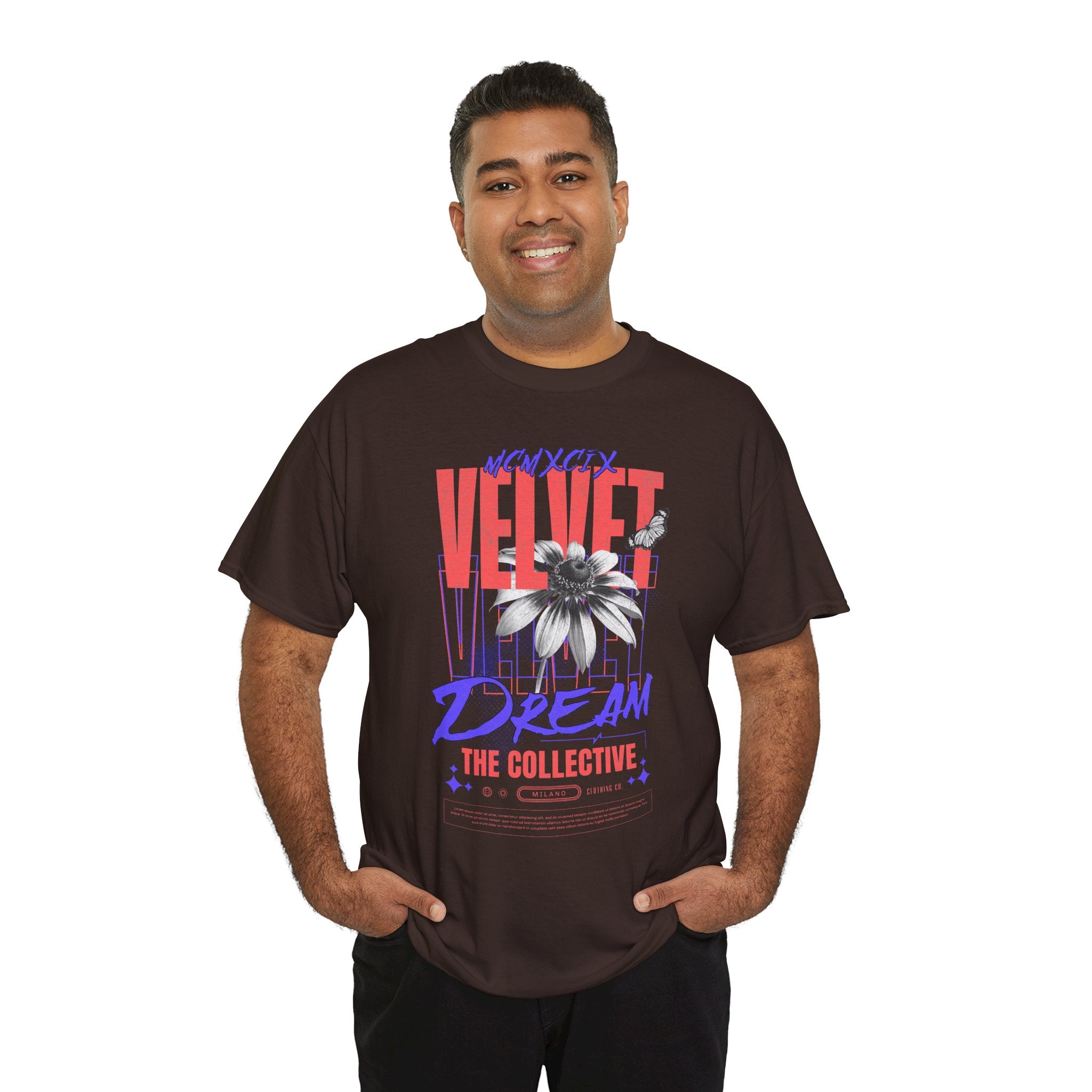 Step into the world of artistic expression with the Velvet Dream The Collective Unisex Heavy Cotton Tee. Featuring bold typography and a striking monochrome flower paired with vibrant red and purple accents, this design captures the spirit of creativity, individuality, and modern streetwear culture.