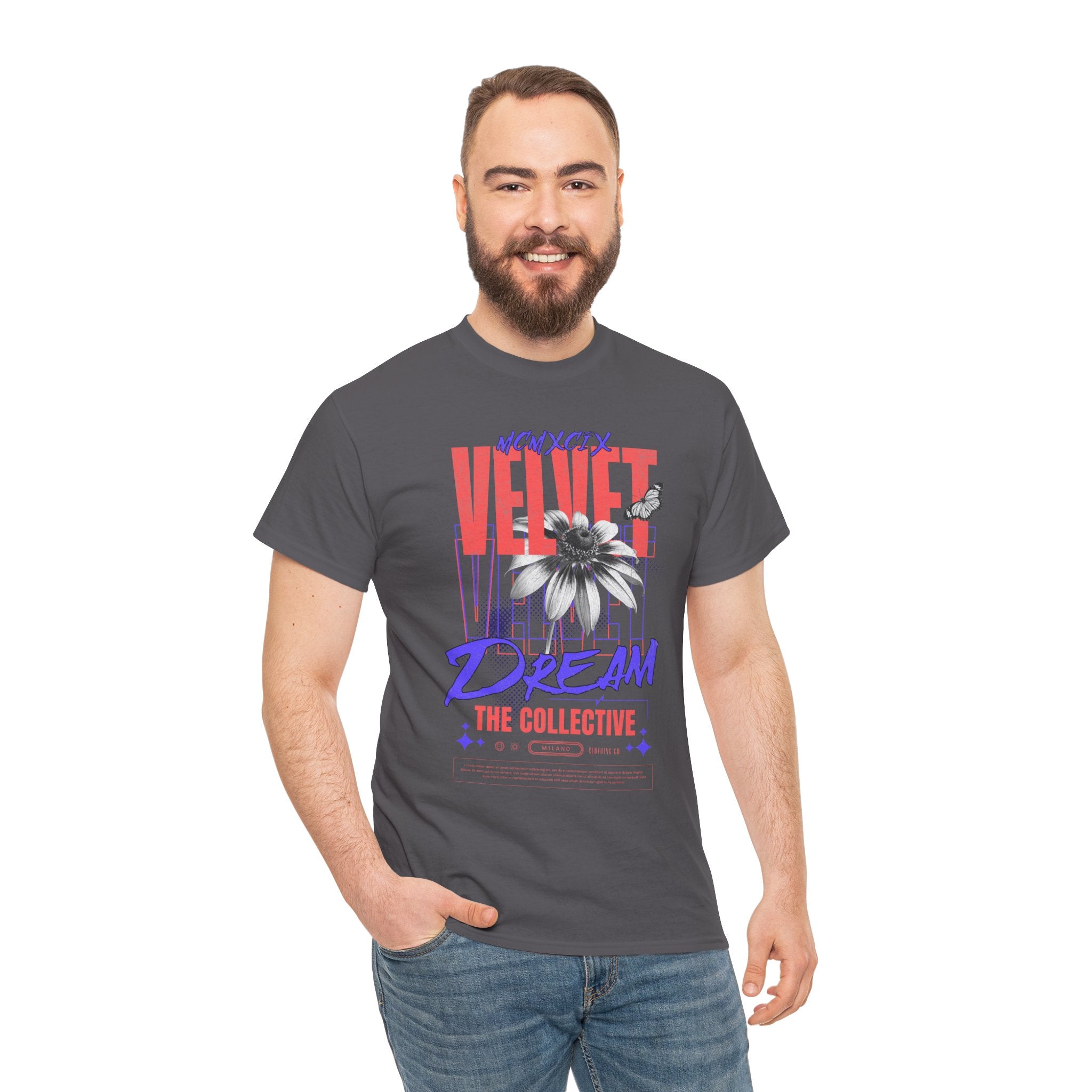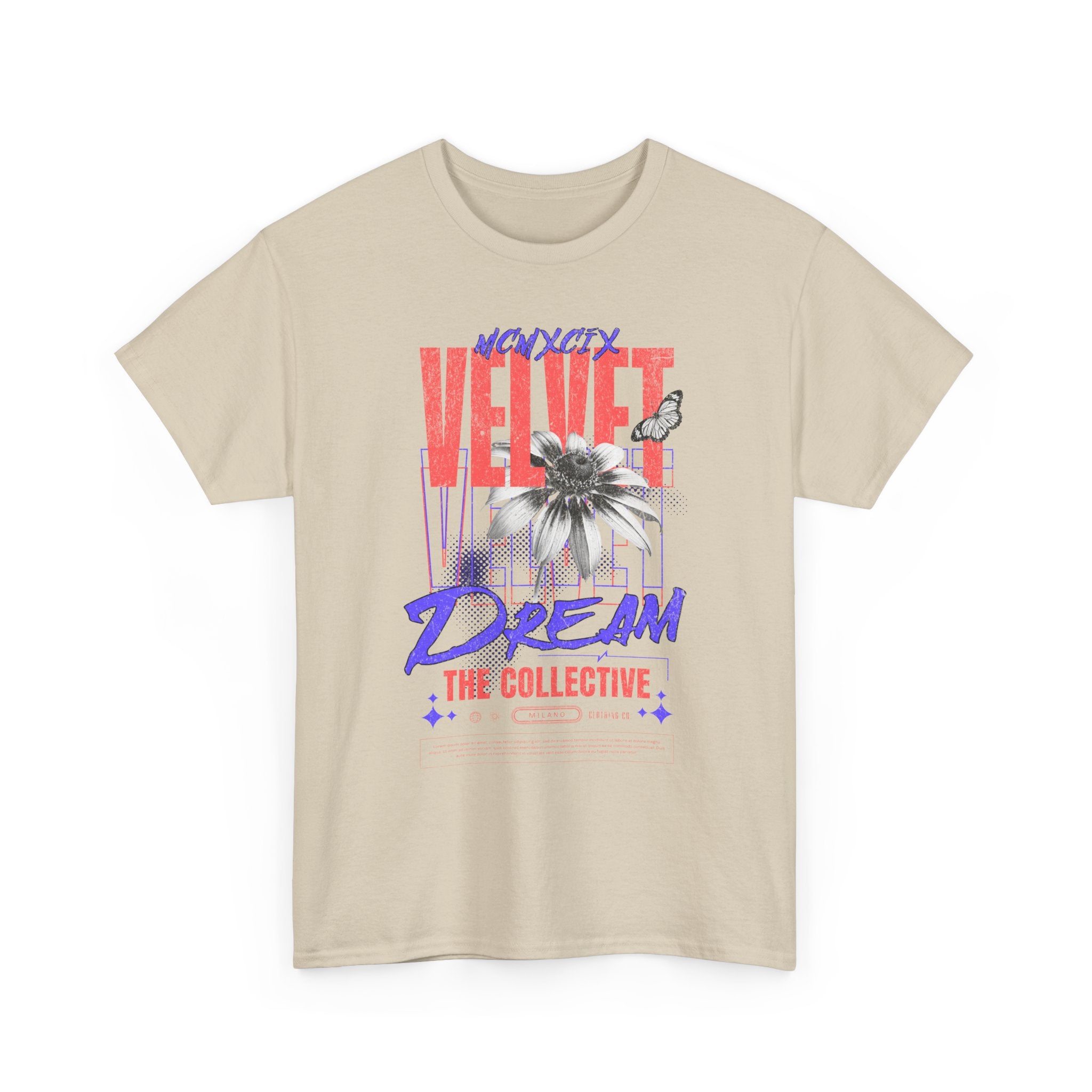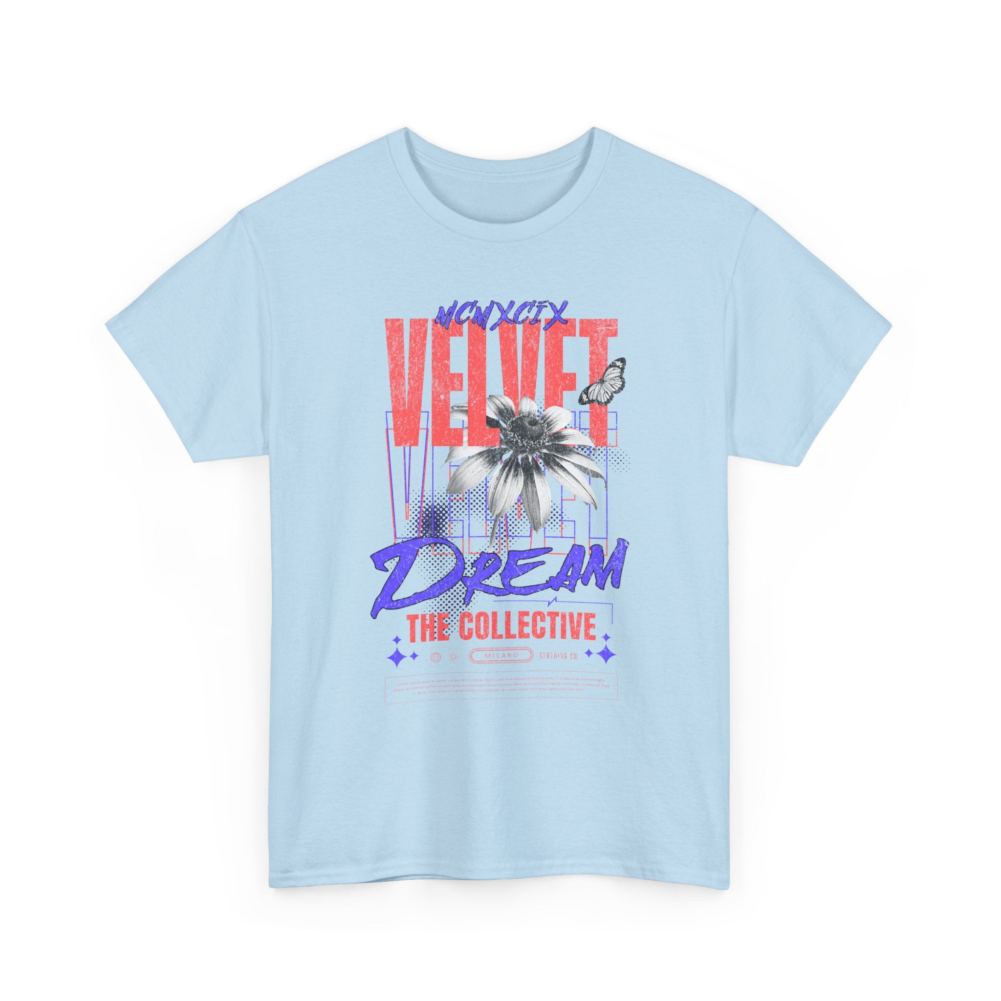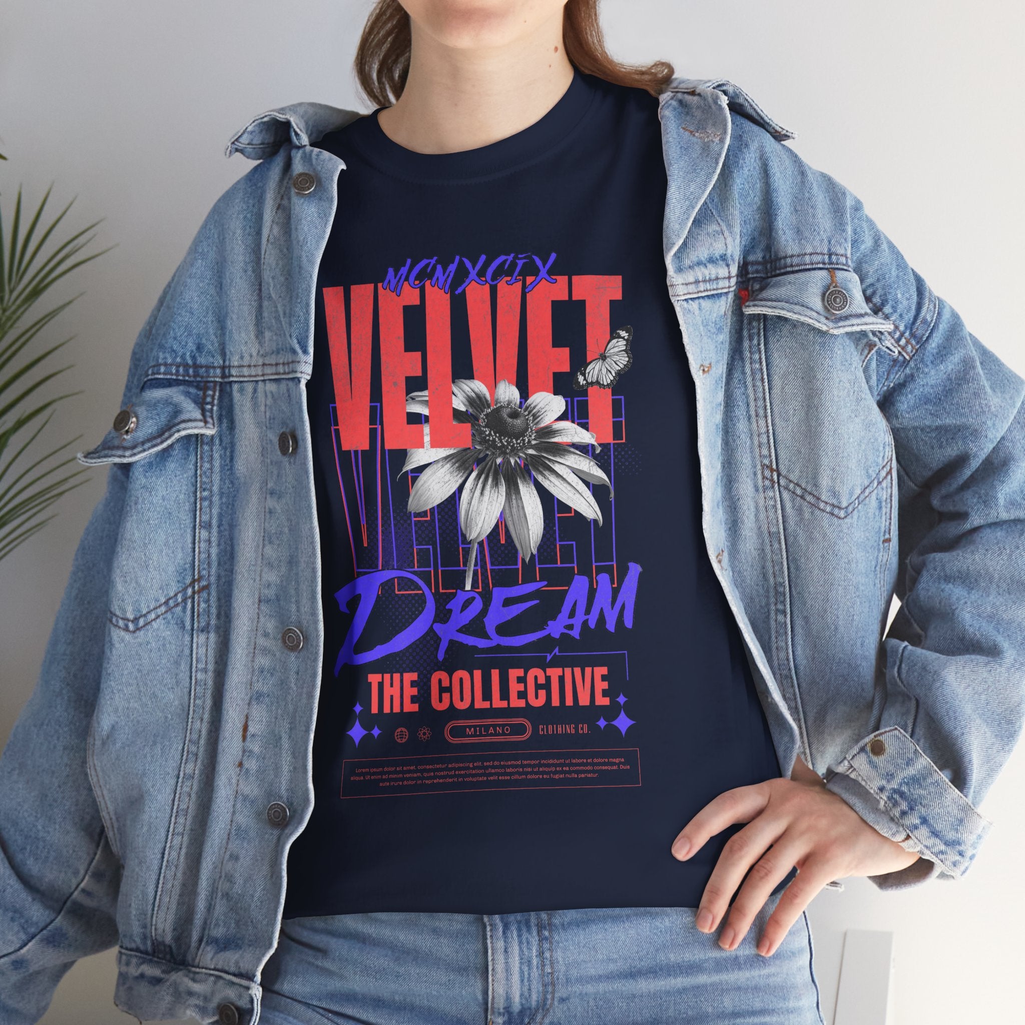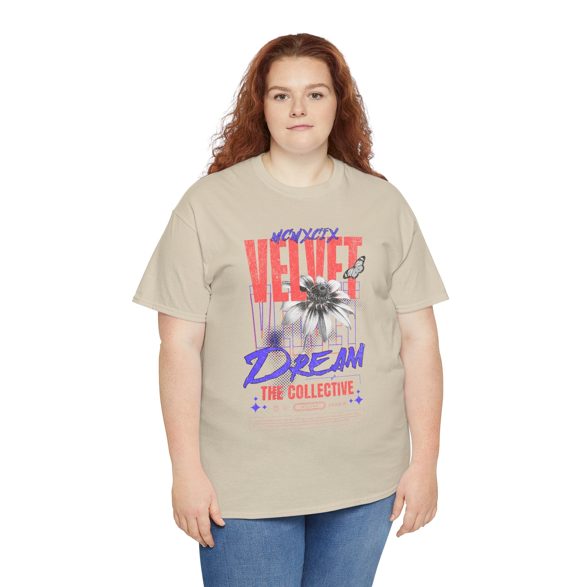 Step into the world of artistic expression with the Velvet Dream The Collective Unisex Heavy Cotton Tee. Featuring bold typography and a striking monochrome flower paired with vibrant red and purple accents, this design captures the spirit of creativity, individuality, and modern streetwear culture.