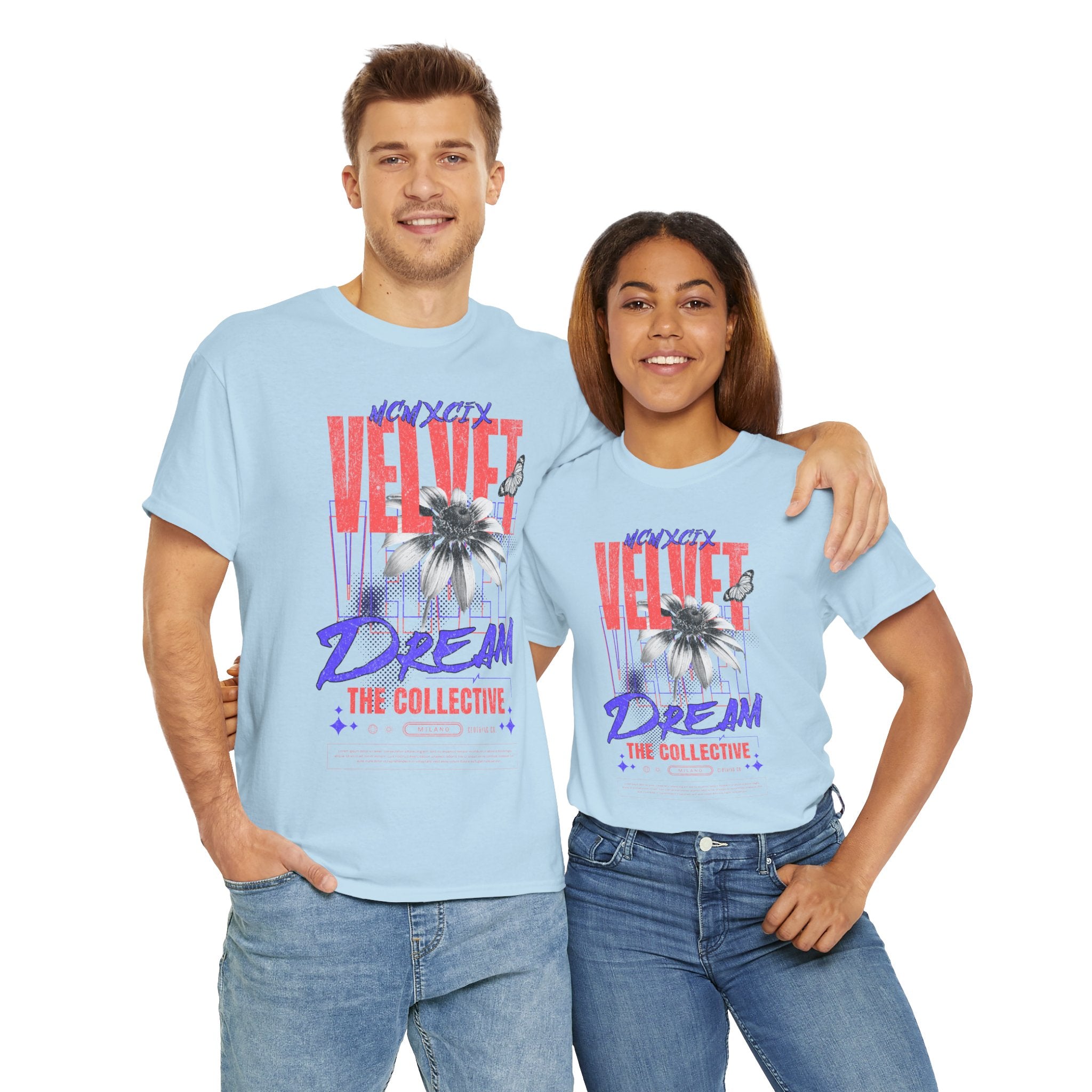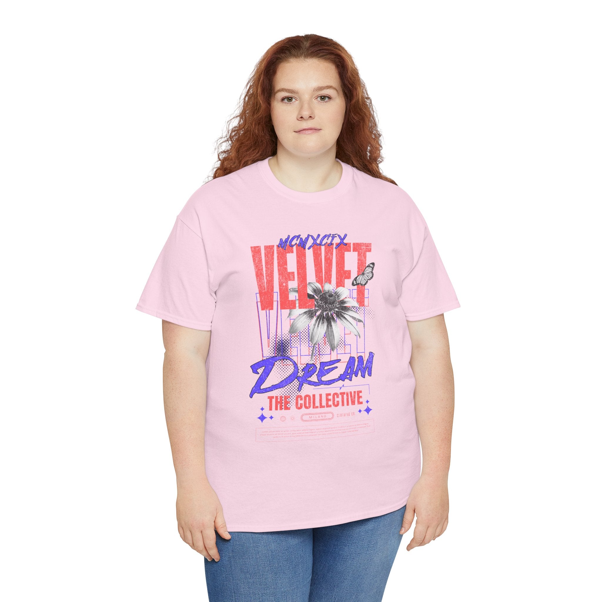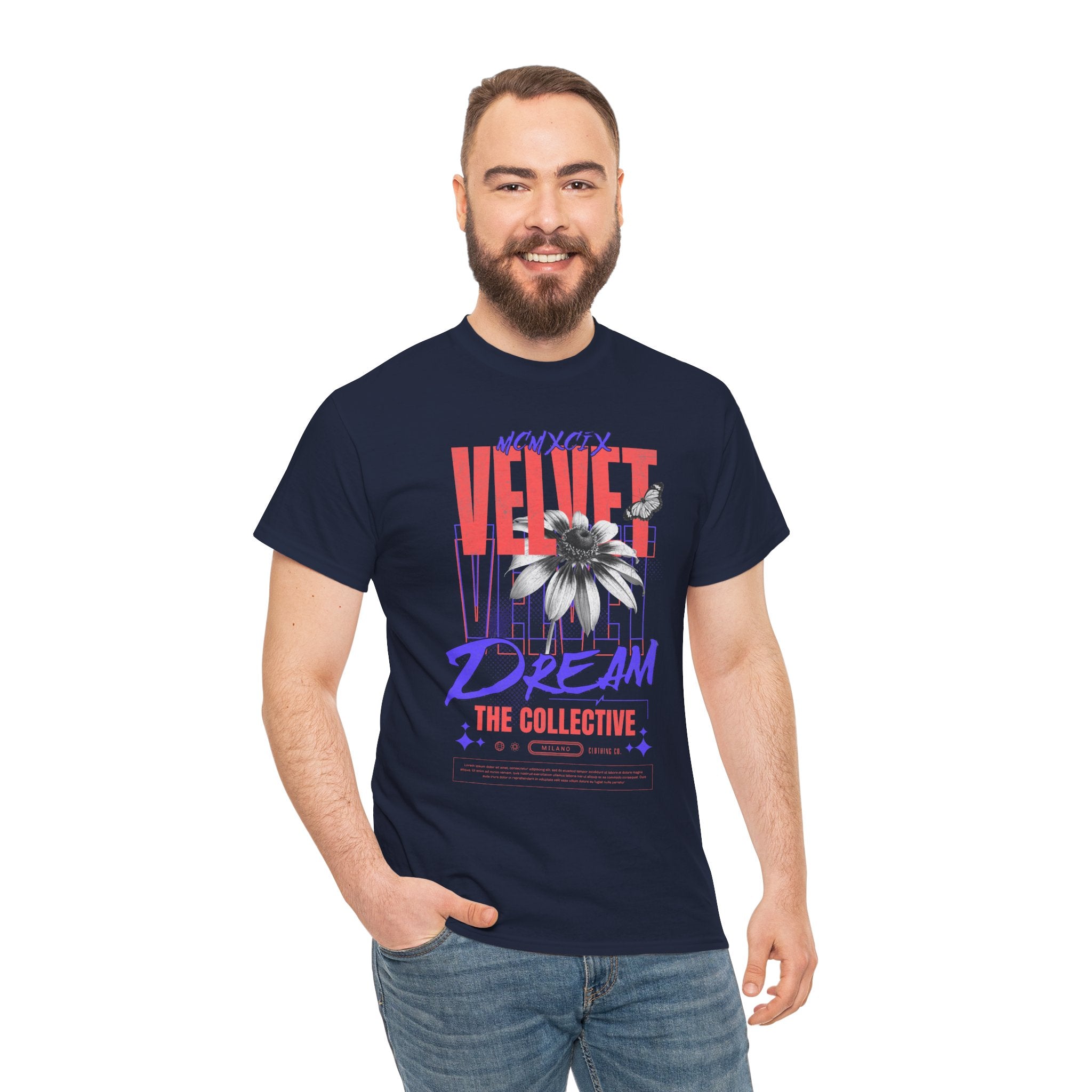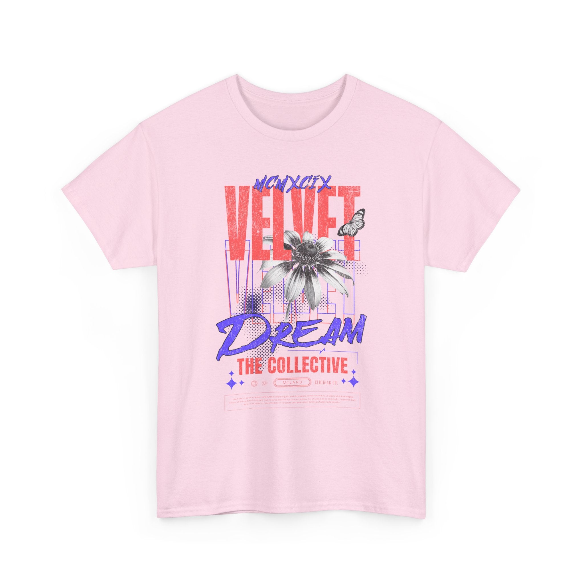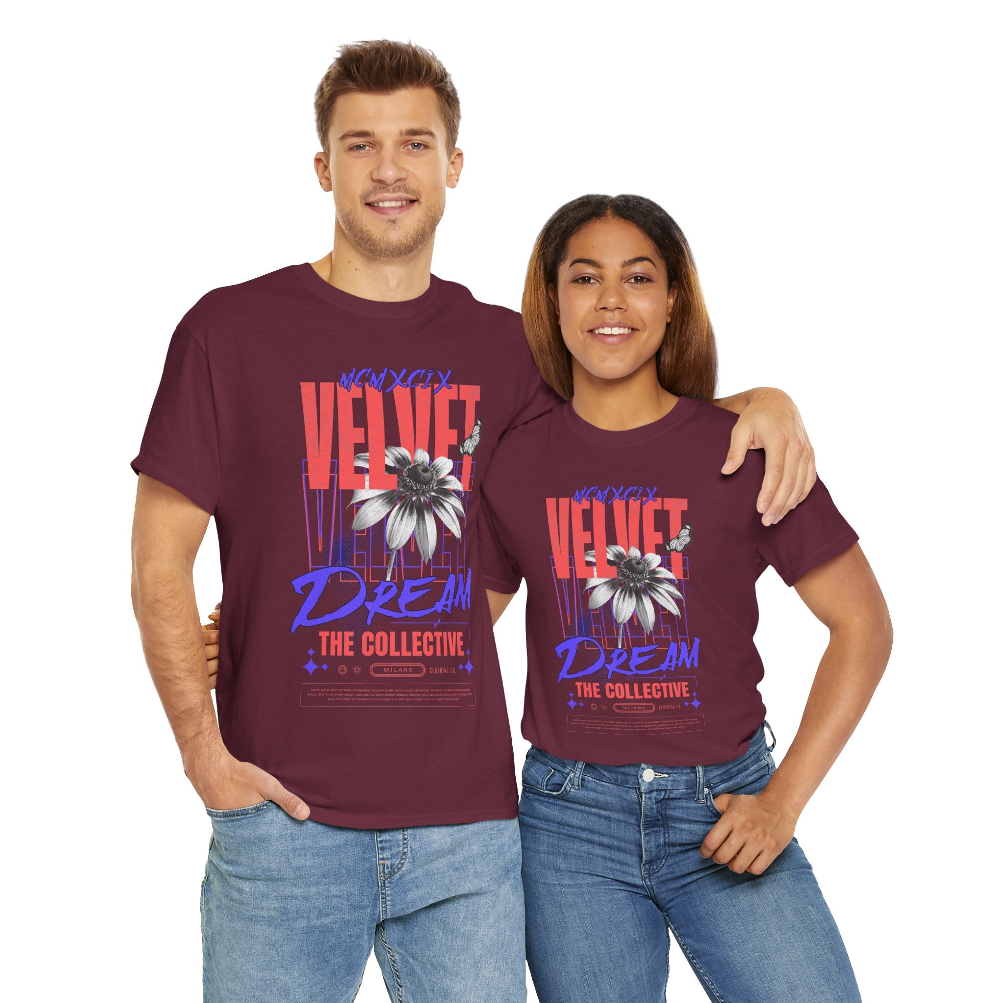 Step into the world of artistic expression with the Velvet Dream The Collective Unisex Heavy Cotton Tee. Featuring bold typography and a striking monochrome flower paired with vibrant red and purple accents, this design captures the spirit of creativity, individuality, and modern streetwear culture.