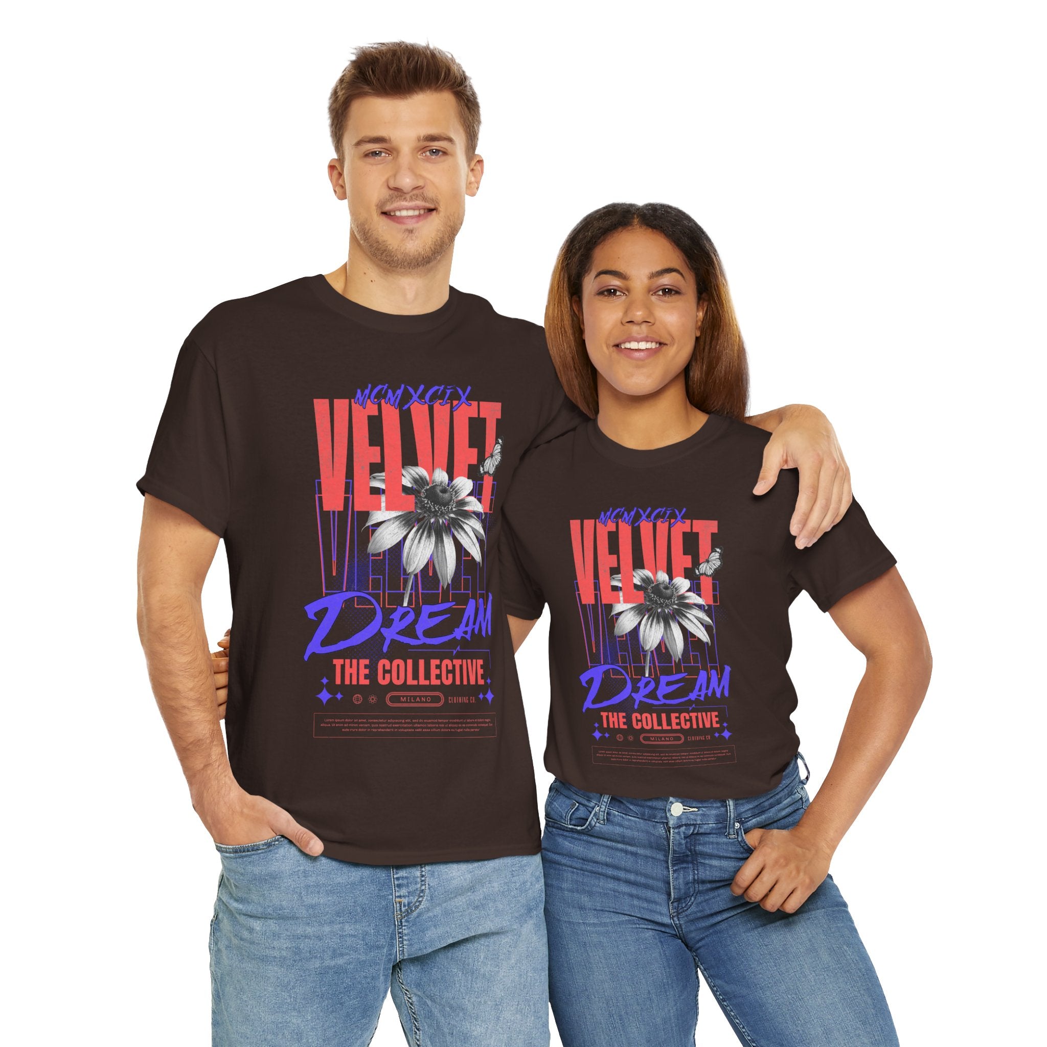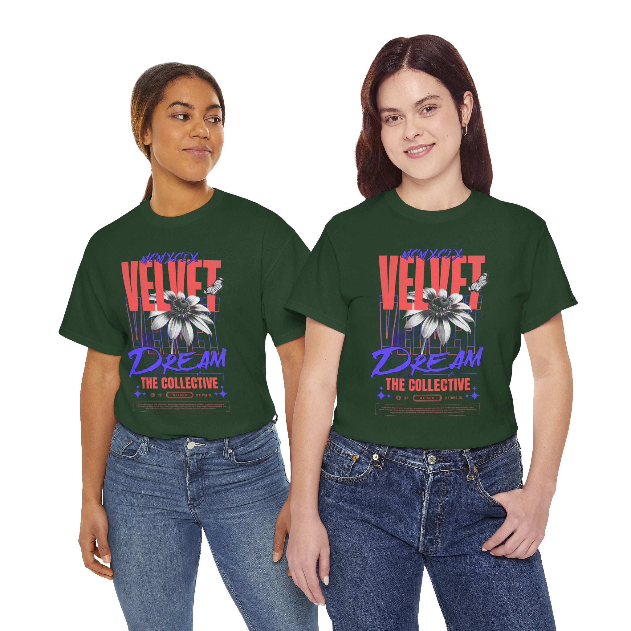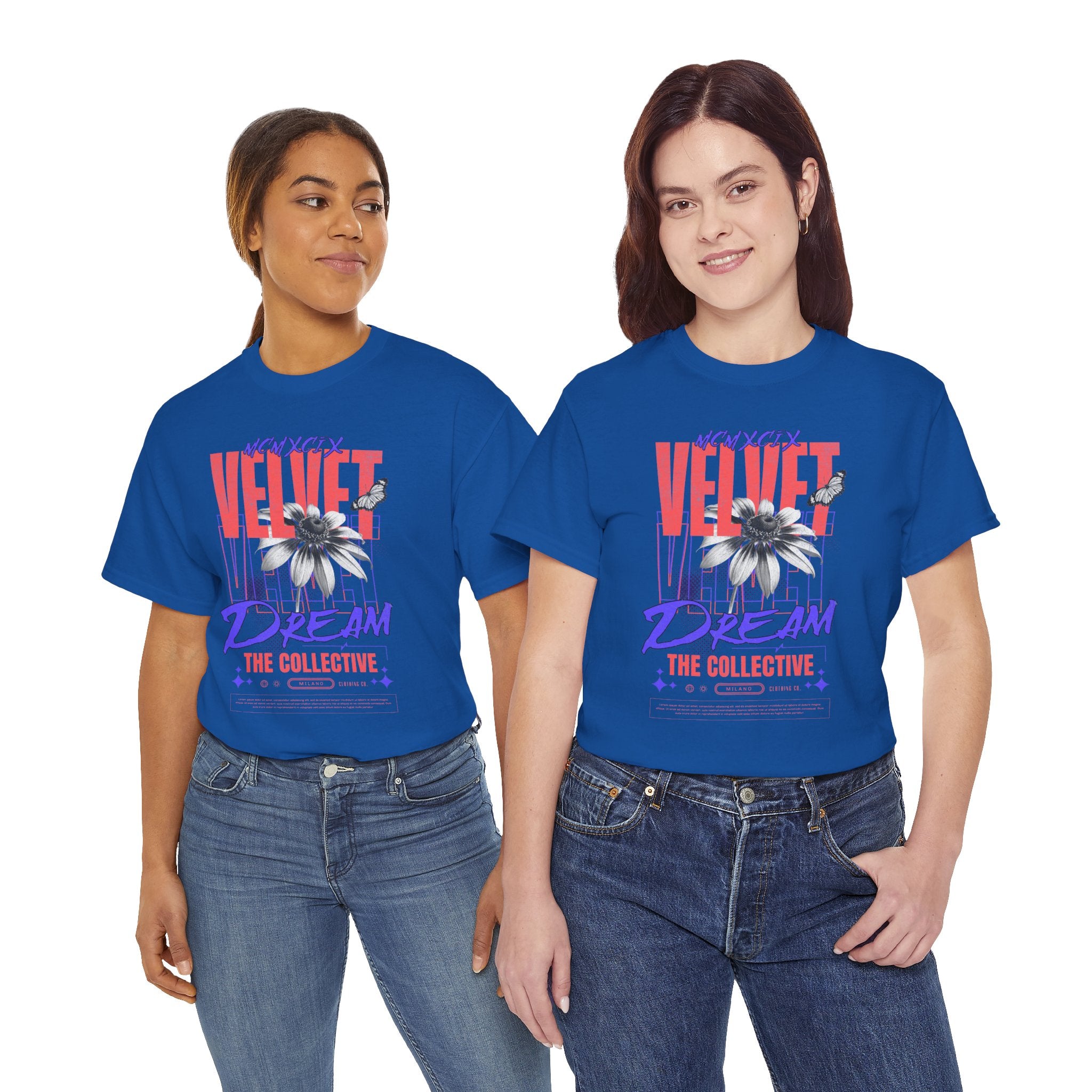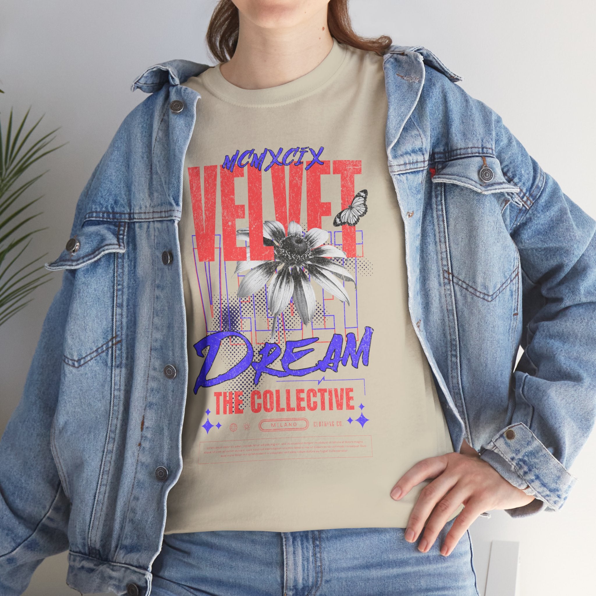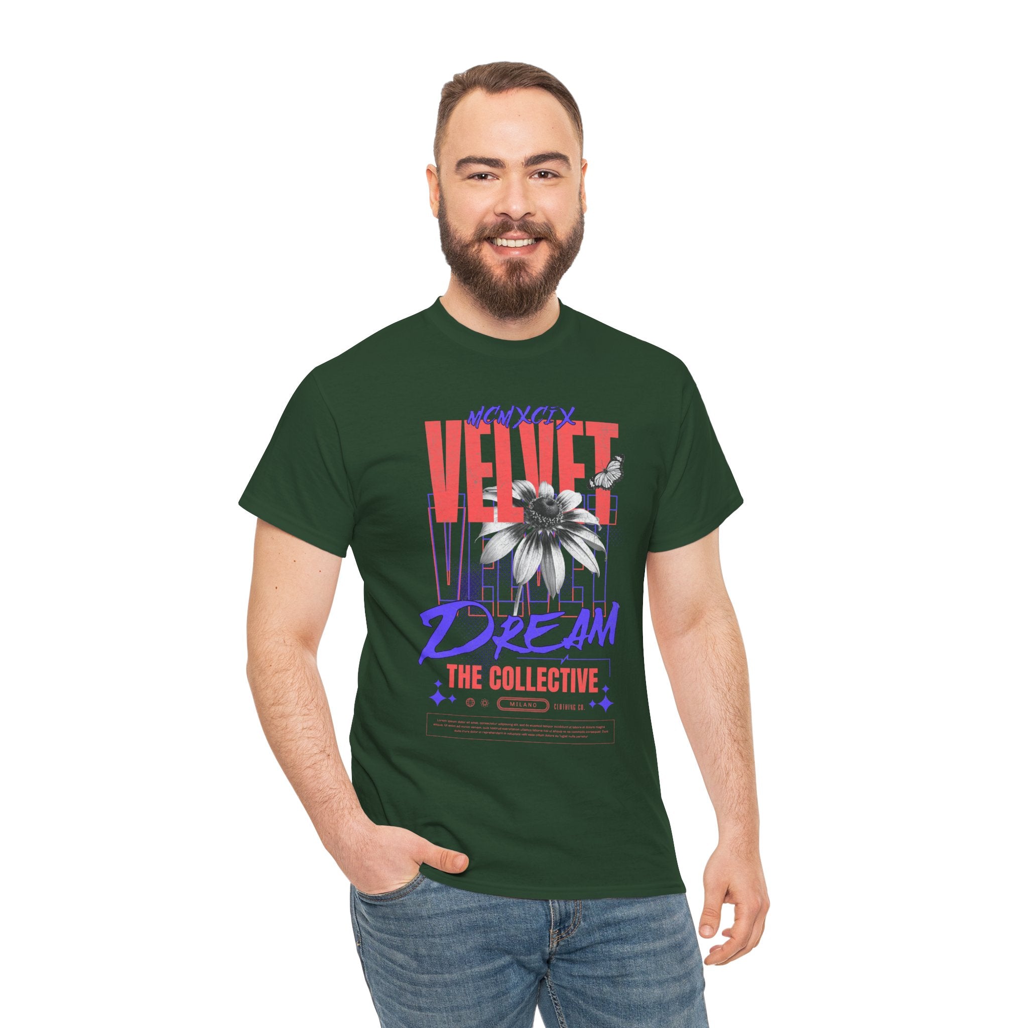 Step into the world of artistic expression with the Velvet Dream The Collective Unisex Heavy Cotton Tee. Featuring bold typography and a striking monochrome flower paired with vibrant red and purple accents, this design captures the spirit of creativity, individuality, and modern streetwear culture.