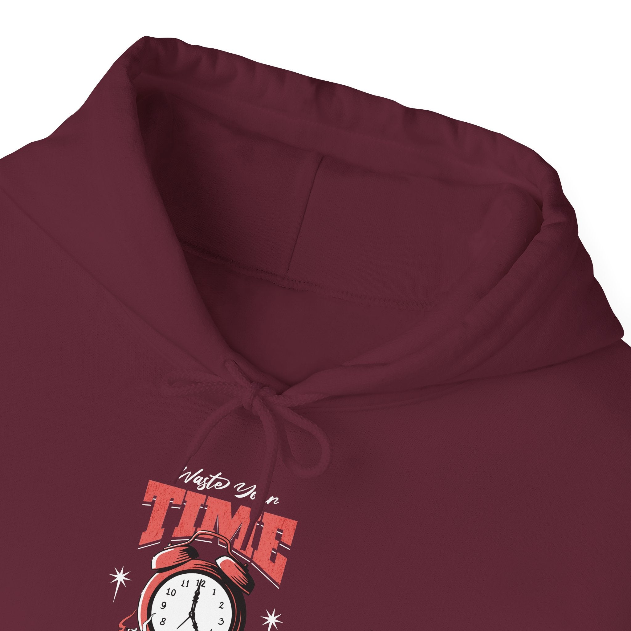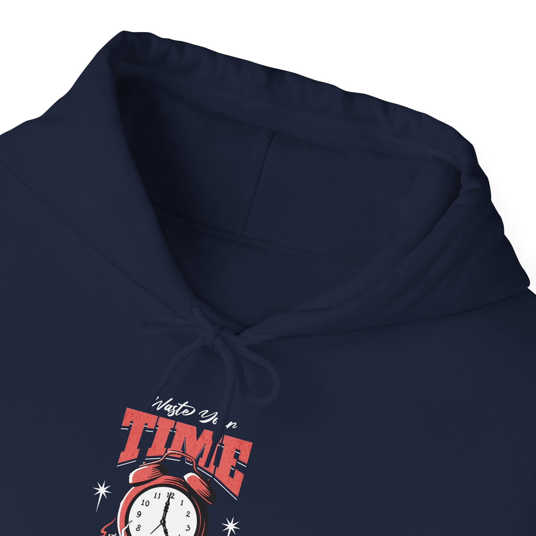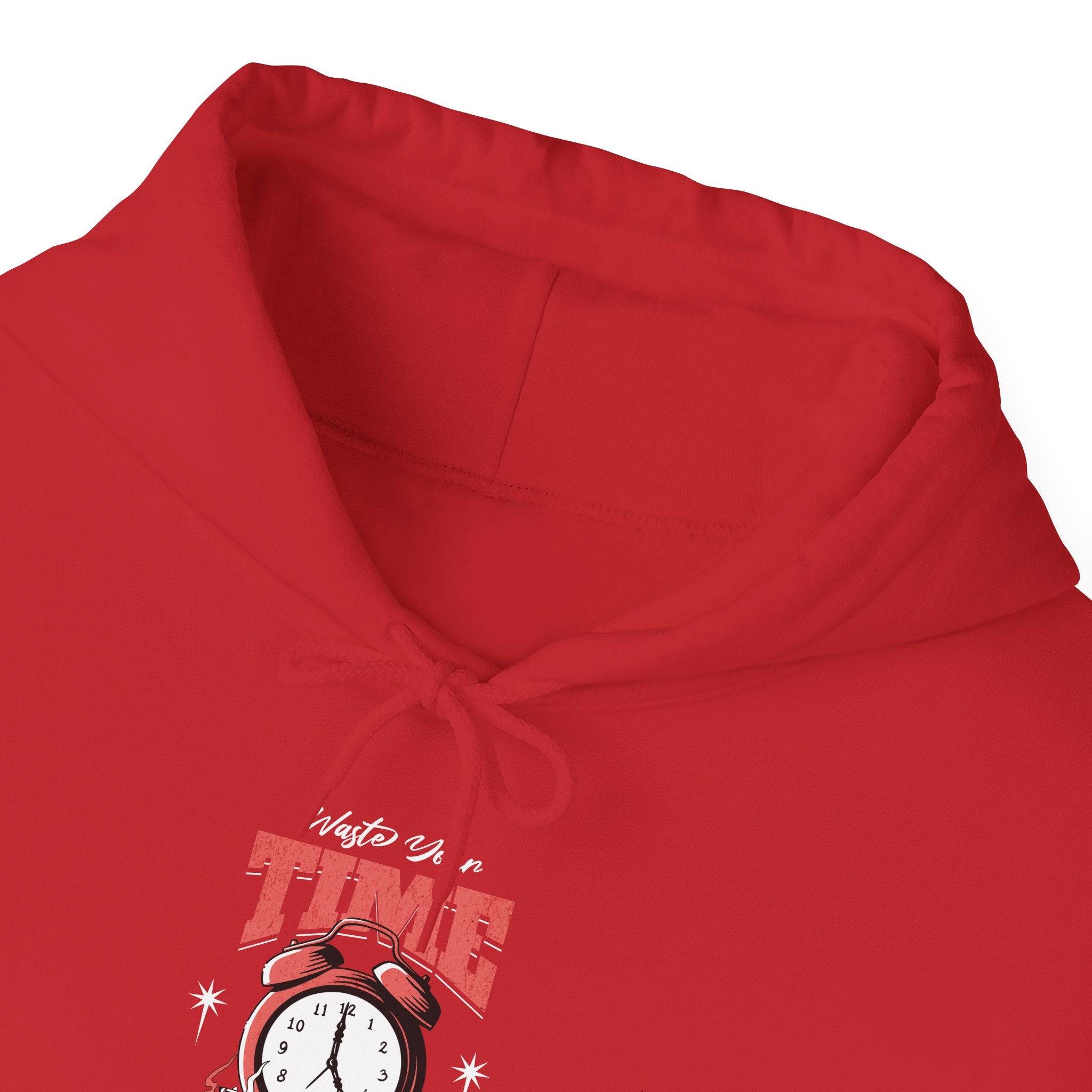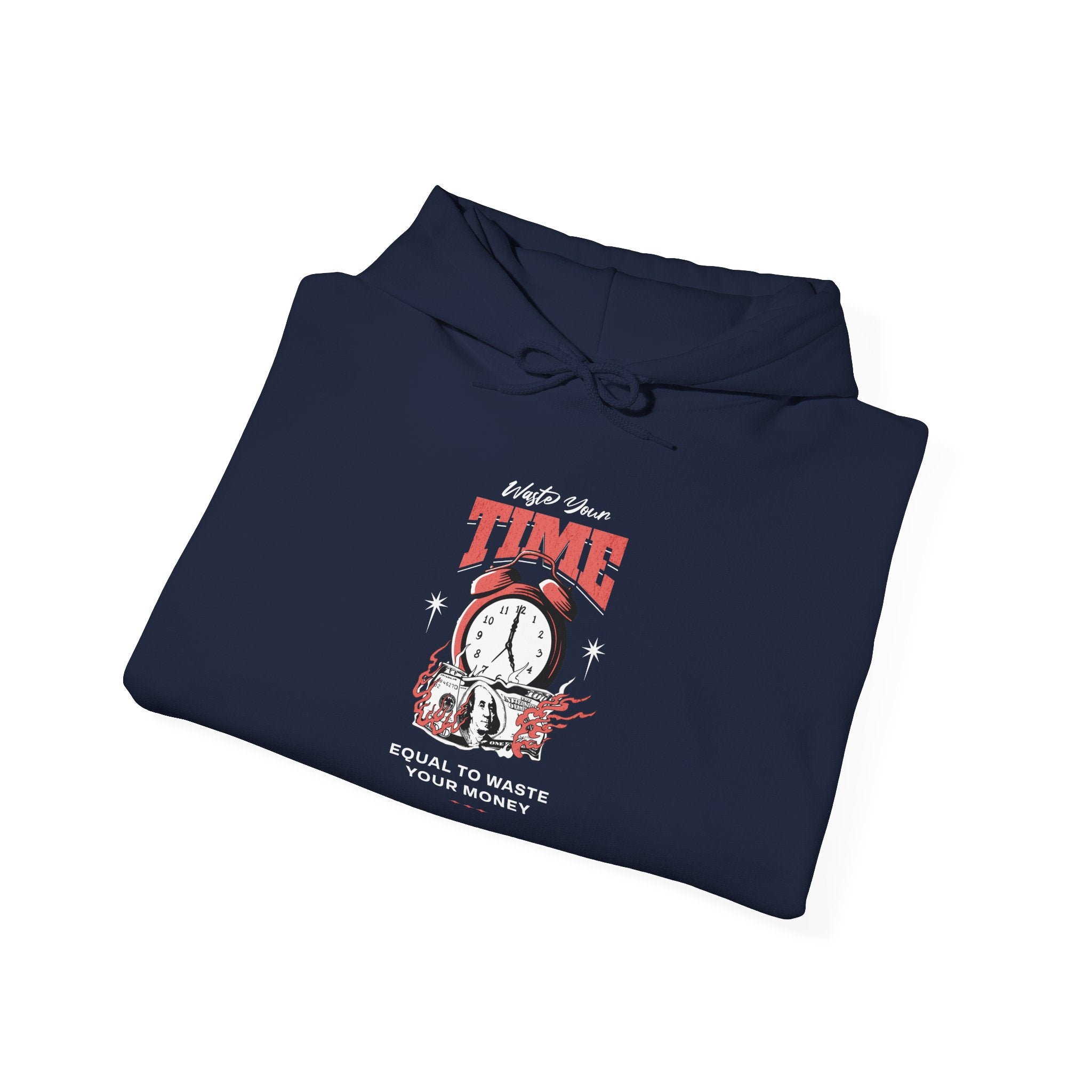 The Waste Your Time Unisex Heavy Blend™ Hooded Sweatshirt is built for grinders, hustlers, and achievers who know the true value of time. Featuring a bold red-and-white alarm clock graphic with burning dollar bills and motivational typography, this hoodie is a wearable reminder that every wasted minute costs more than money.