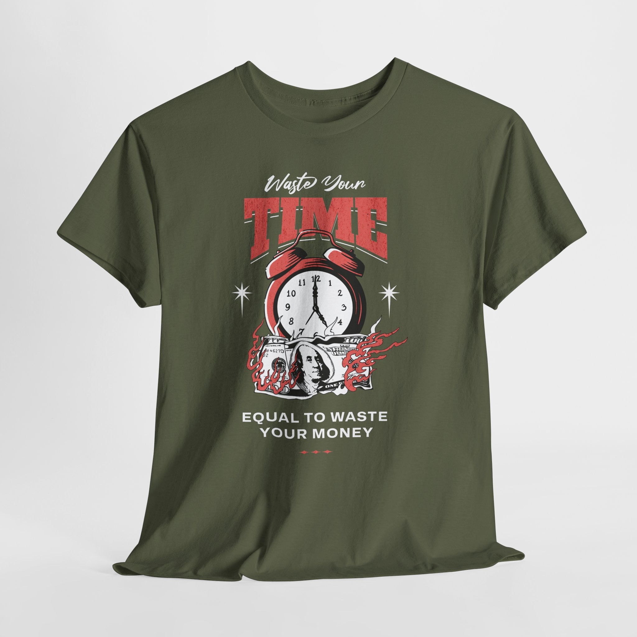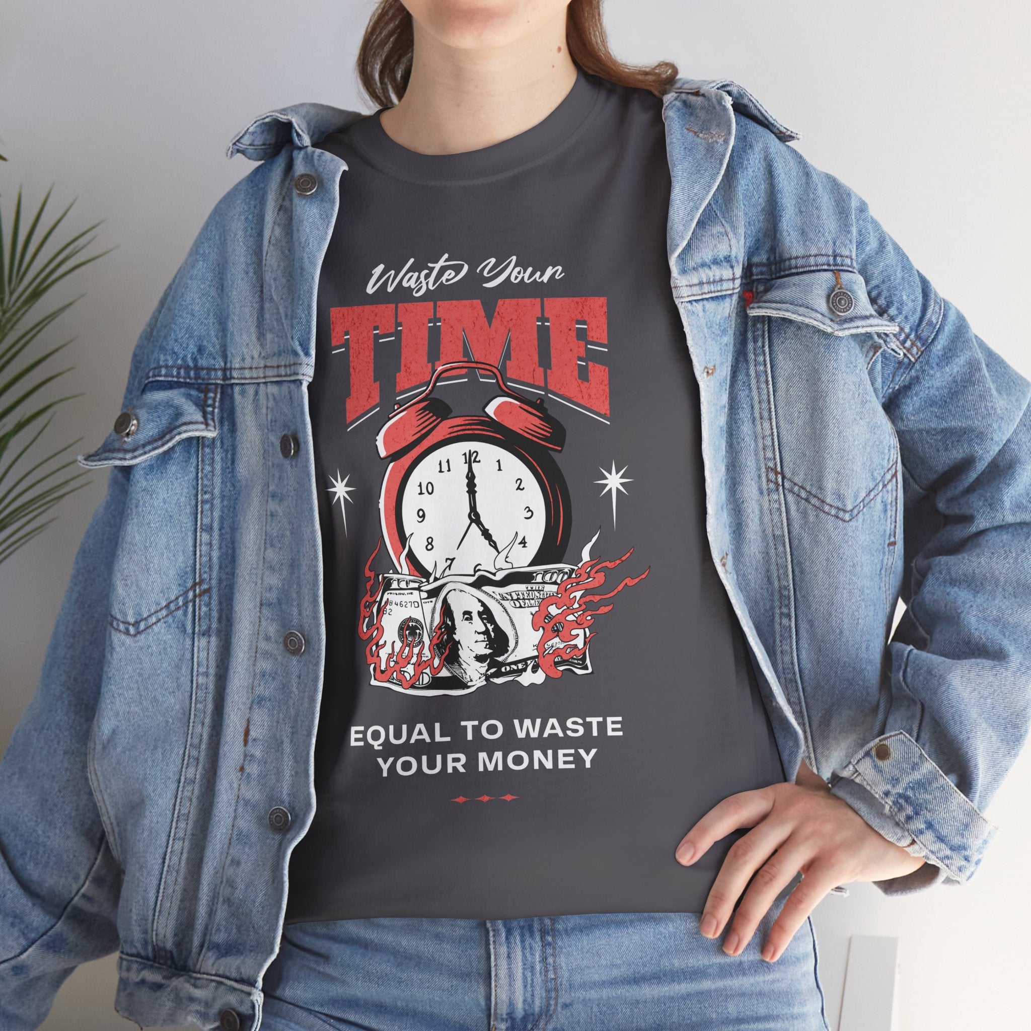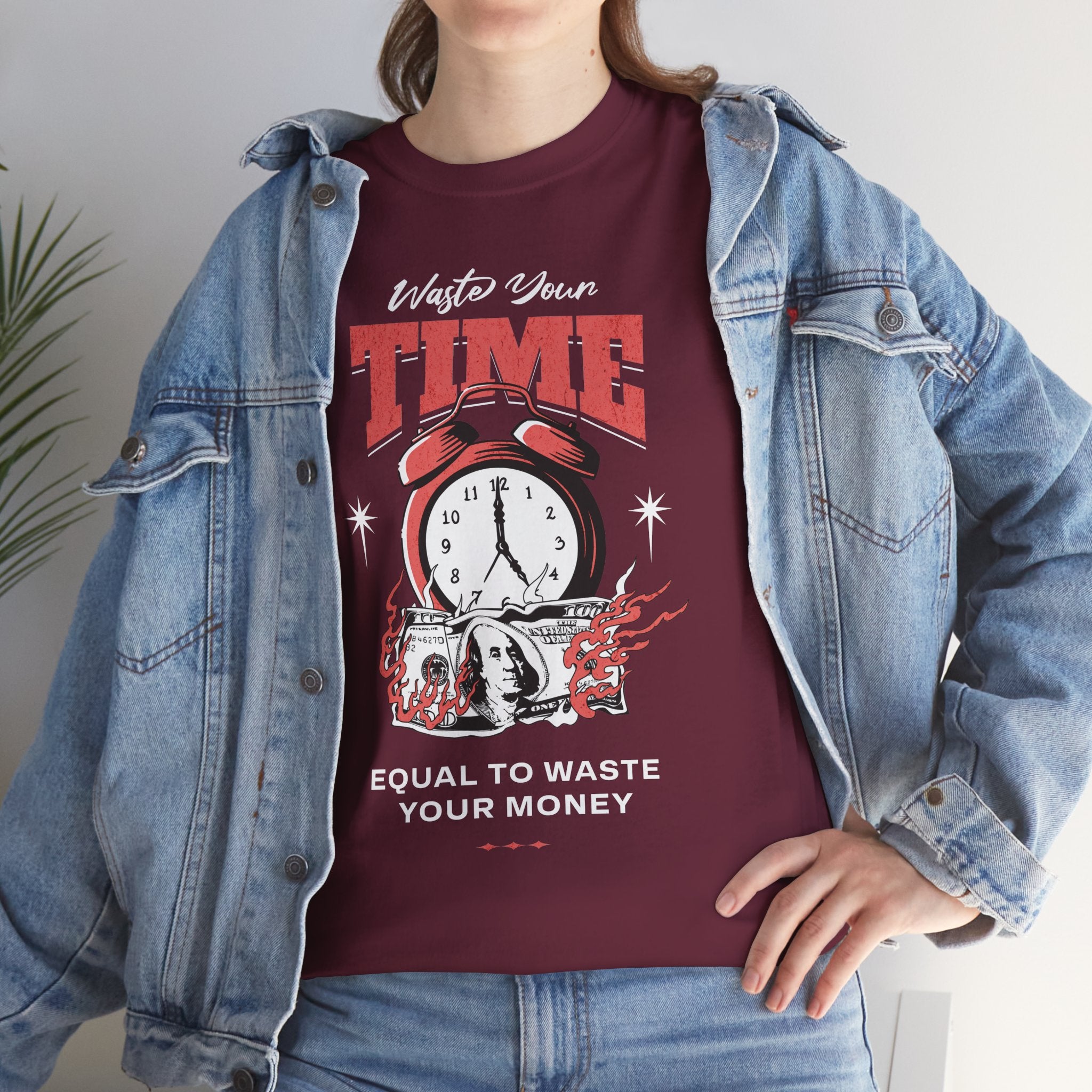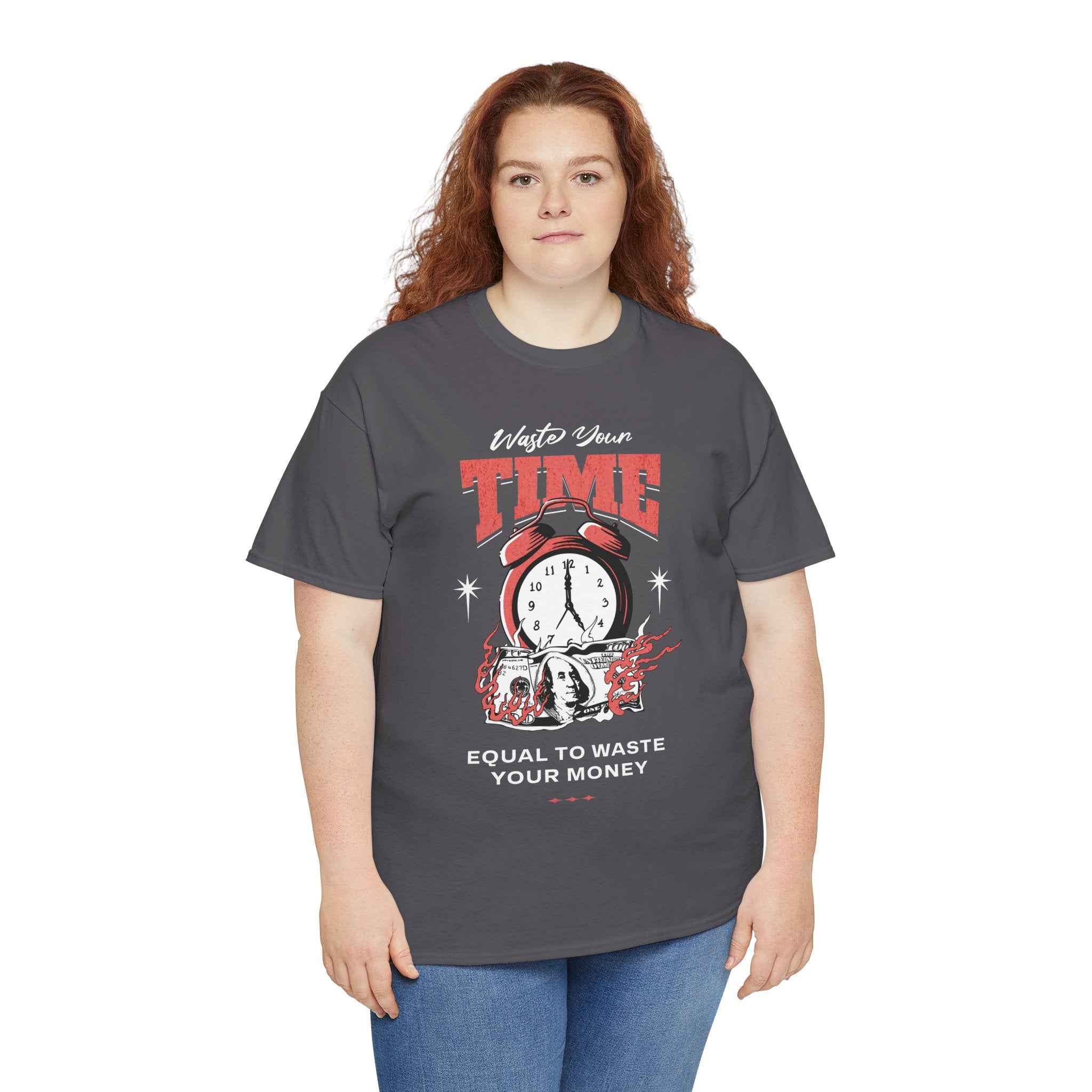 The Waste Your Time Unisex Heavy Cotton Tee is more than a shirt β itβs a daily reminder to value your time and invest in your hustle. Featuring a bold red-and-white retro alarm clock with burning dollar bills graphic and motivational typography, this tee delivers a message of discipline, productivity, and financial awareness.