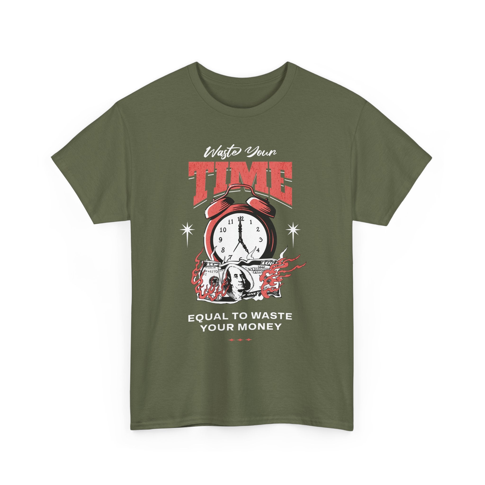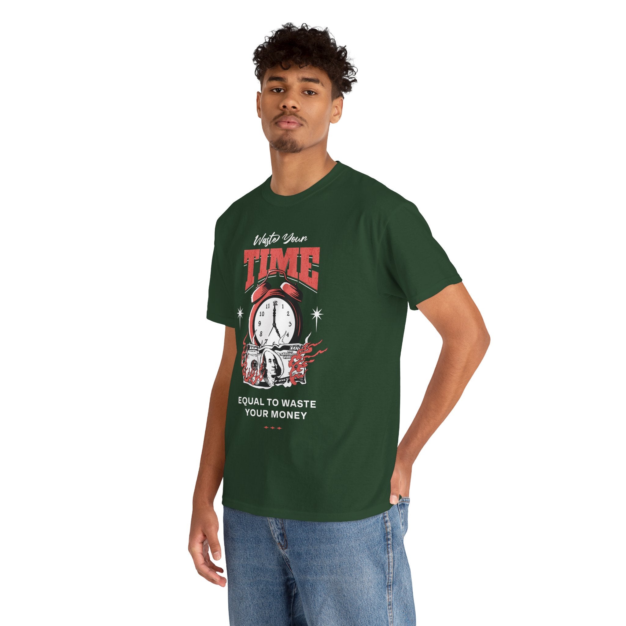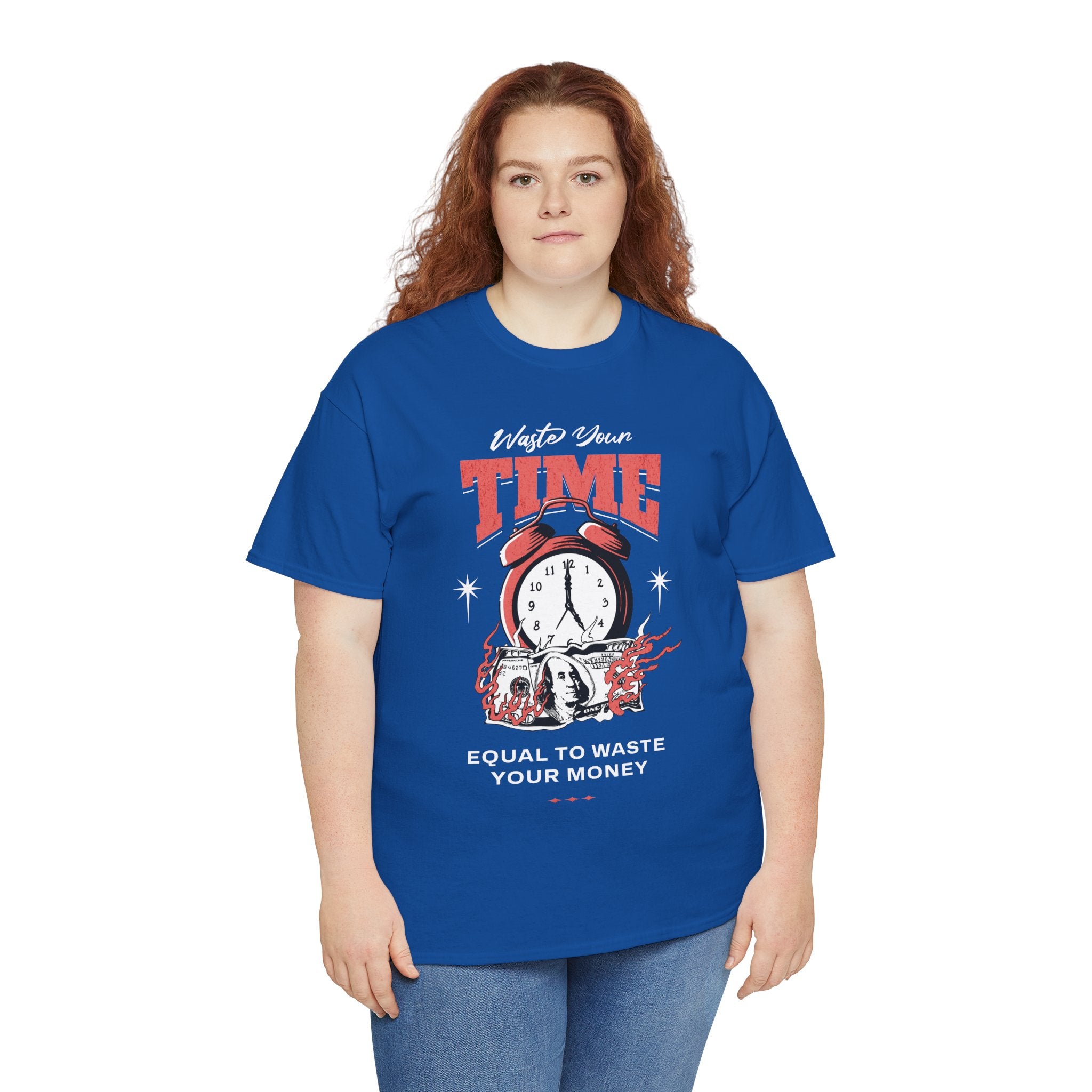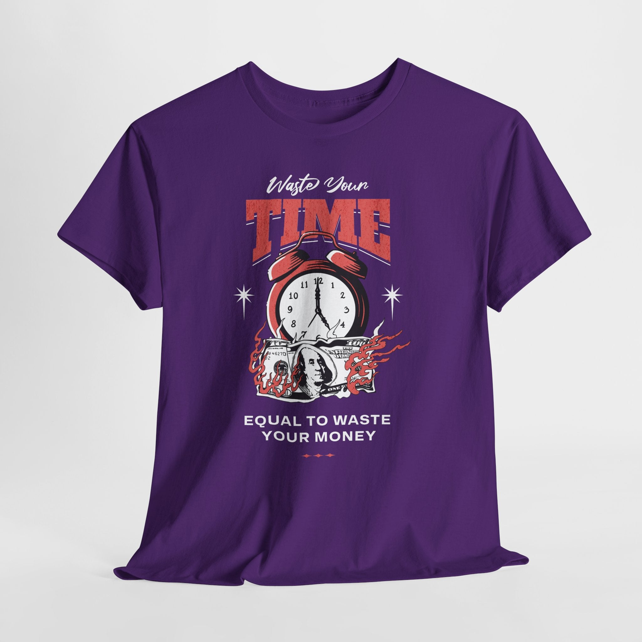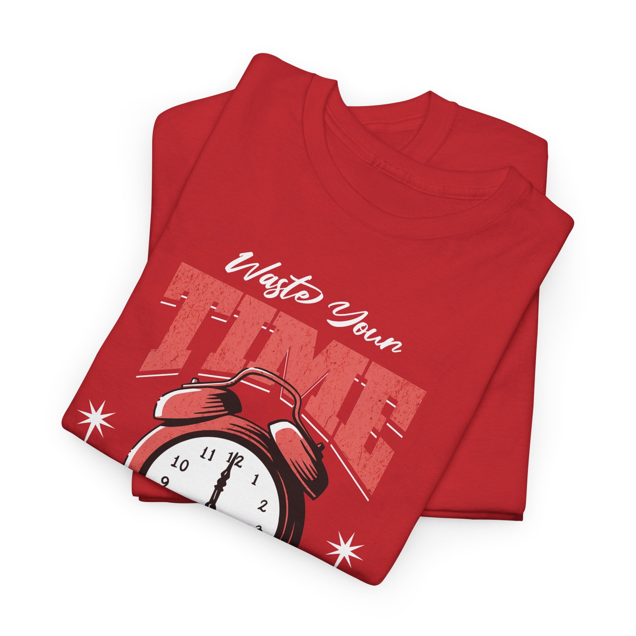 The Waste Your Time Unisex Heavy Cotton Tee is more than a shirt β itβs a daily reminder to value your time and invest in your hustle. Featuring a bold red-and-white retro alarm clock with burning dollar bills graphic and motivational typography, this tee delivers a message of discipline, productivity, and financial awareness.