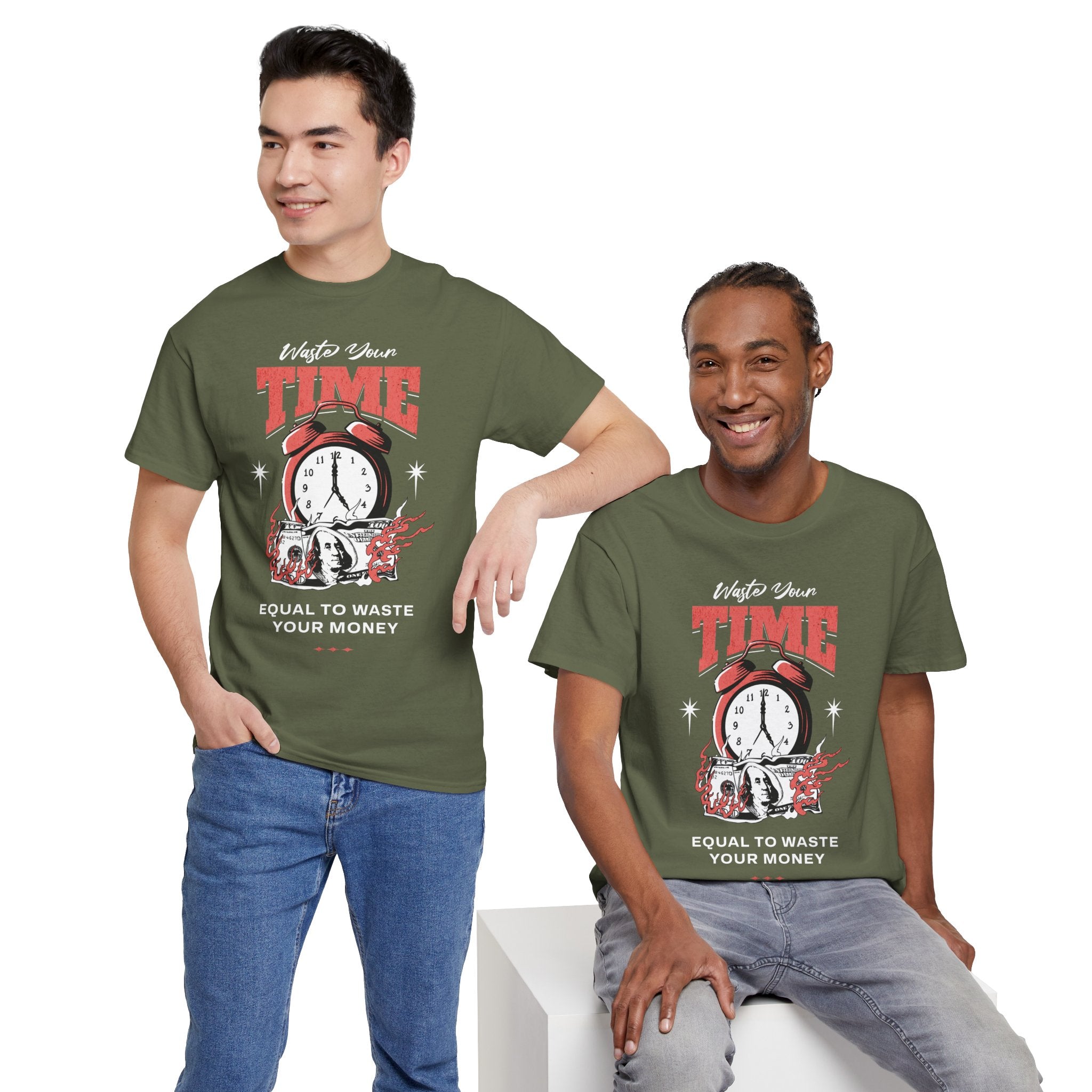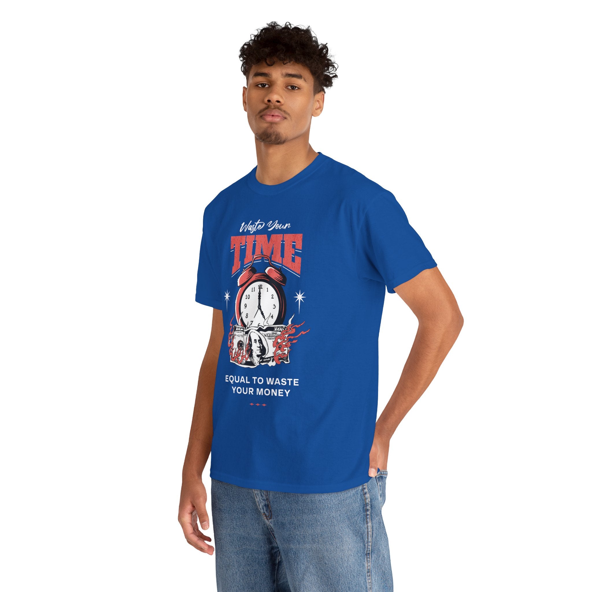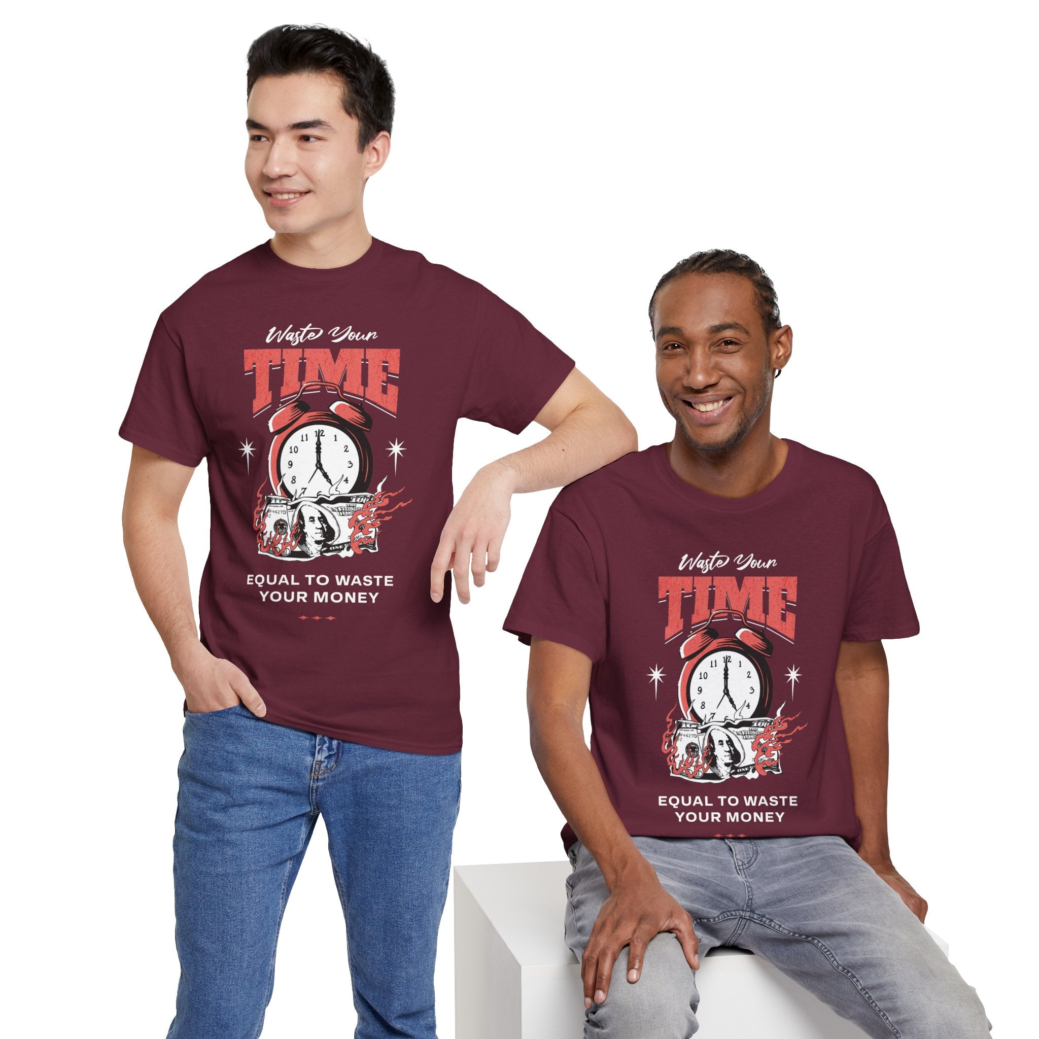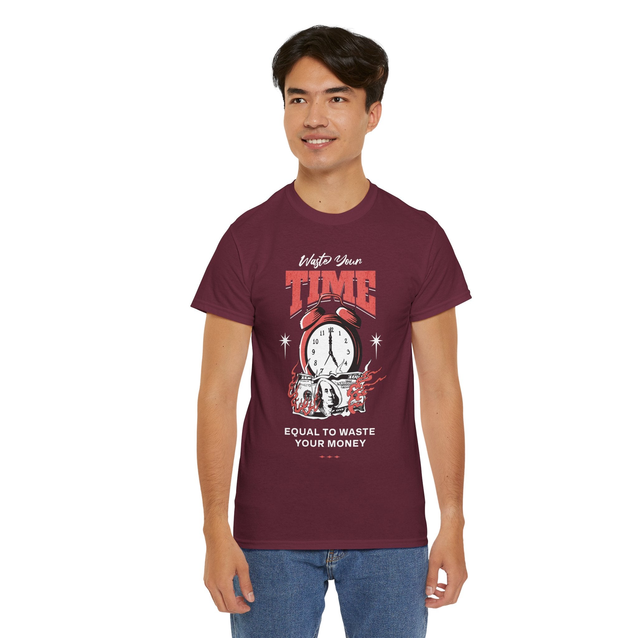 The Waste Your Time Unisex Heavy Cotton Tee is more than a shirt β itβs a daily reminder to value your time and invest in your hustle. Featuring a bold red-and-white retro alarm clock with burning dollar bills graphic and motivational typography, this tee delivers a message of discipline, productivity, and financial awareness.