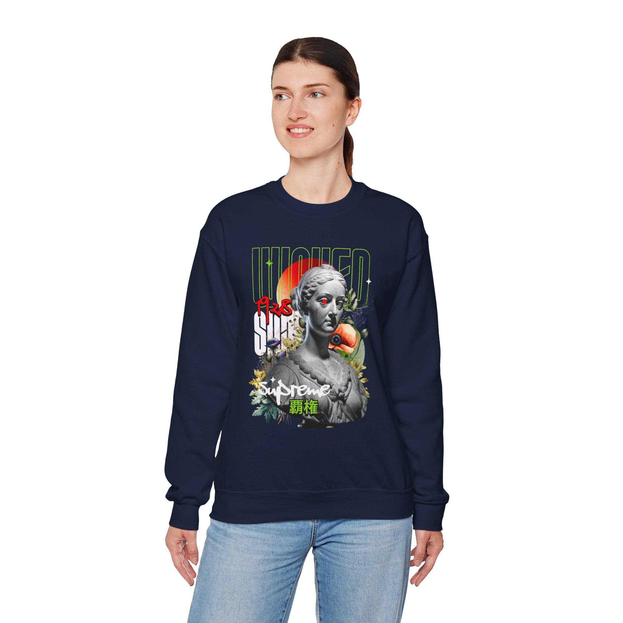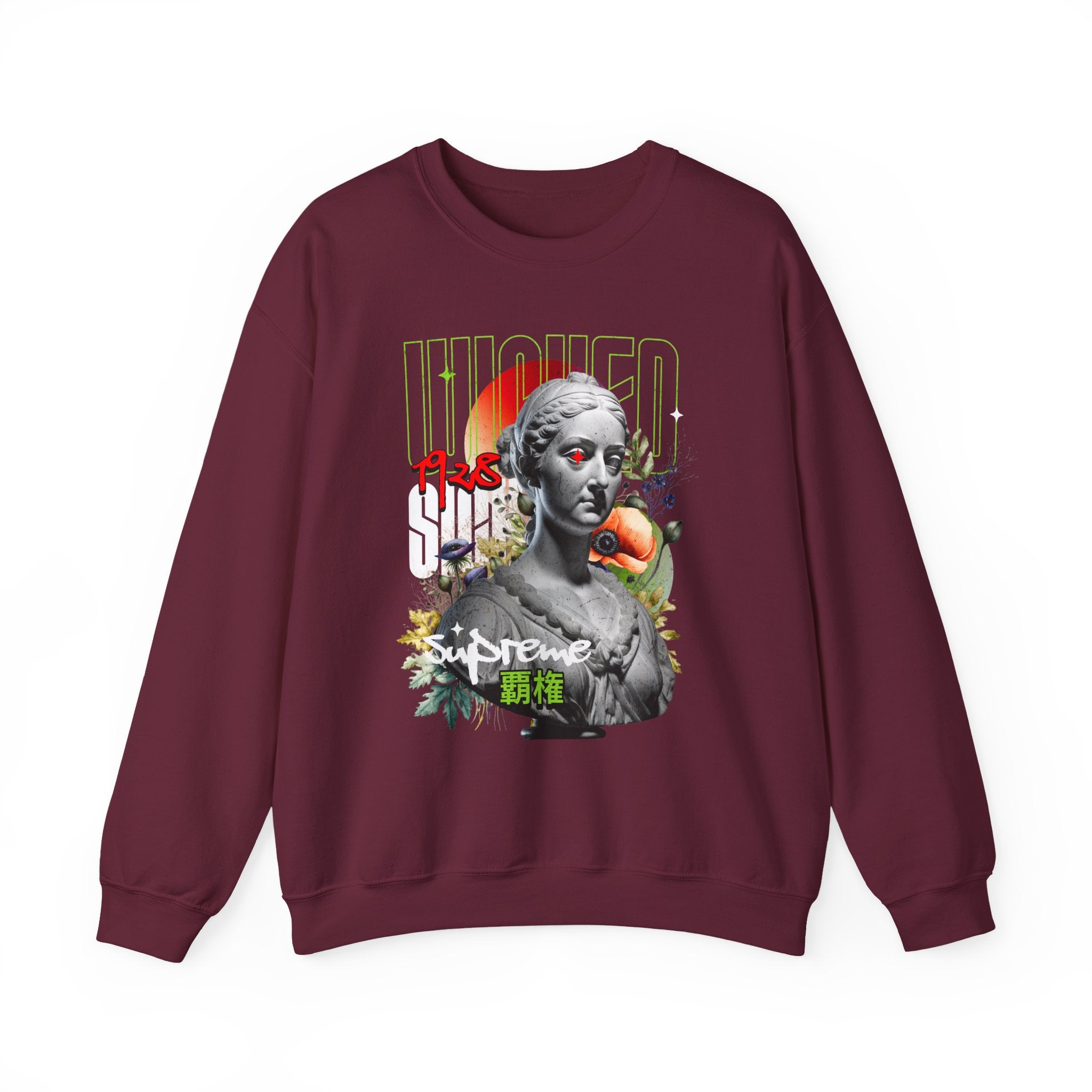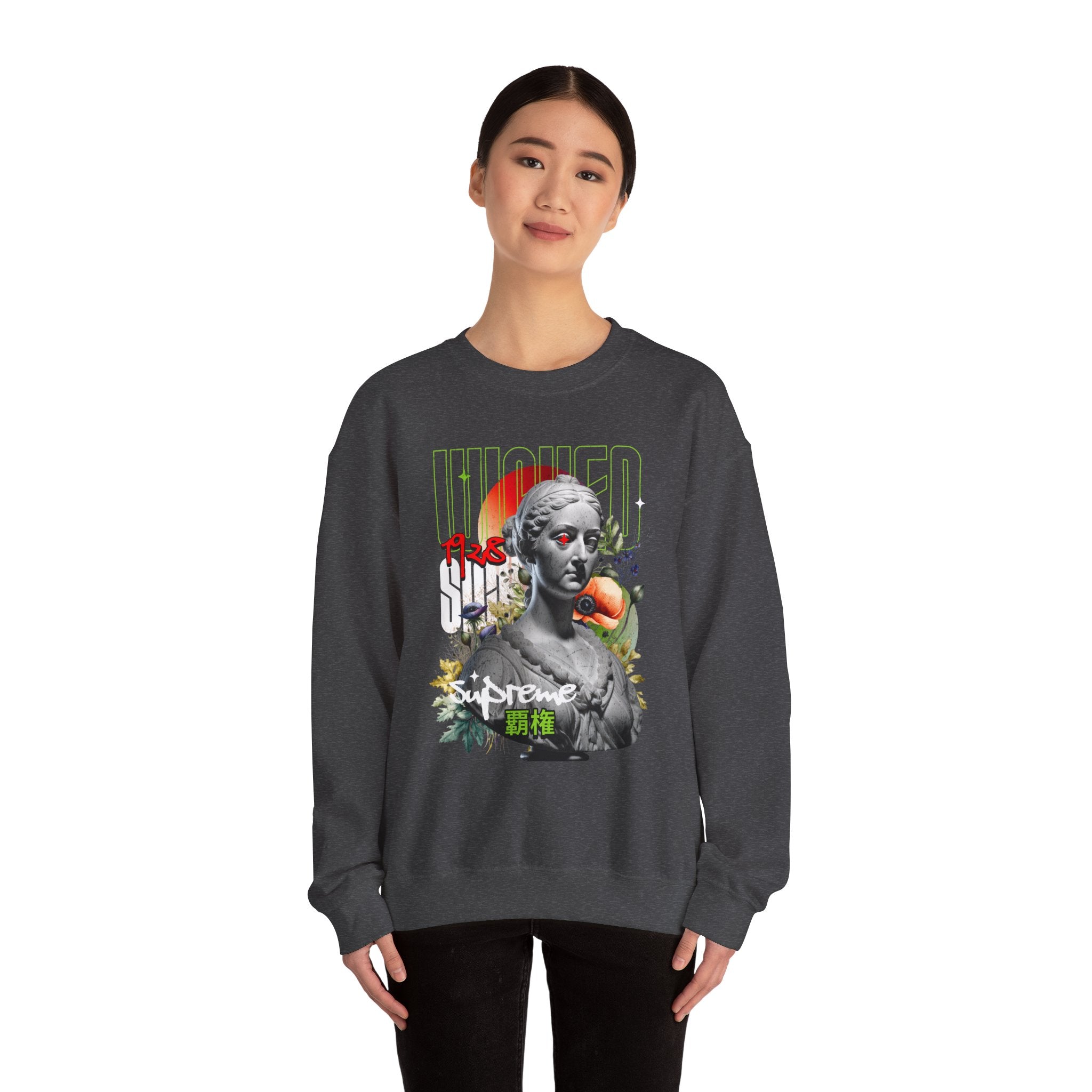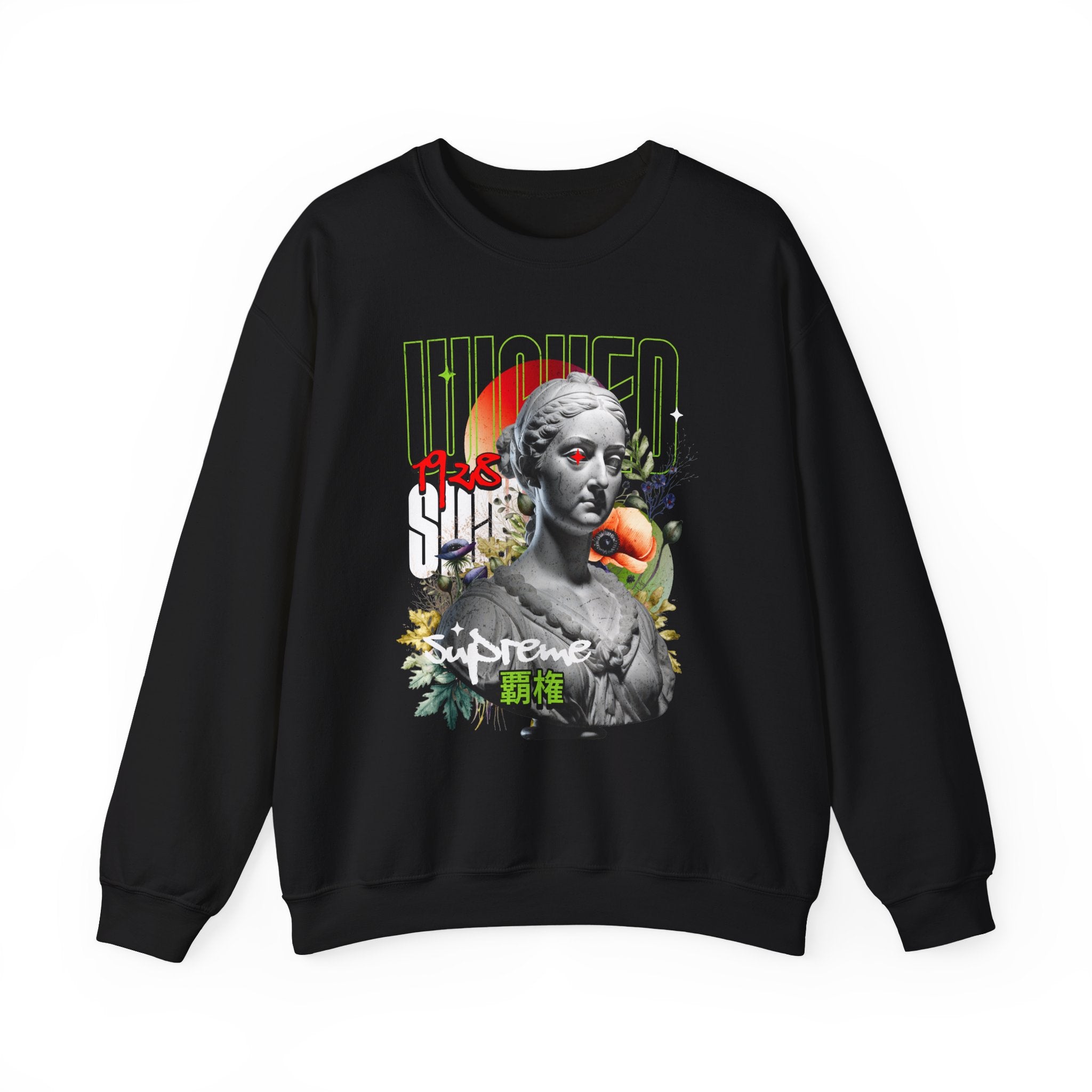 The Wicked Supreme Unisex Heavy Blend™ Crewneck Sweatshirt delivers warmth, durability, and a bold visual edge. Its statue bust graphic combined with vivid typography and floral accents makes it a timeless blend of classic art and modern streetwear.