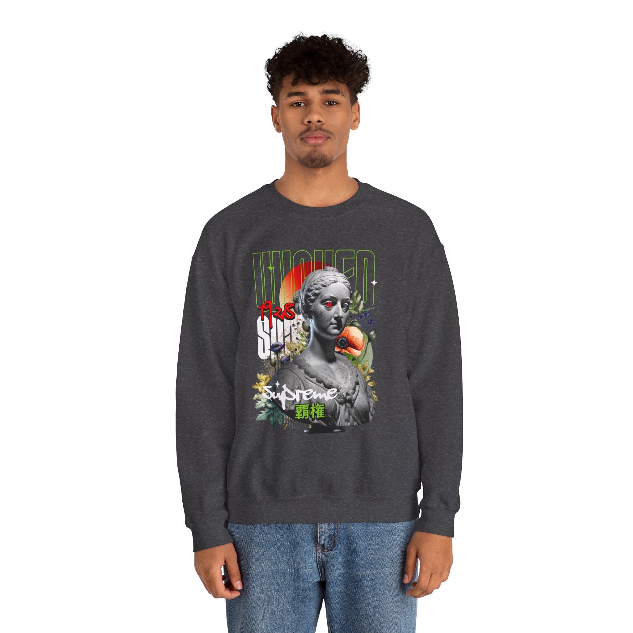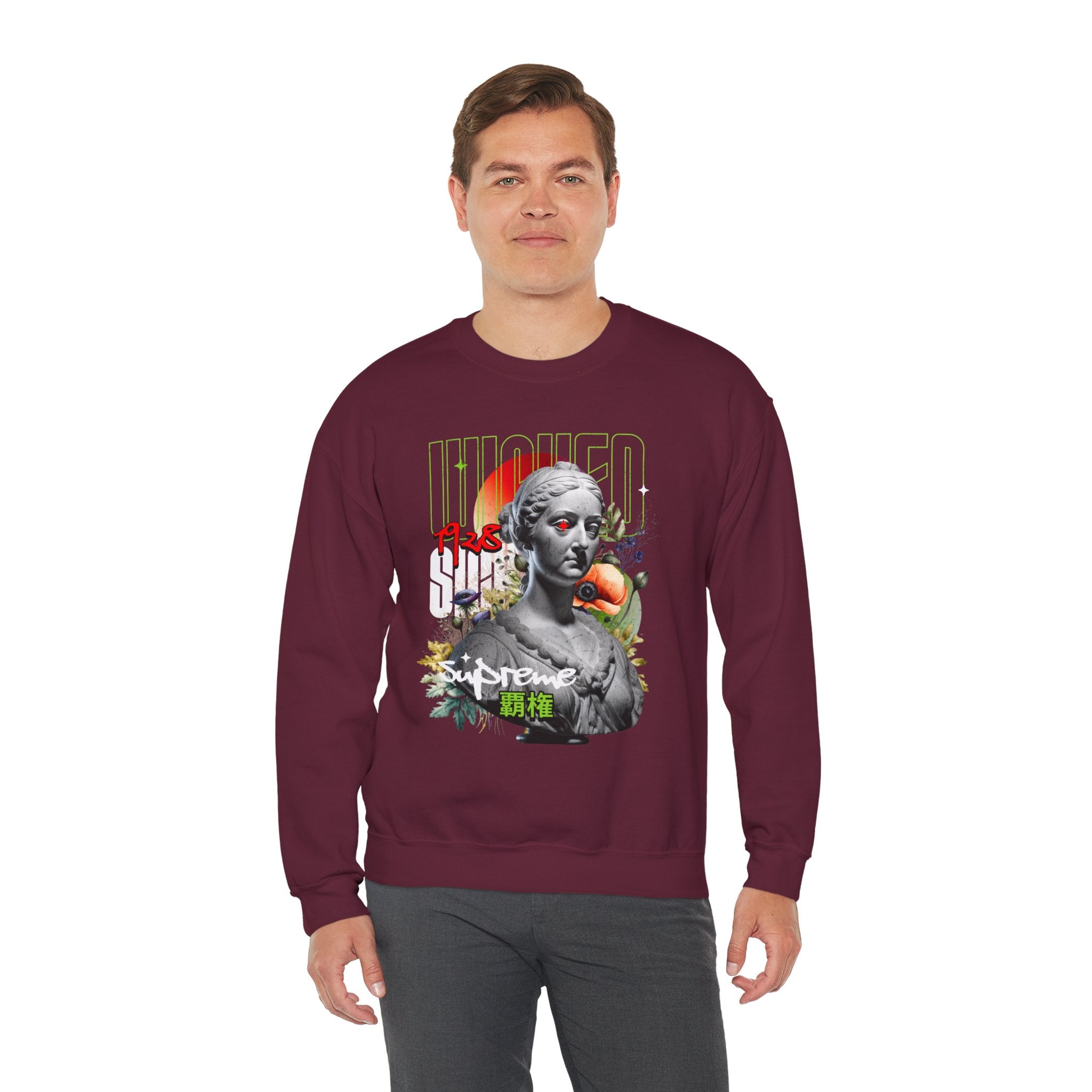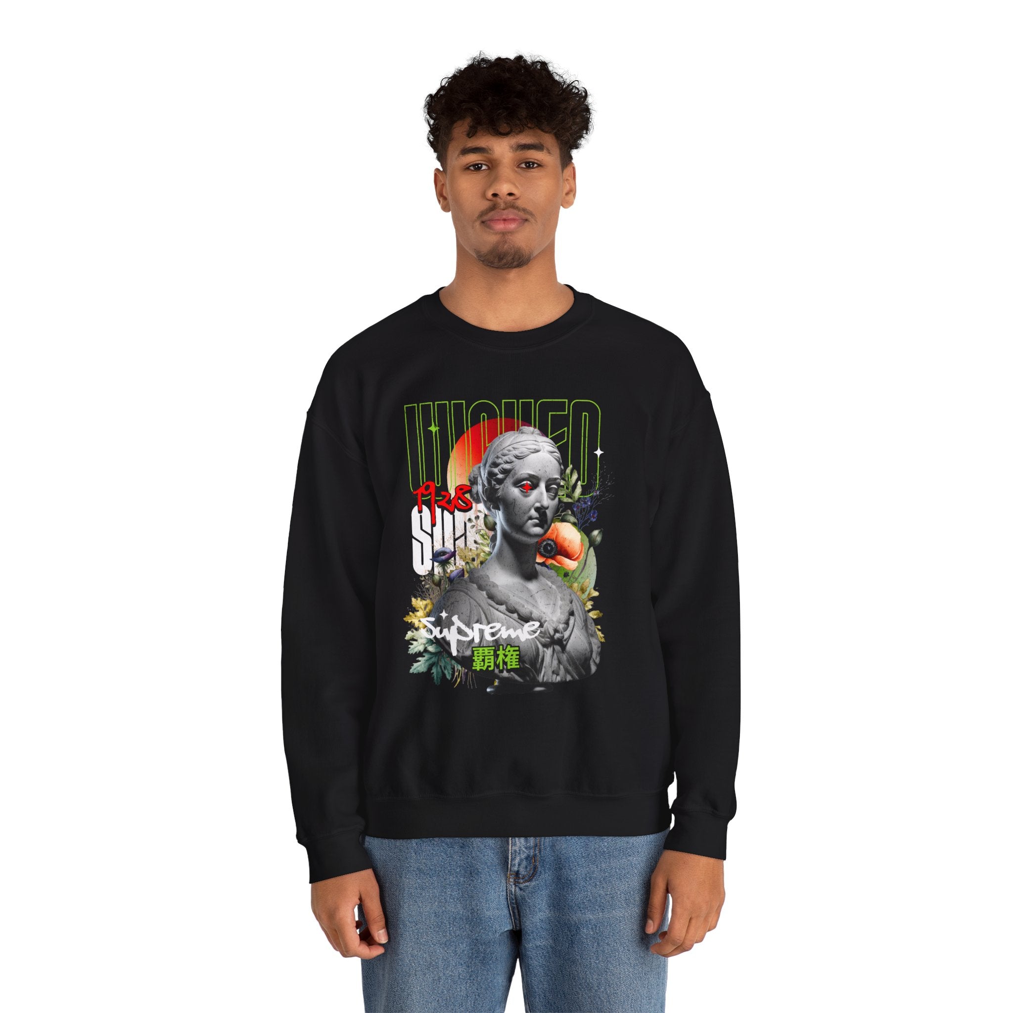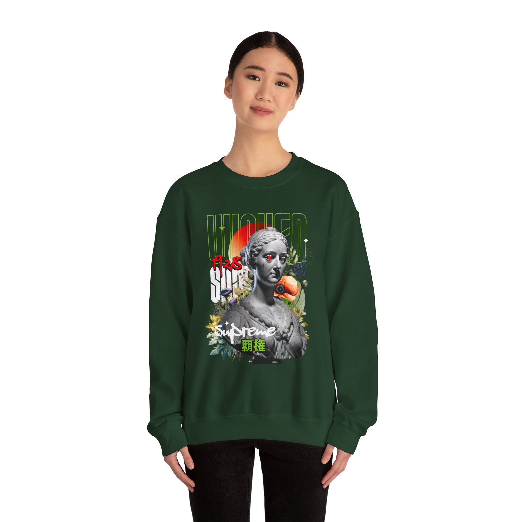 The Wicked Supreme Unisex Heavy Blend™ Crewneck Sweatshirt delivers warmth, durability, and a bold visual edge. Its statue bust graphic combined with vivid typography and floral accents makes it a timeless blend of classic art and modern streetwear.